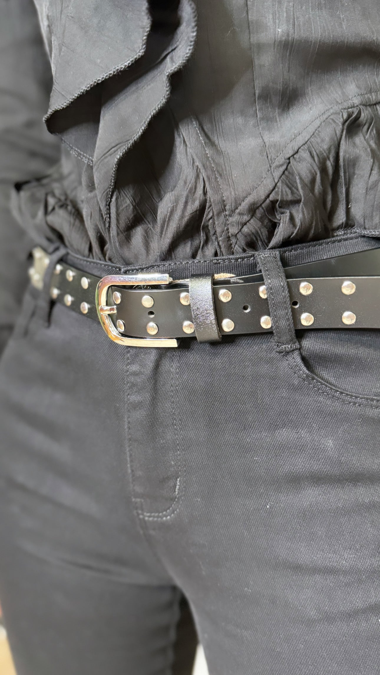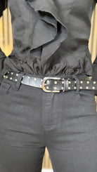 Add some edgy flair to your outfit with the Daire Black Silver Stud Belt! This stylish belt features silver studs that add a touch of attitude to any look. With this belt, you'll stand out from the crowd and look effortlessly cool. 🤘🖤
