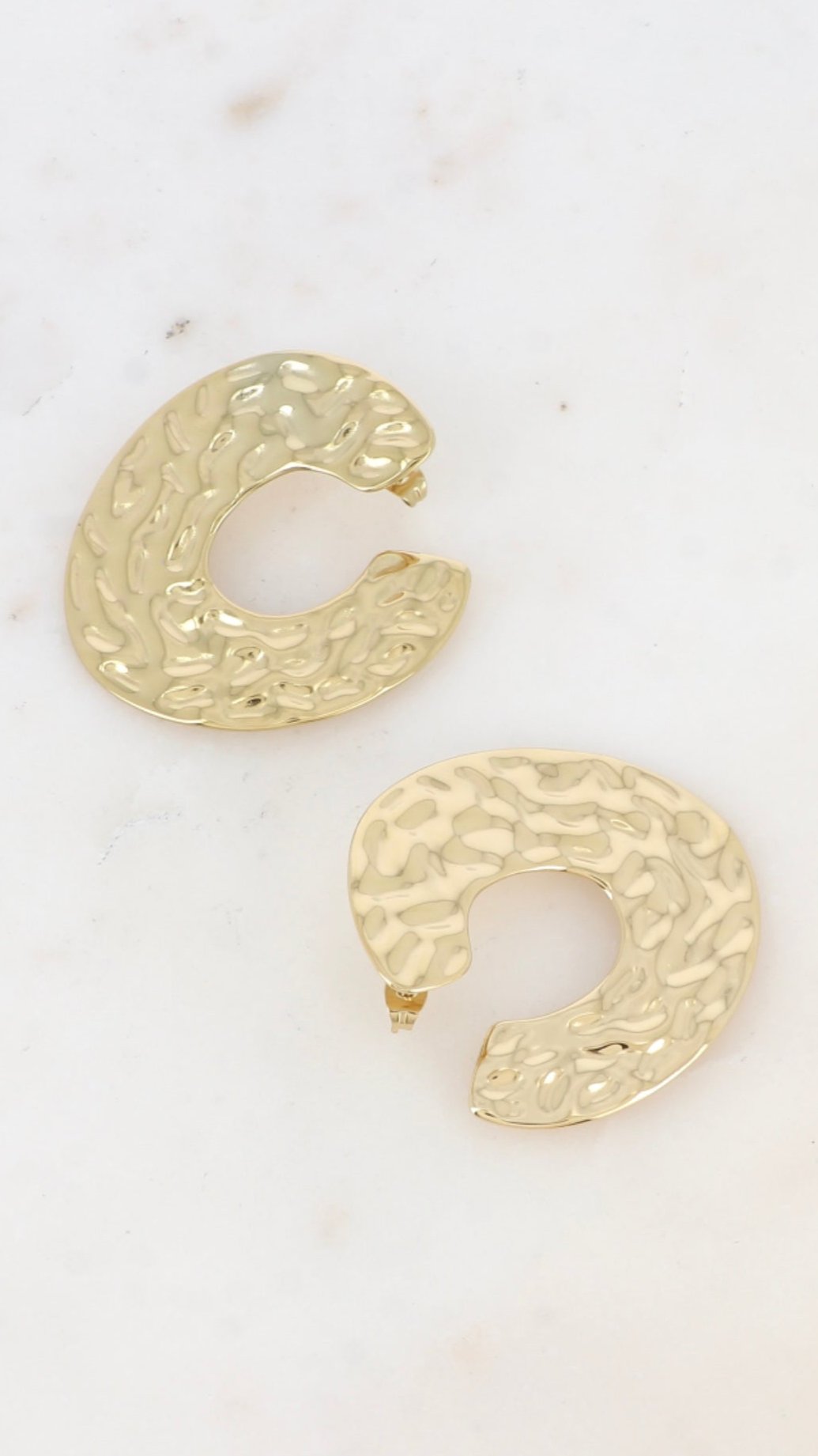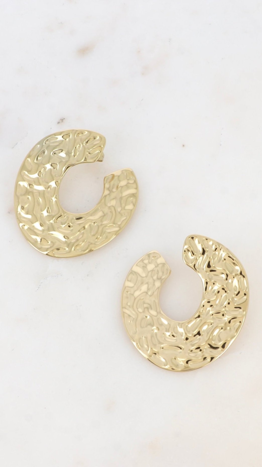 Inject some personality into your wardrobe with Elena Curved Hoop Earrings! These stainless steel stud earrings sport a unique curved, hammered, wide and flat ring design (🤩) that will definitely make you the coolest kid on the block (😎)! Versatile and effortlessly chic, these earrings are a must-have for any fashionista! Made of stainless steel with a curved, hammered, wide and flat ring. Guaranteed free of nickel, cadmium, and lead salts.