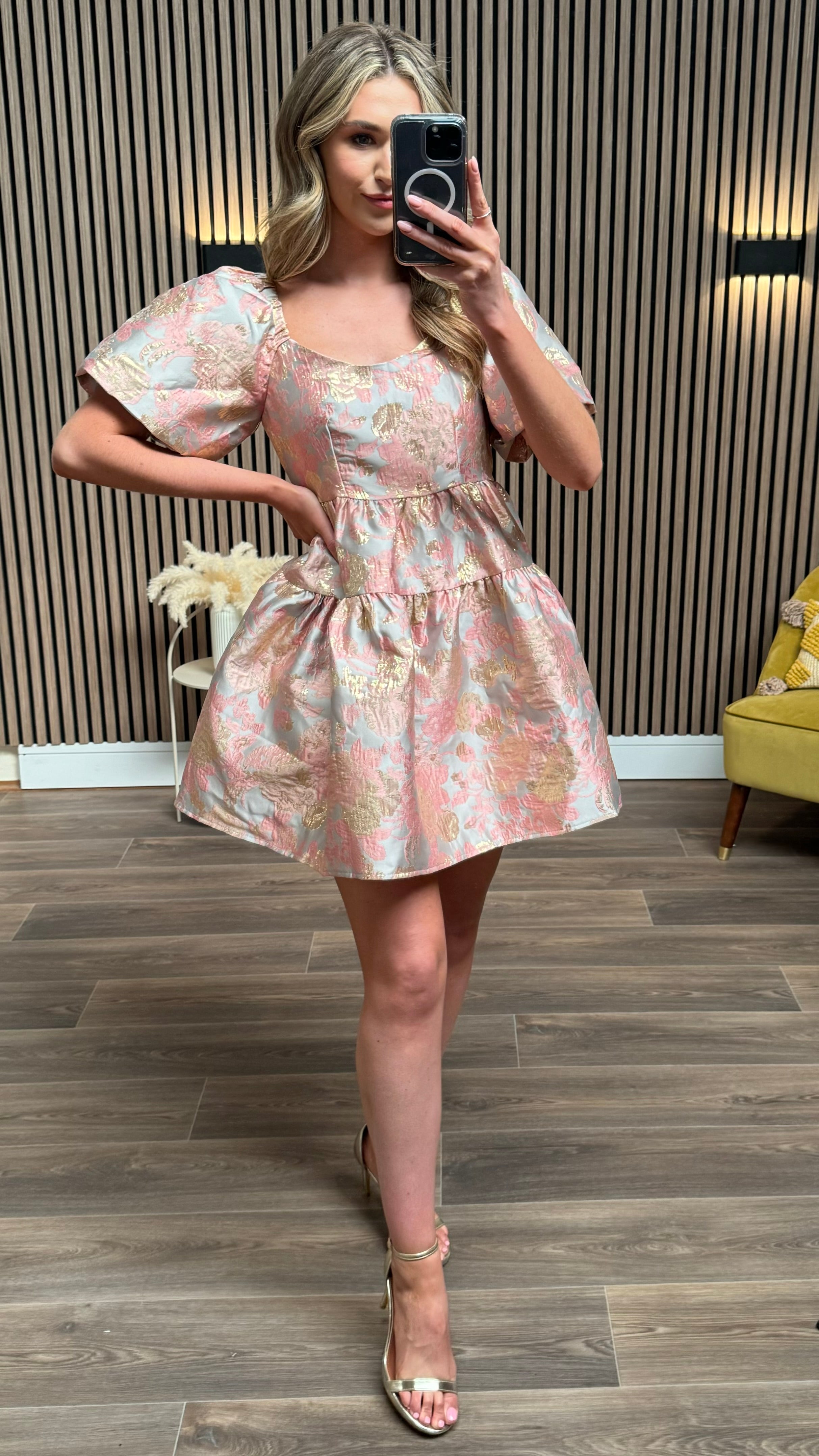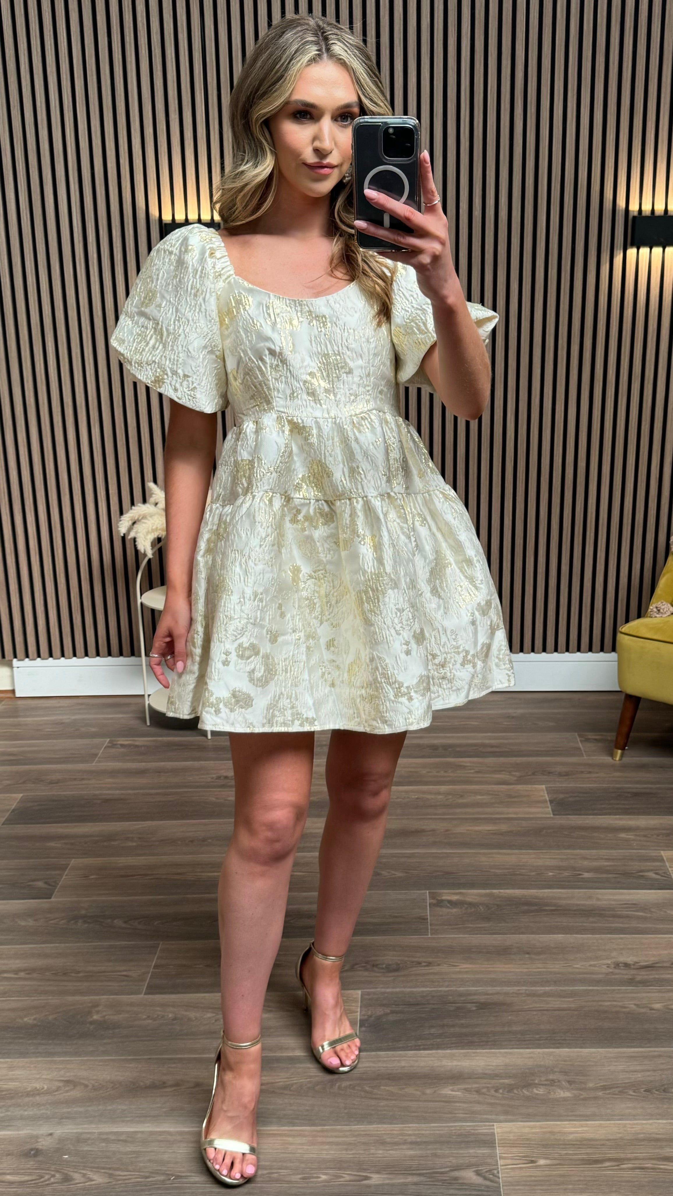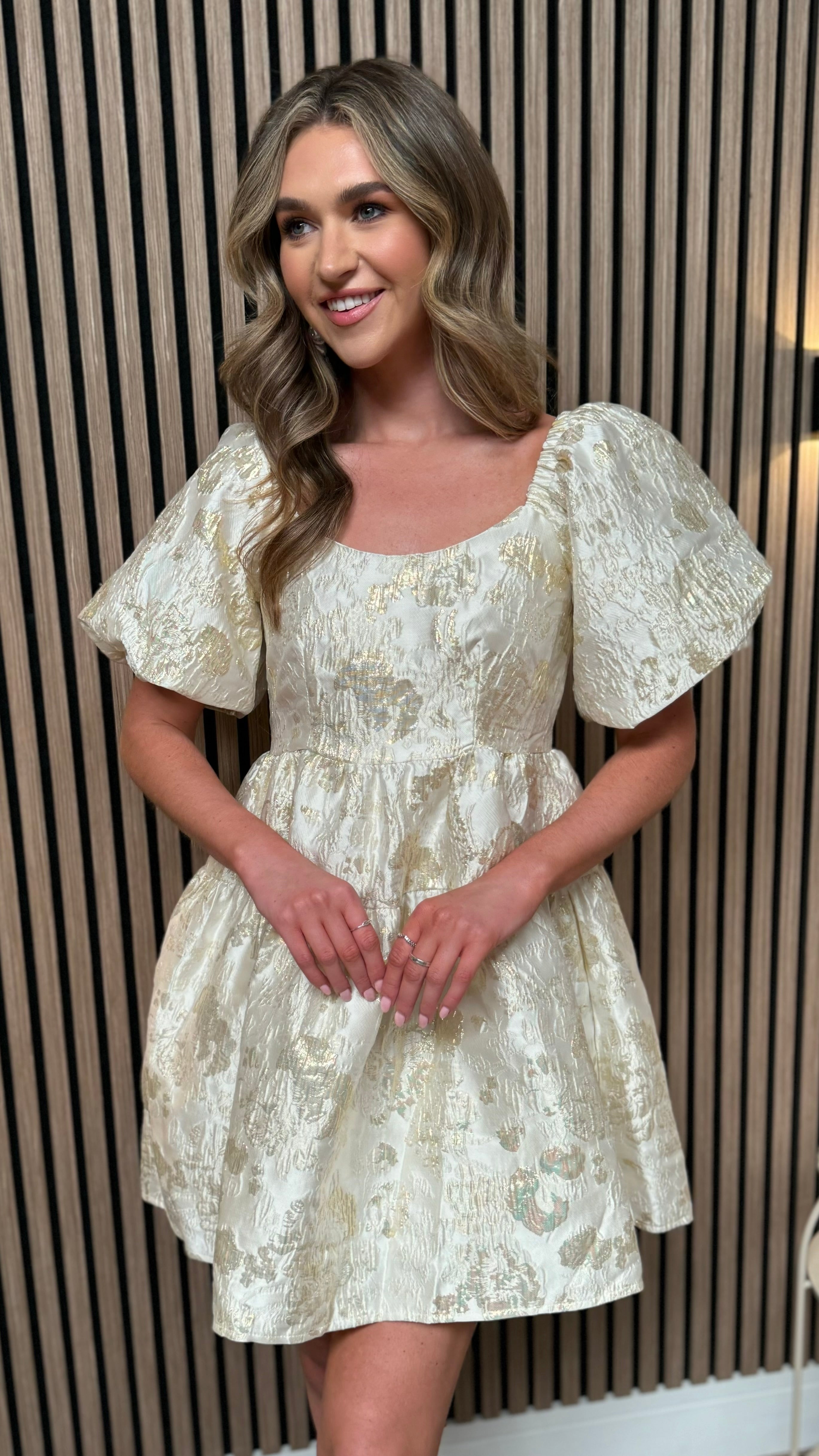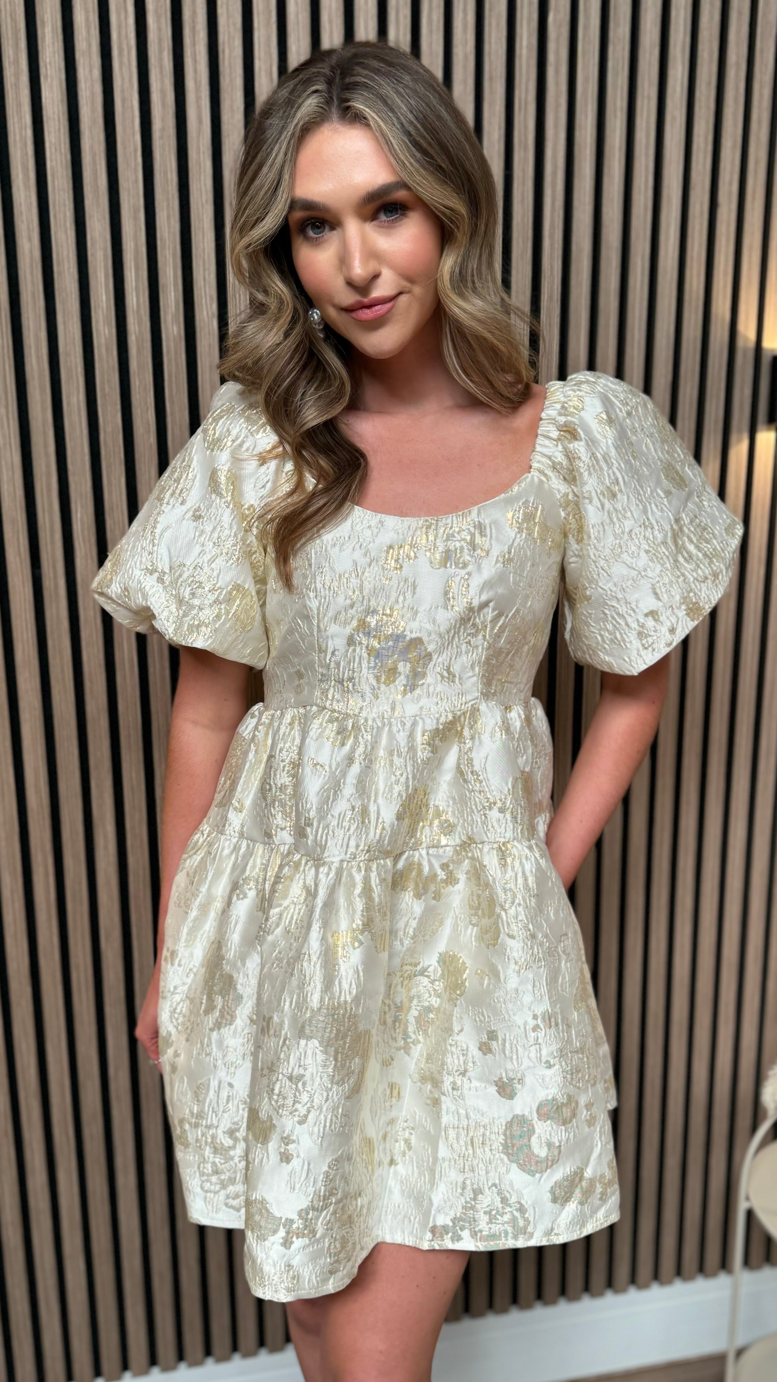 Laurina Gold & Beige Puff Sleeve Mini Dress