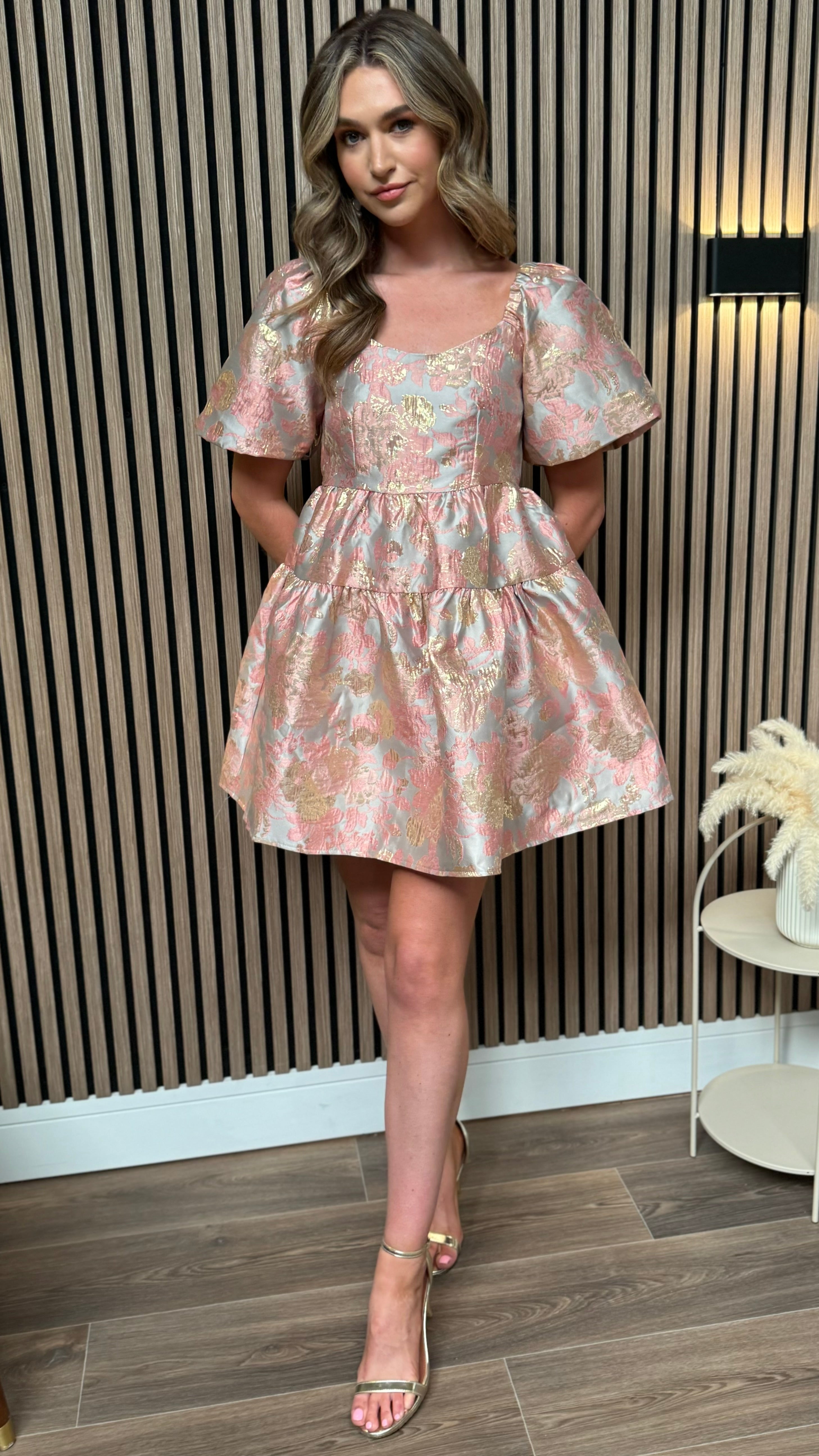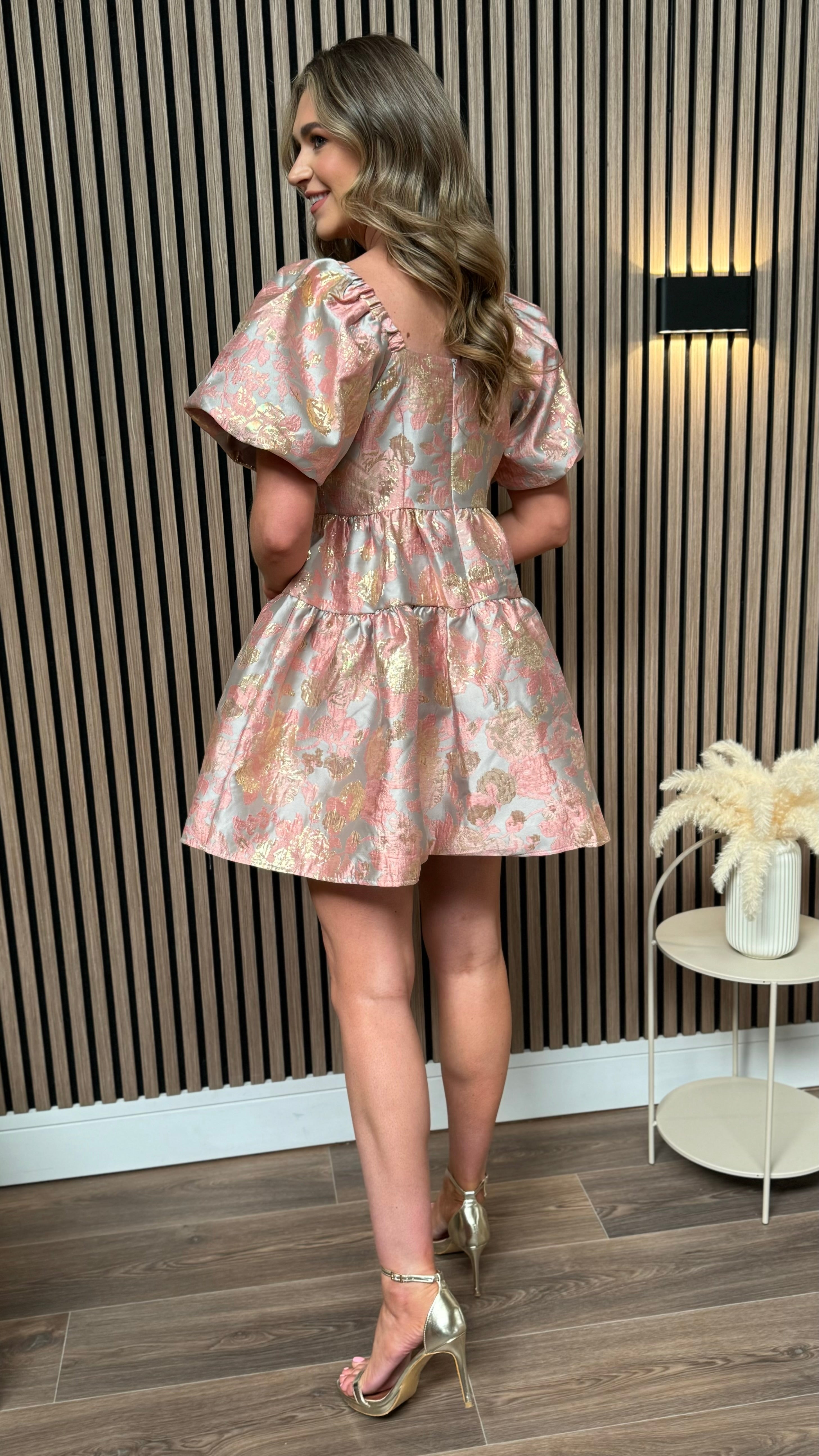 Laurina Pink & Grey Puff Sleeve Mini Dress