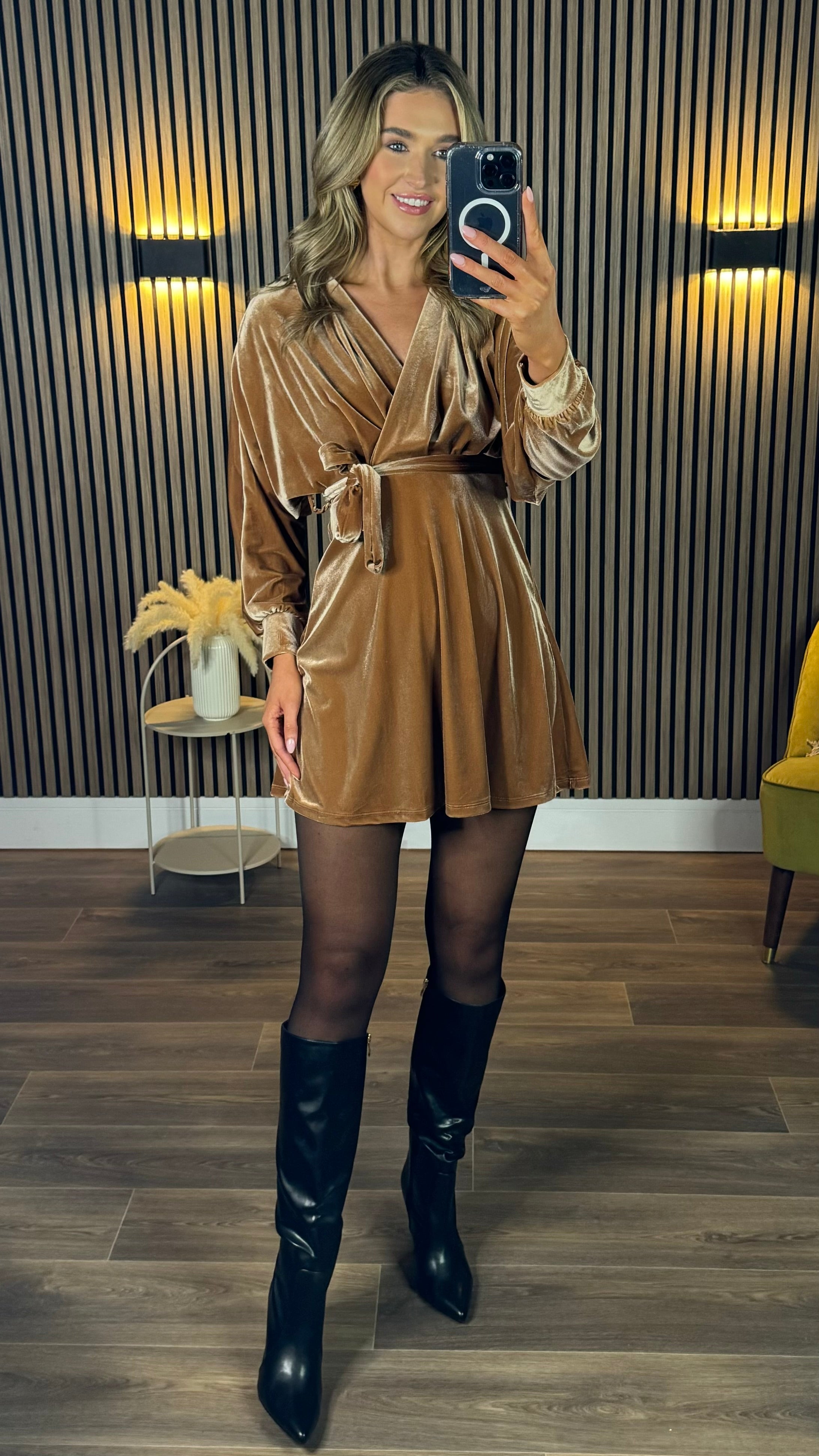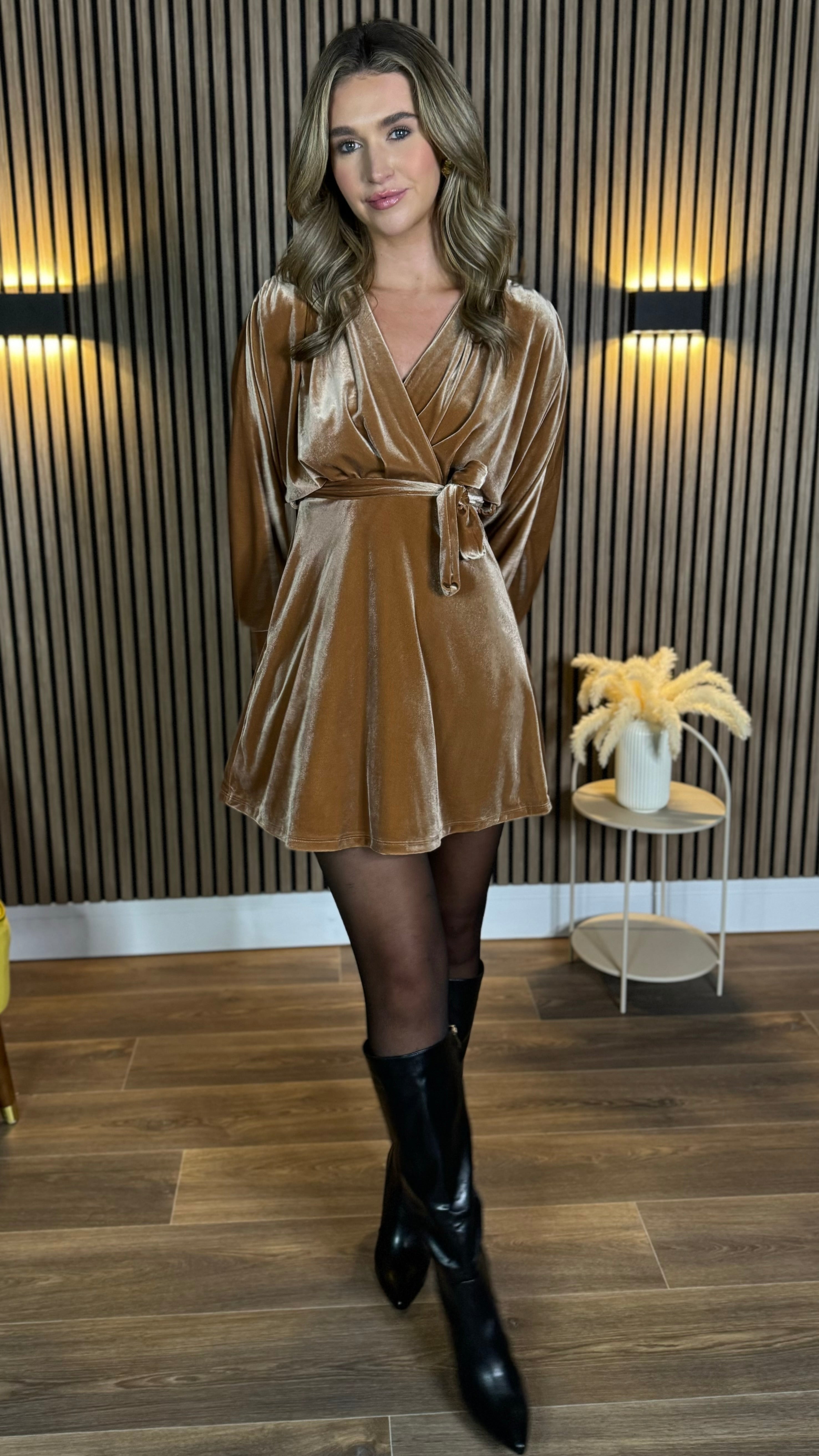 This Izzie mini dress is all wrapped up and ready to go! From the wrap detail to the fitted cuffs, this statement dress is perfect for a night out or a romantic evening. The elasticated waistband and tie detail cinch in the outfit, while the skater style is equal parts fun and flirty. Let the good times roll!