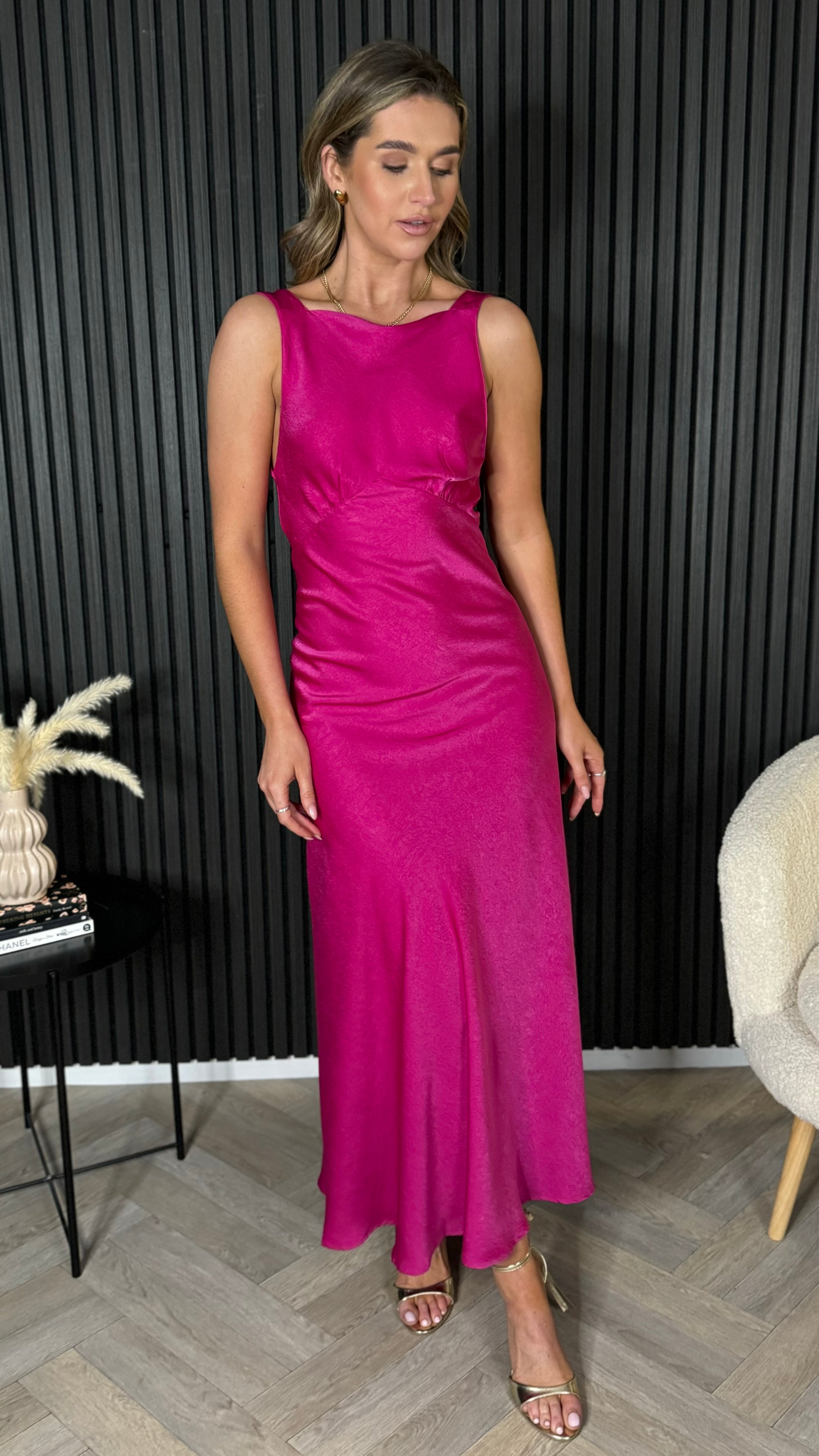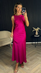 This refined Amber Fuchsia midi dress presents a classic round neckline complemented by an elegant V-back design. The vibrant hue and flattering silhouette make it an impeccable choice for special occasions, from formal gatherings to celebratory events.