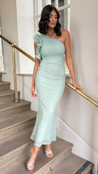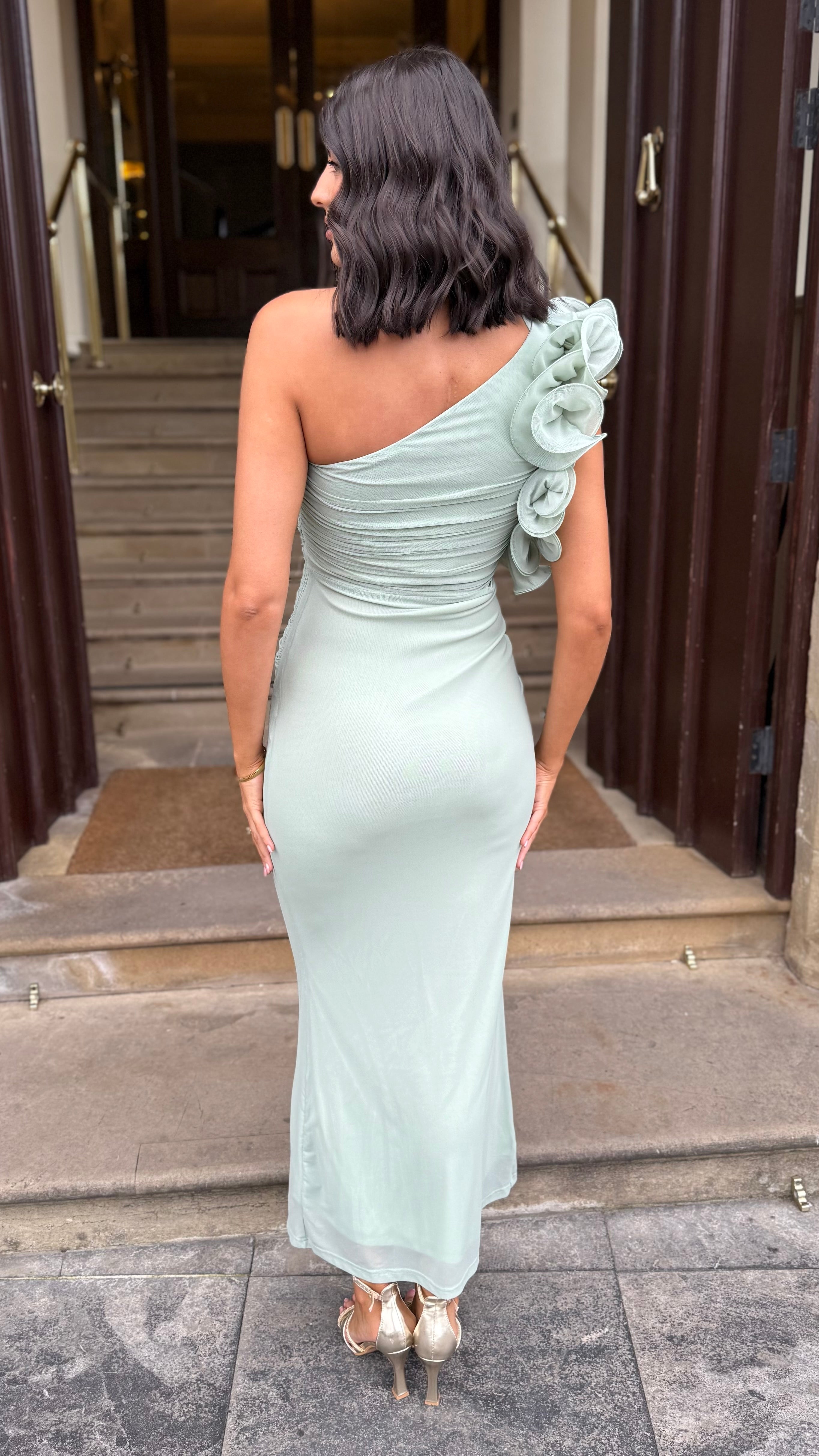 Arabella Sage Green One Shoulder Mesh Maxi Dress