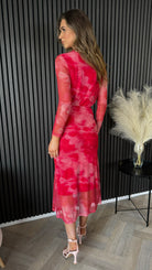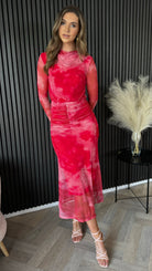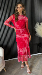 Slay the fashion game with our Charlene Red Printed Ruched Cowl Collar Midi Dress. Made from stretch tulle, this dress hugs your curves in all the right places with its fitted long sleeves and ruched front and waist. The elegant silhouette and slightly elasticated back ensure a perfect fit for that special occasion.