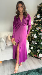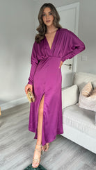Introducing our Sienna Purple V Neck midi dress - the perfect combination of elegance and comfort. Featuring long sleeves tapered at the bottom, a flattering v neckline, and a front split for added style. The elasticated waist ensures a comfortable and flattering fit. Get ready to turn heads in this stunning dress!