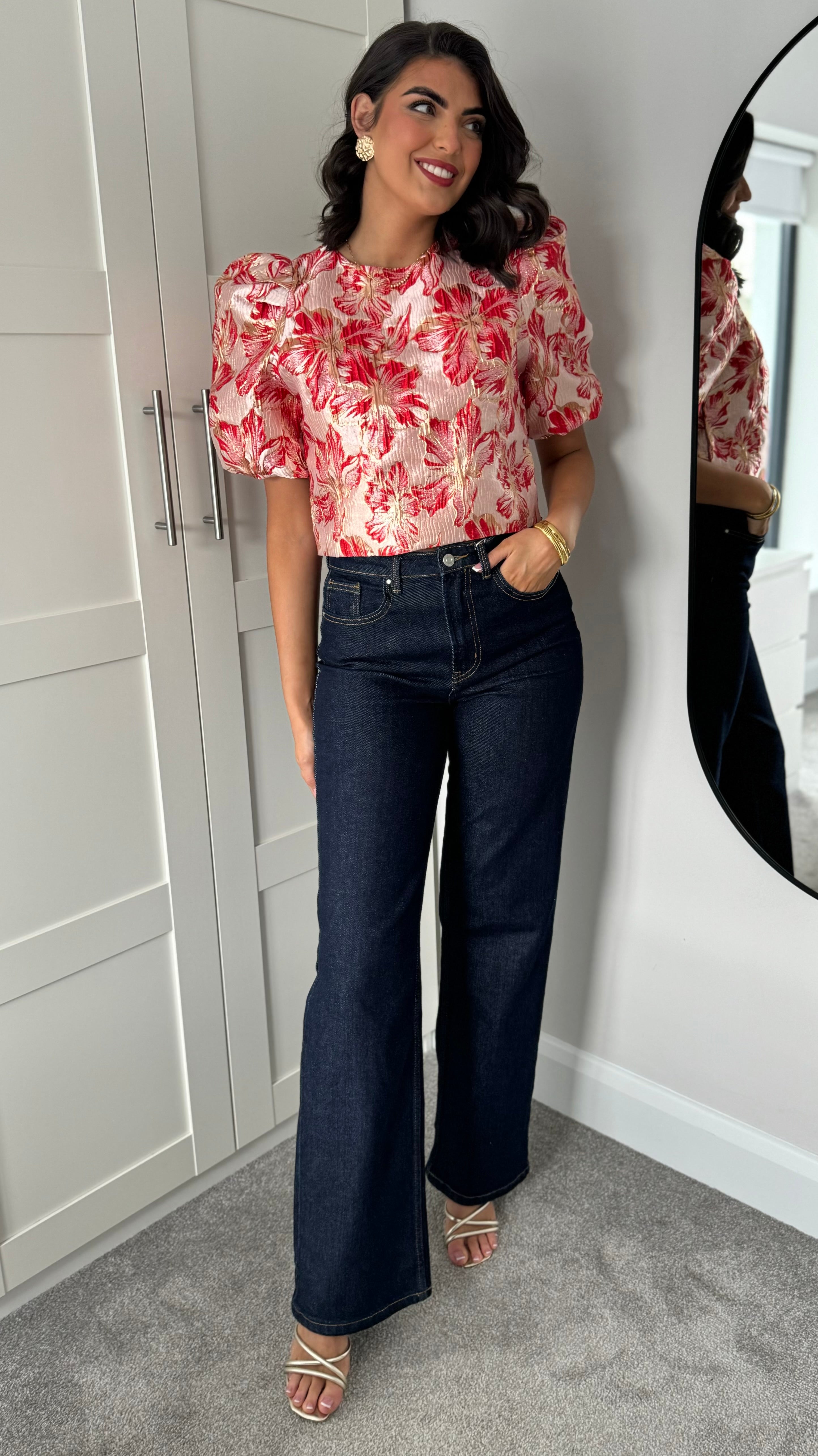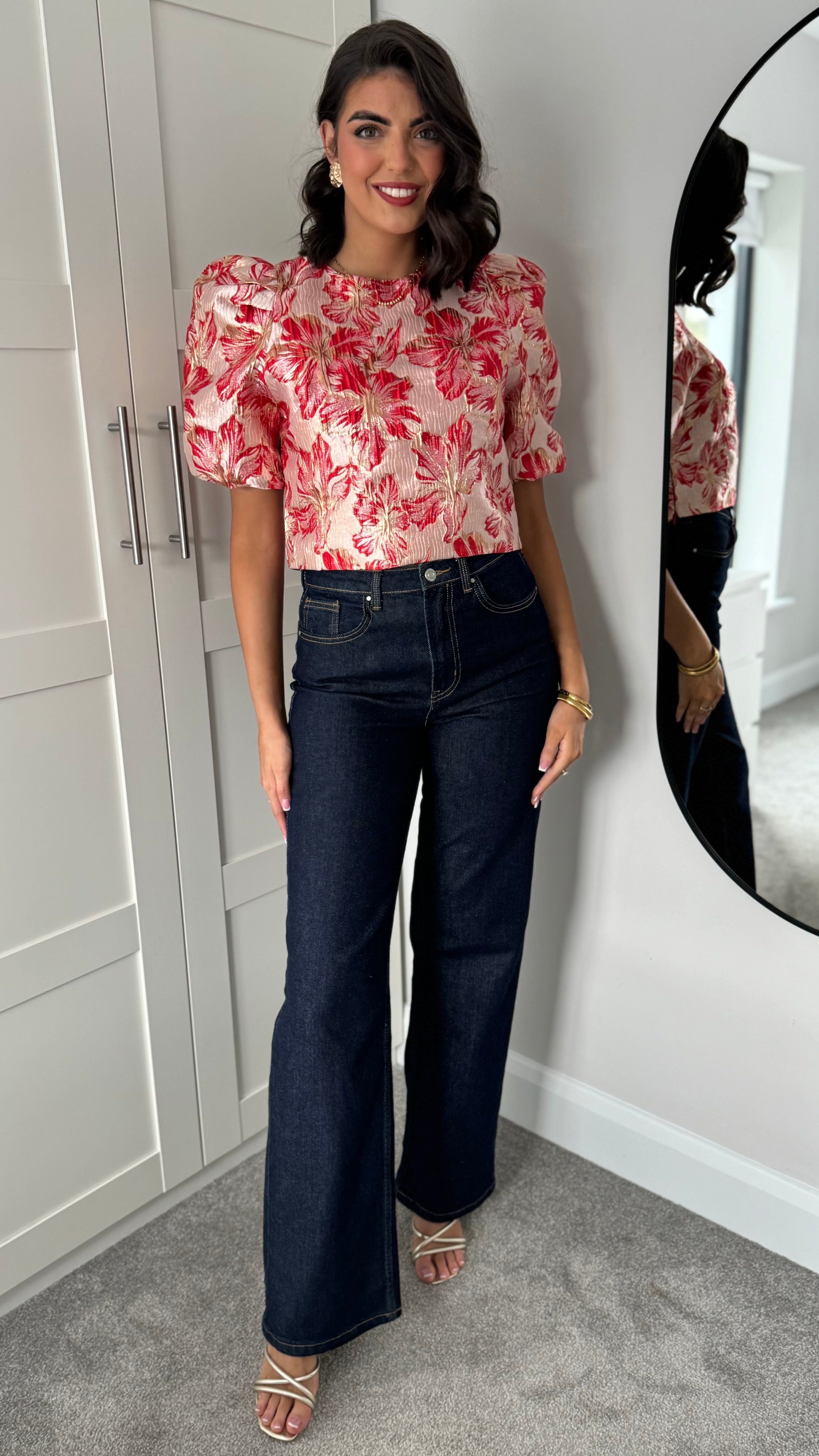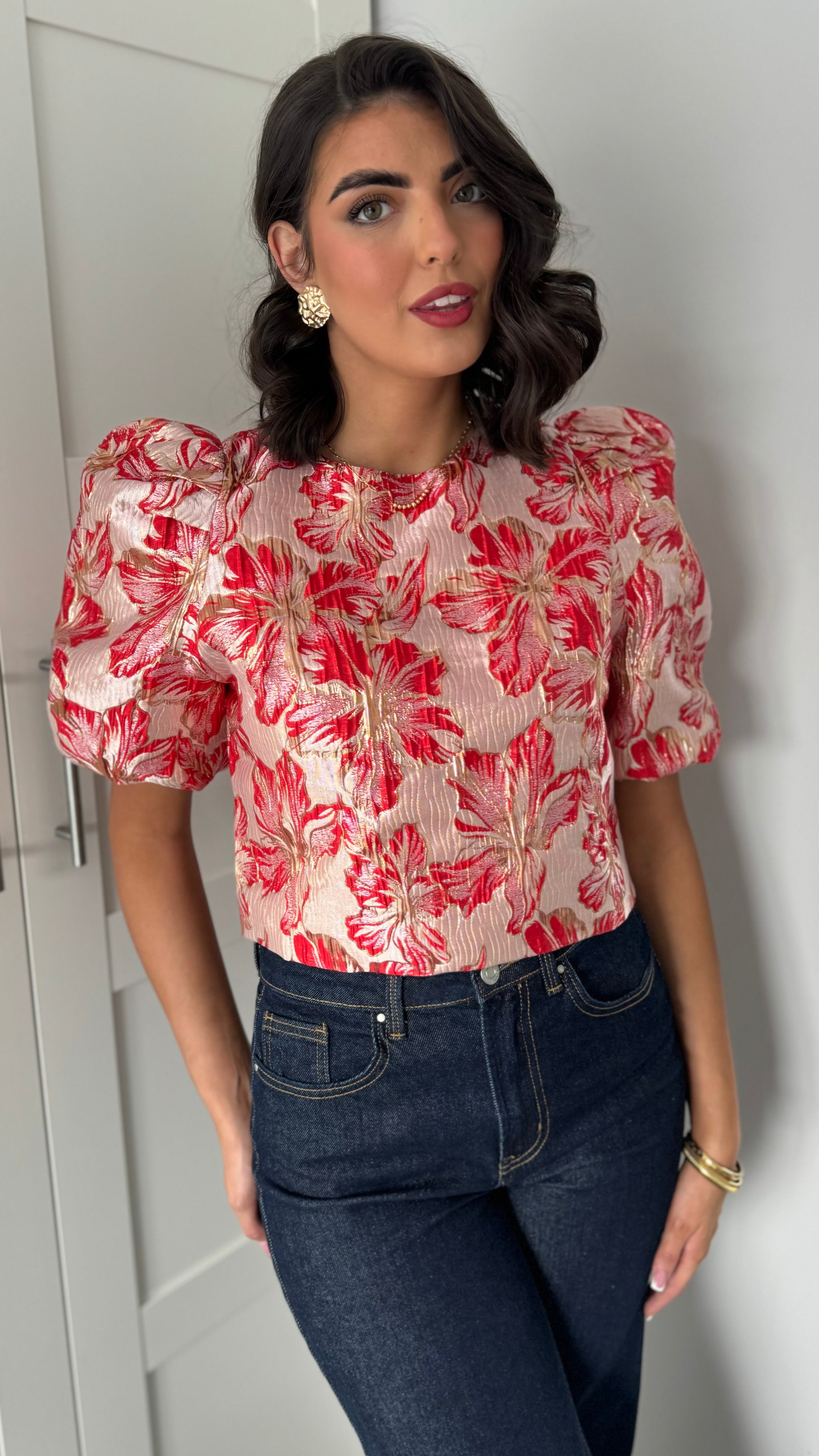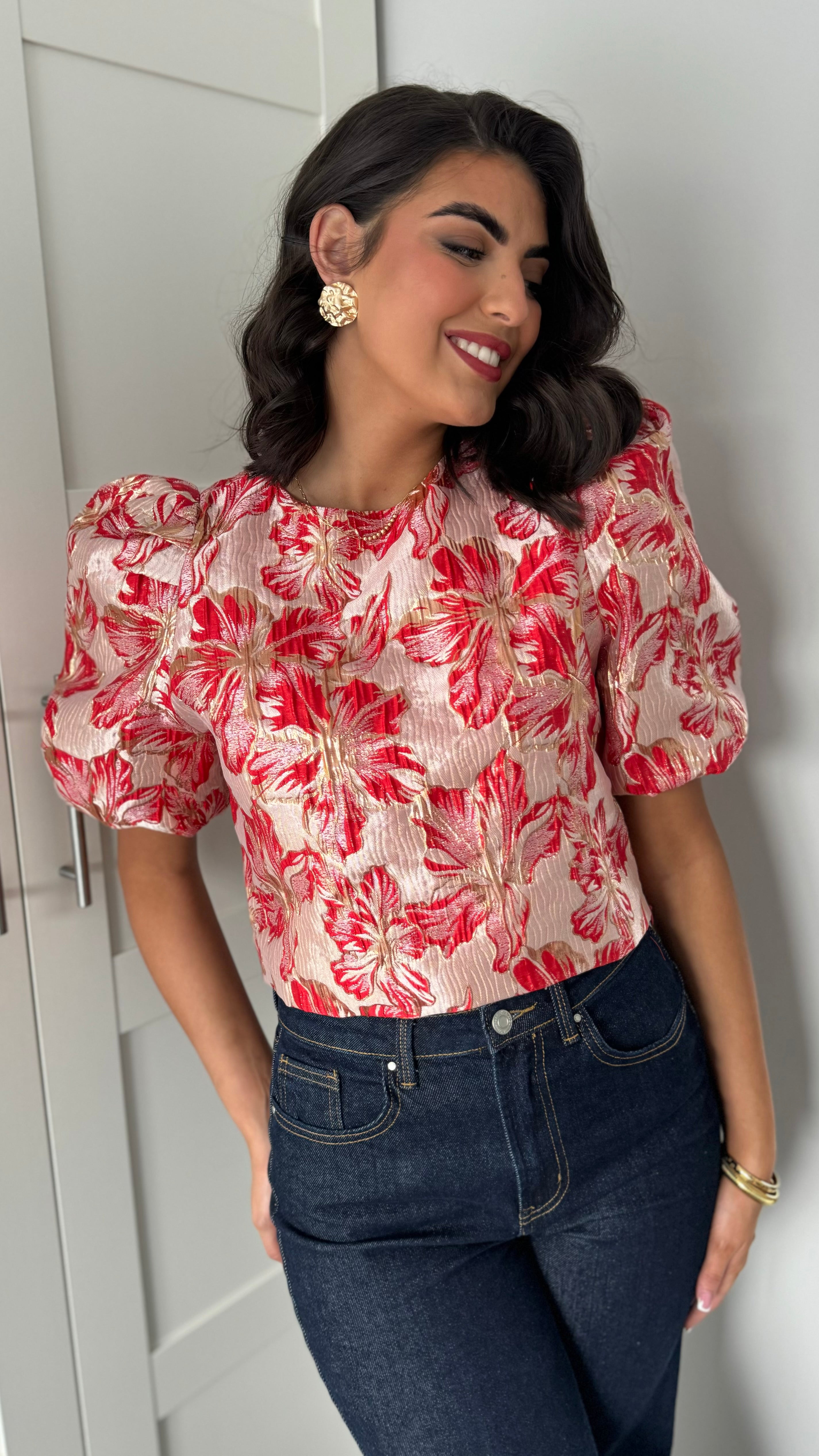 Get ready to slay in this Harper Red & Gold Printed Puff Sleeve Top! With its round neckline and eye-catching print, this top is perfect for any occasion. It's the perfect combination of bold and chic. 💃