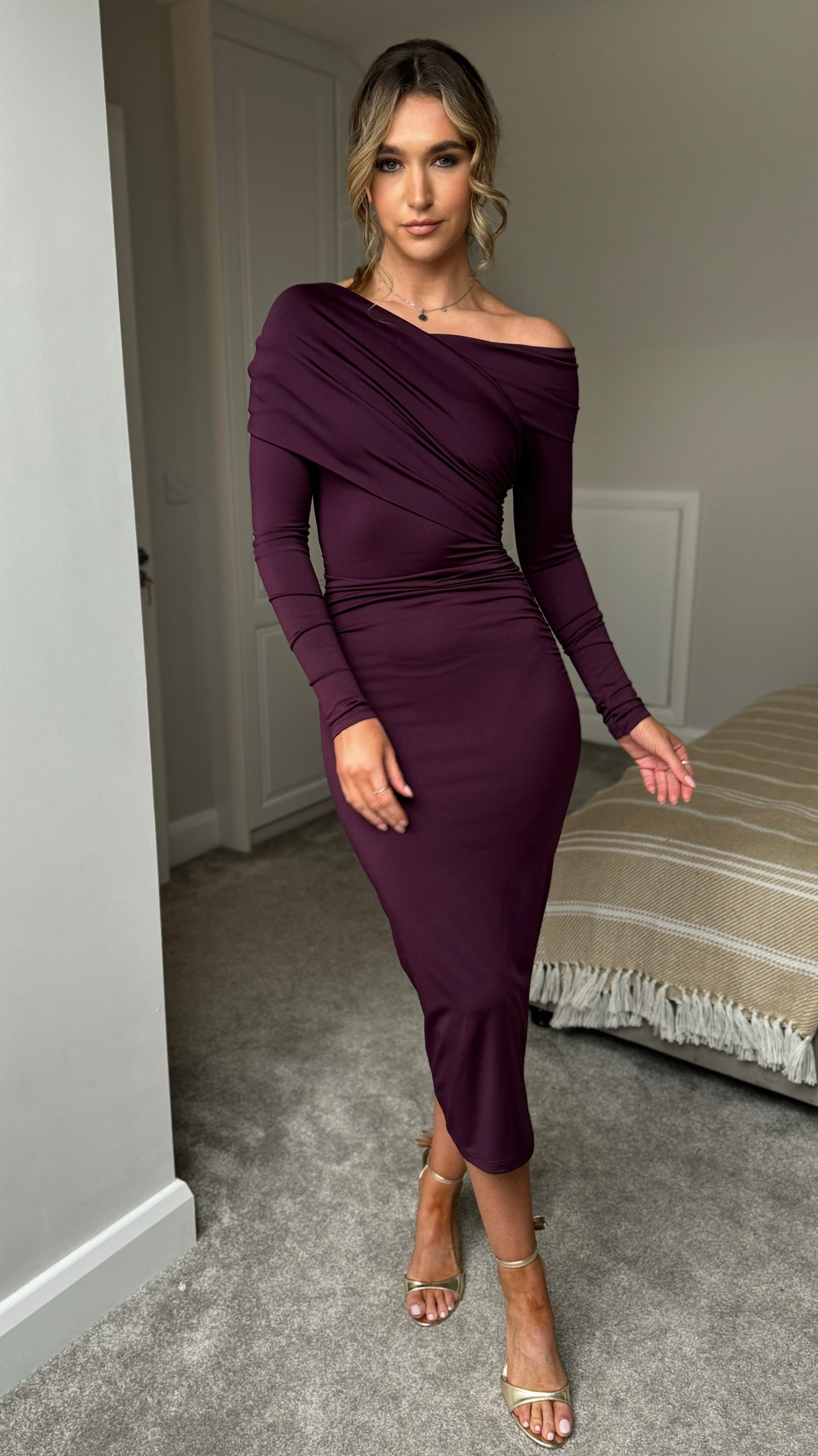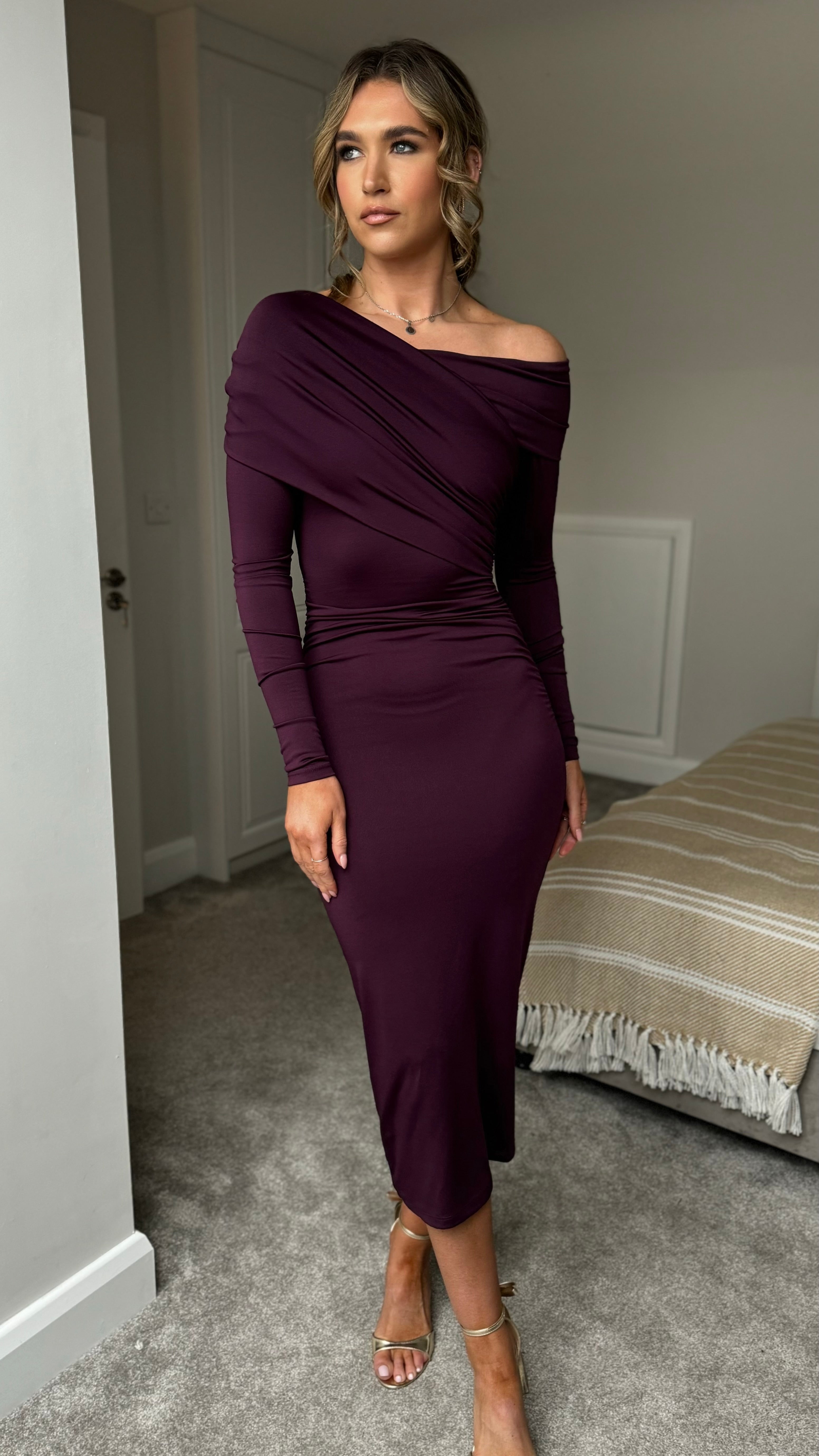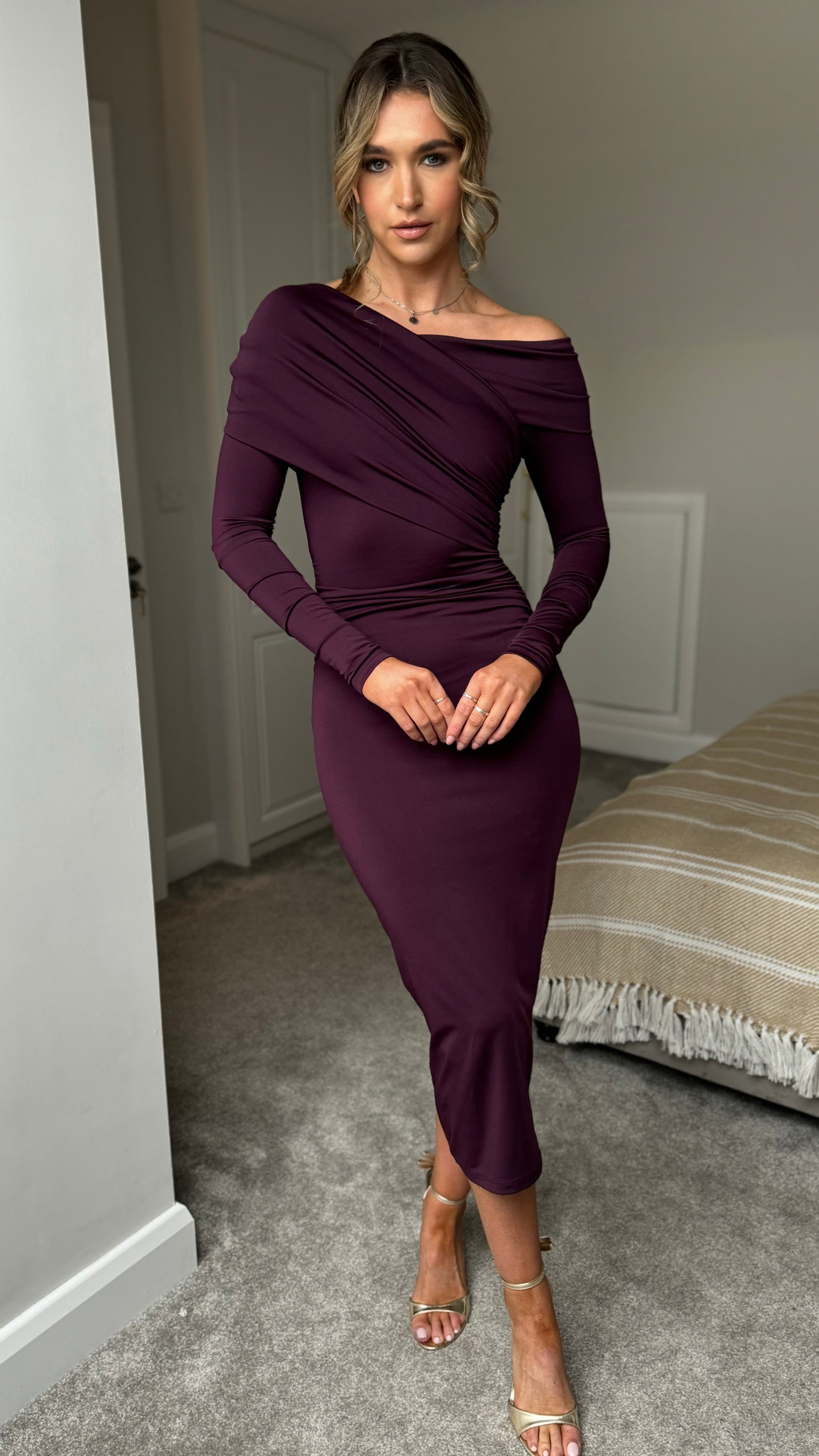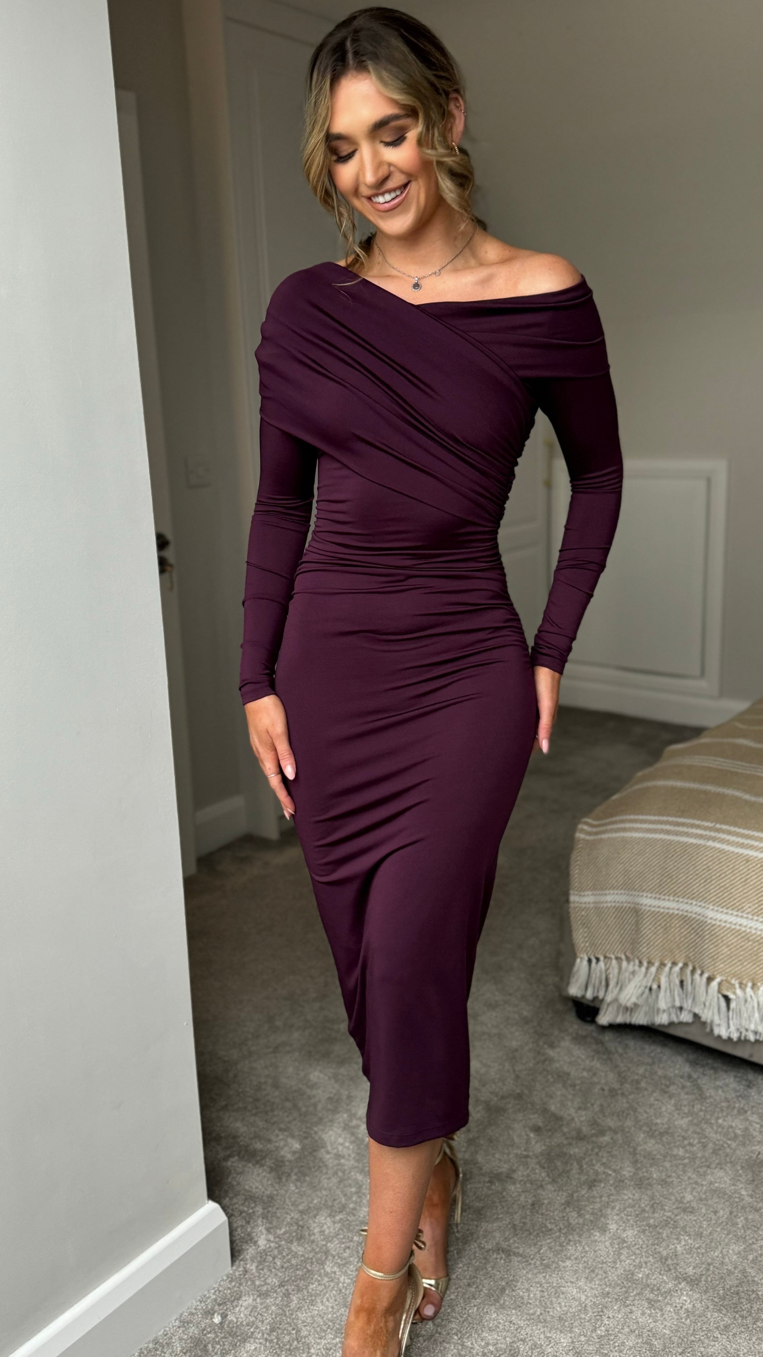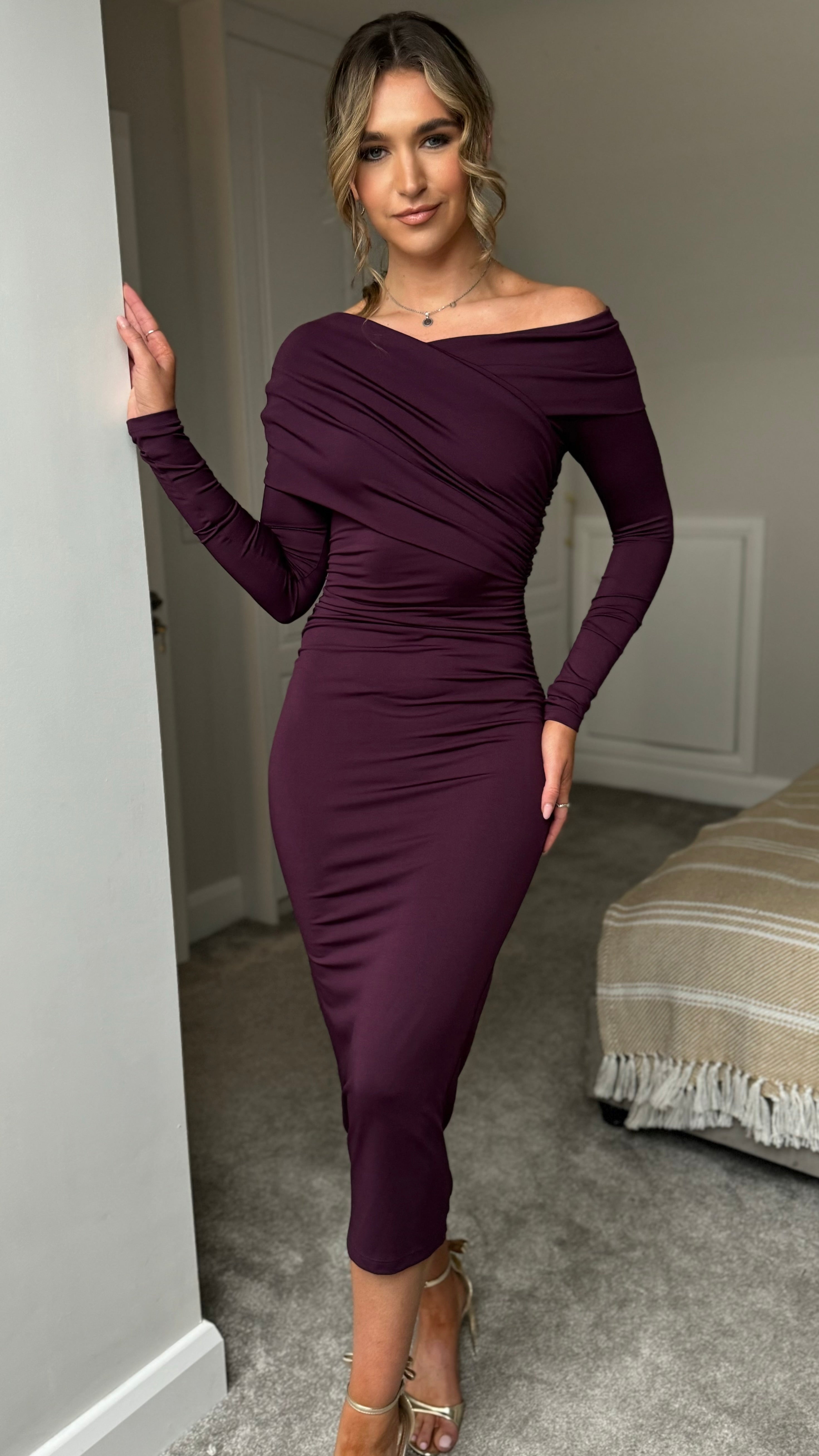 Sheridan Purple Off Shoulder Wrap Effect Midi Dress
