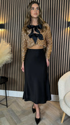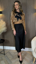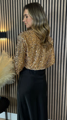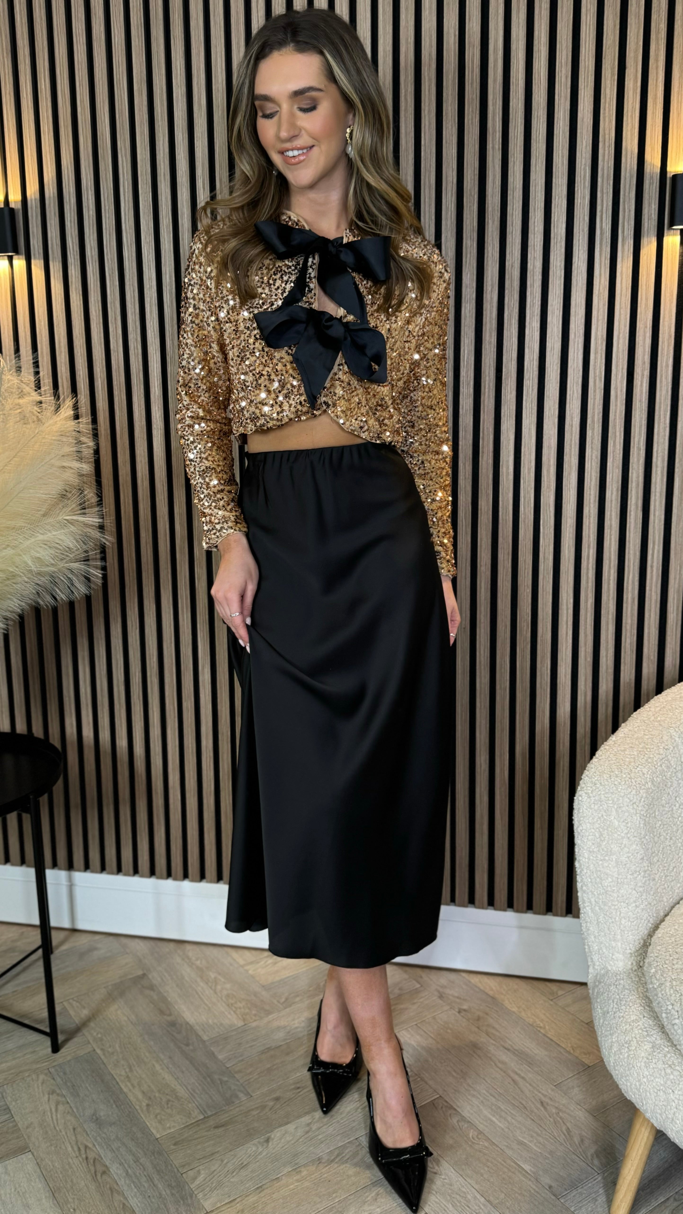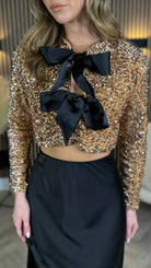 Sparkle and shine with the Tahlia Gold Sequin With Black Bow Detail Top! This playful top features an open sequin design and a unique bow detail closure. Its slight crop length adds a fun twist to any outfit. Get ready to turn heads and make a statement with this quirky and stylish top! ✨🎀