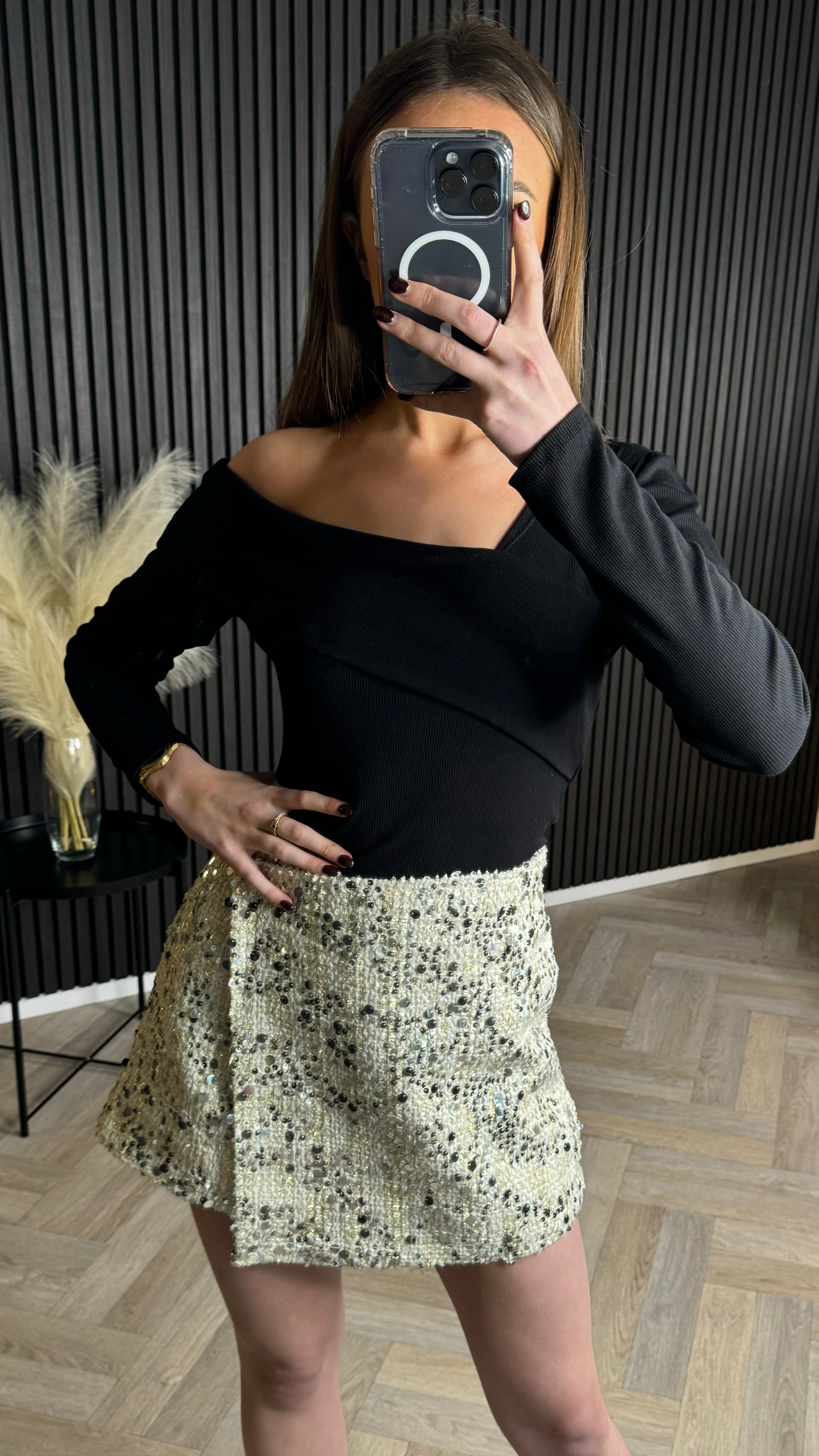 Get ready to sparkle in the Carolyn Beige Sequin Tweed Effect Skort! The tweed effect detail adds a touch of sophistication while the shiny sequin embellishments add a playful twist. Perfect for any occasion, this skort is a unique and stylish addition to your wardrobe.