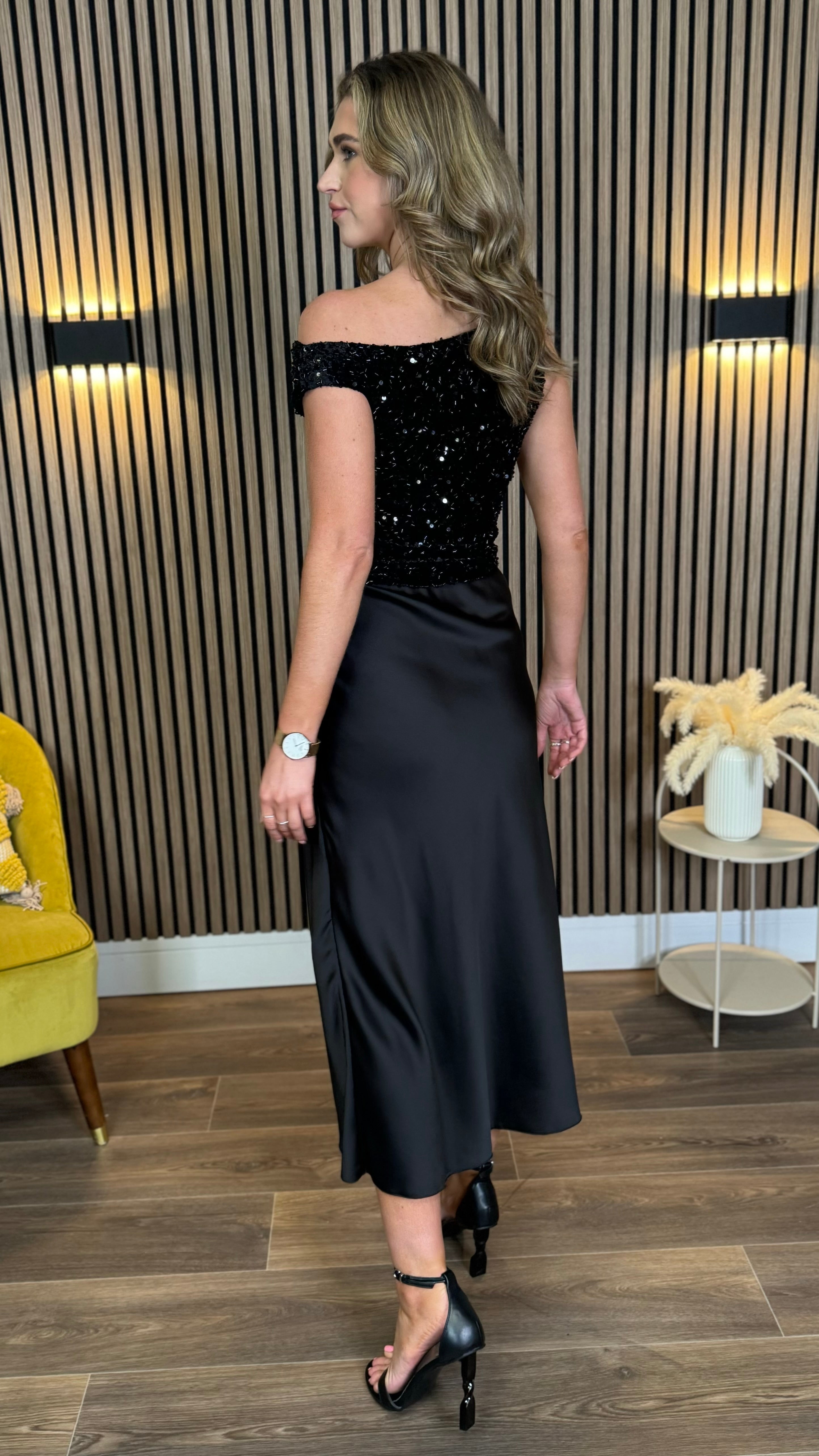 Faya Black Sequin Off Shoulder Top Sparkle and shine in this show-stopping sequin top! Featuring an off-the-shoulder neckline that's equal parts flirty and fabulous, paired with a sleeveless cut for maximum impact. Covered head-to-toe in shimmering sequins, this crop length beauty is your ticket to turning heads at any occasion. Whether you're hitting the dance floor or stealing the spotlight at a night out, this top delivers pure glam with a playful twist.