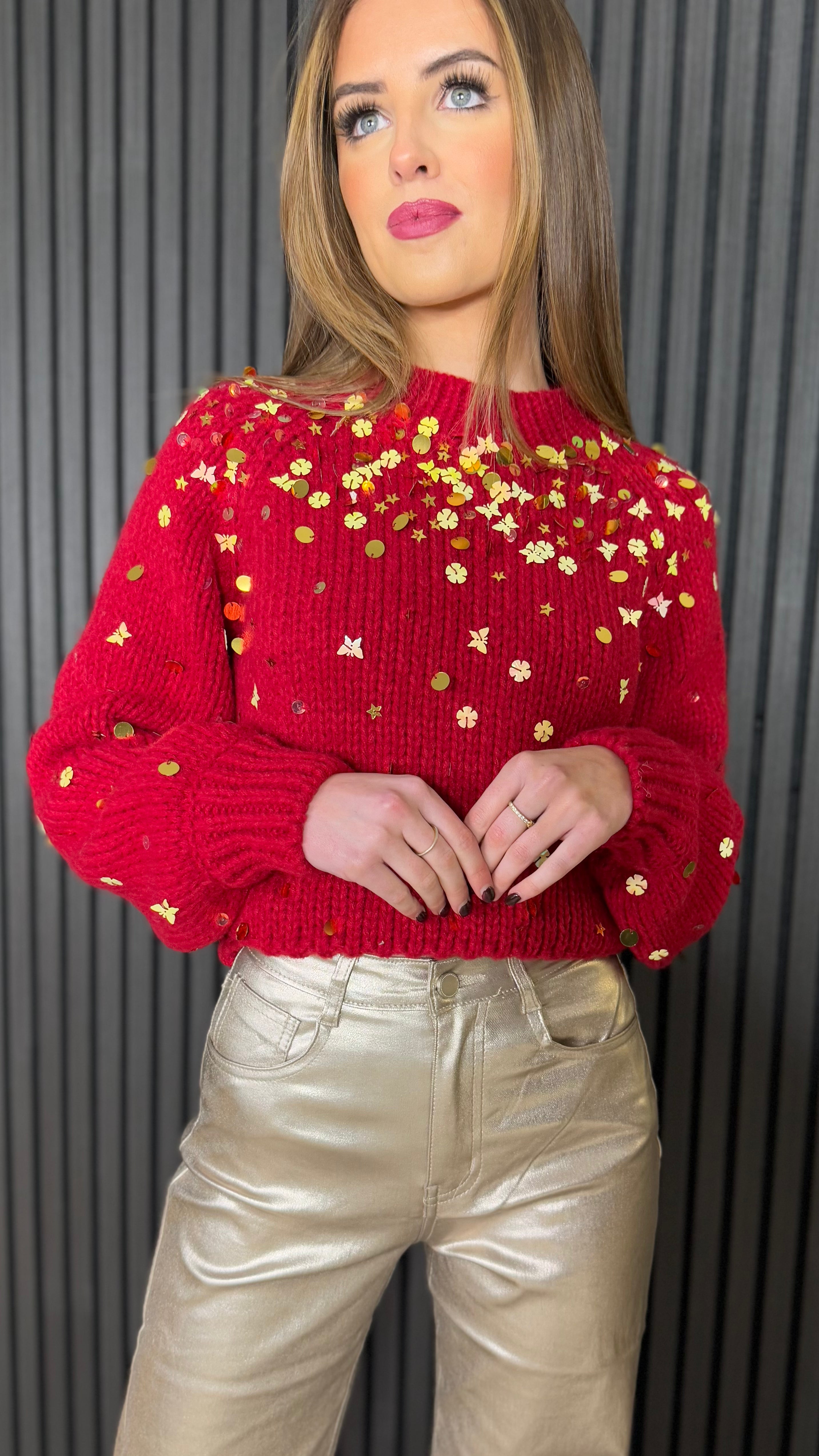 Add some sparkle and shine to your wardrobe with the Susie Red Sparkling Gold Sequin Jumper! This thick and warm knit sweater features gold and silver sequins that catch the light and add a festive touch. With a classic round neck and slightly puffed sleeves, it's both comfortable and stylish. Perfect for special occasions, this jumper will add a touch of glamour to any outfit.