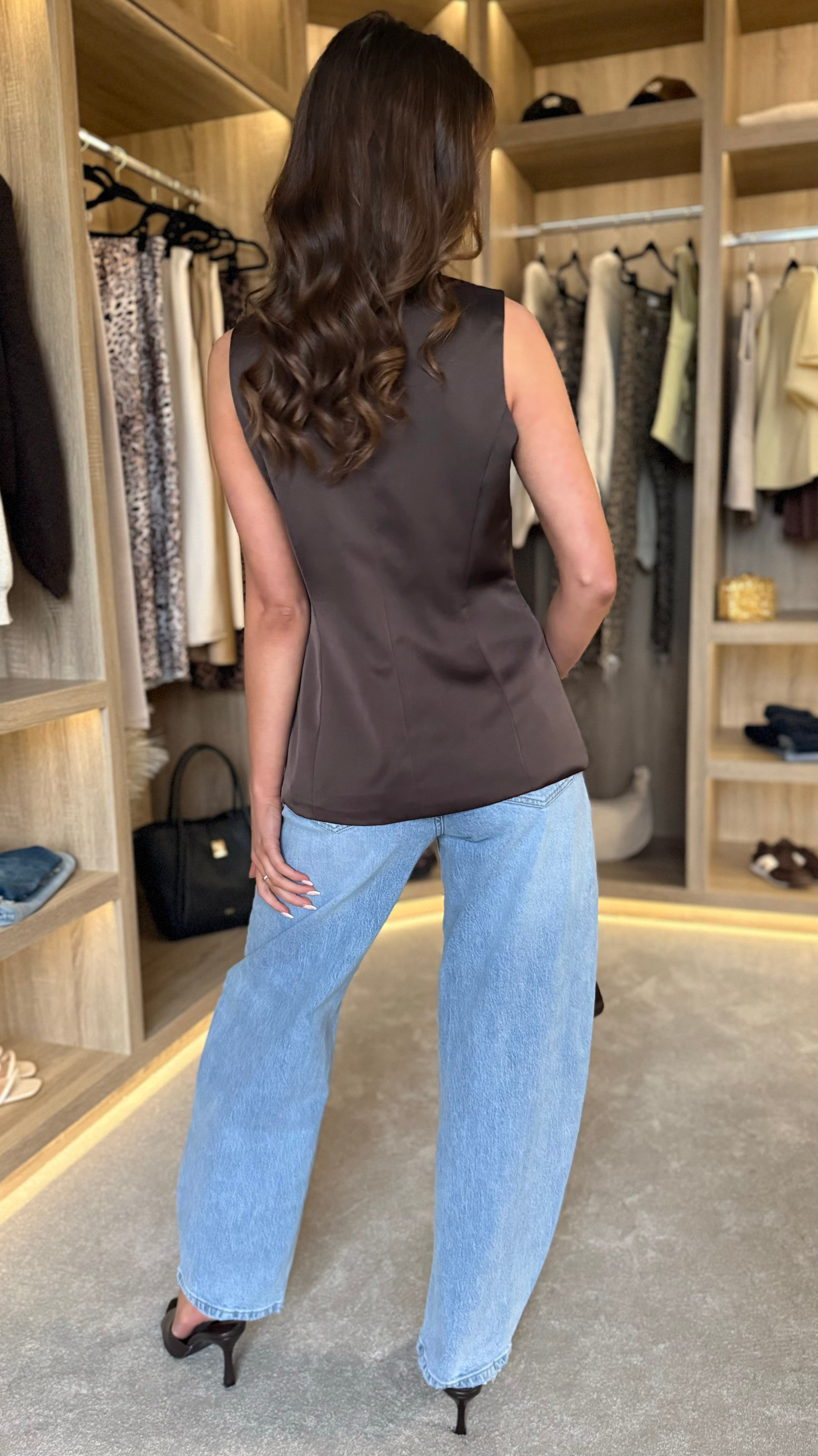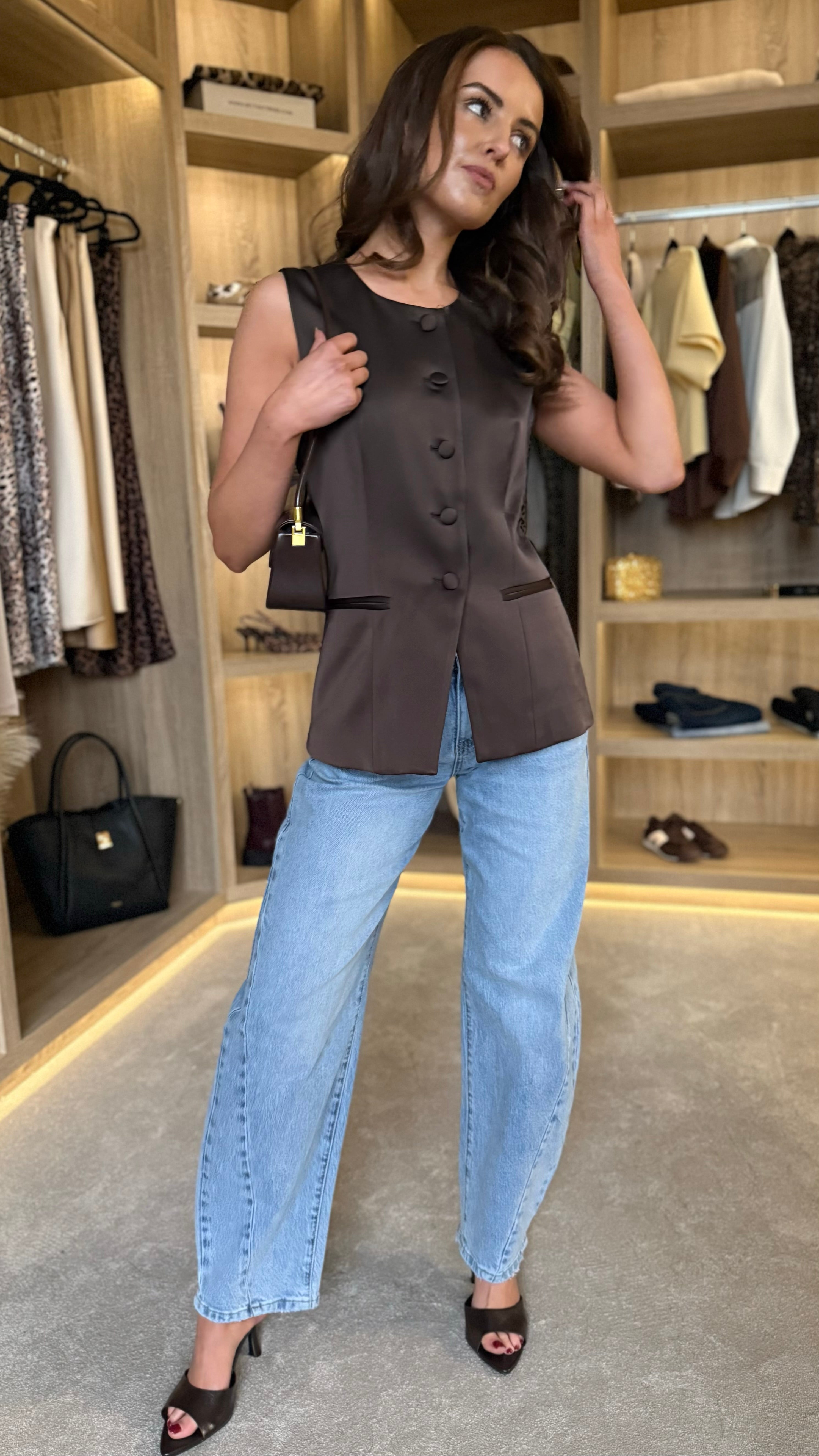 Elevate your layering game with this Clare Brown Satin Button Down Waistcoat—a playful twist on classic tailoring. Crafted from luxe satin with a smooth, lustrous finish, this piece features a chic split front and round neckline for effortless styling versatility. The lined interior ensures a polished silhouette whether worn solo or layered over your favorite tops. Button-down closure makes it easy to dress up or down, making it the perfect statement piece for both office and weekend looks.