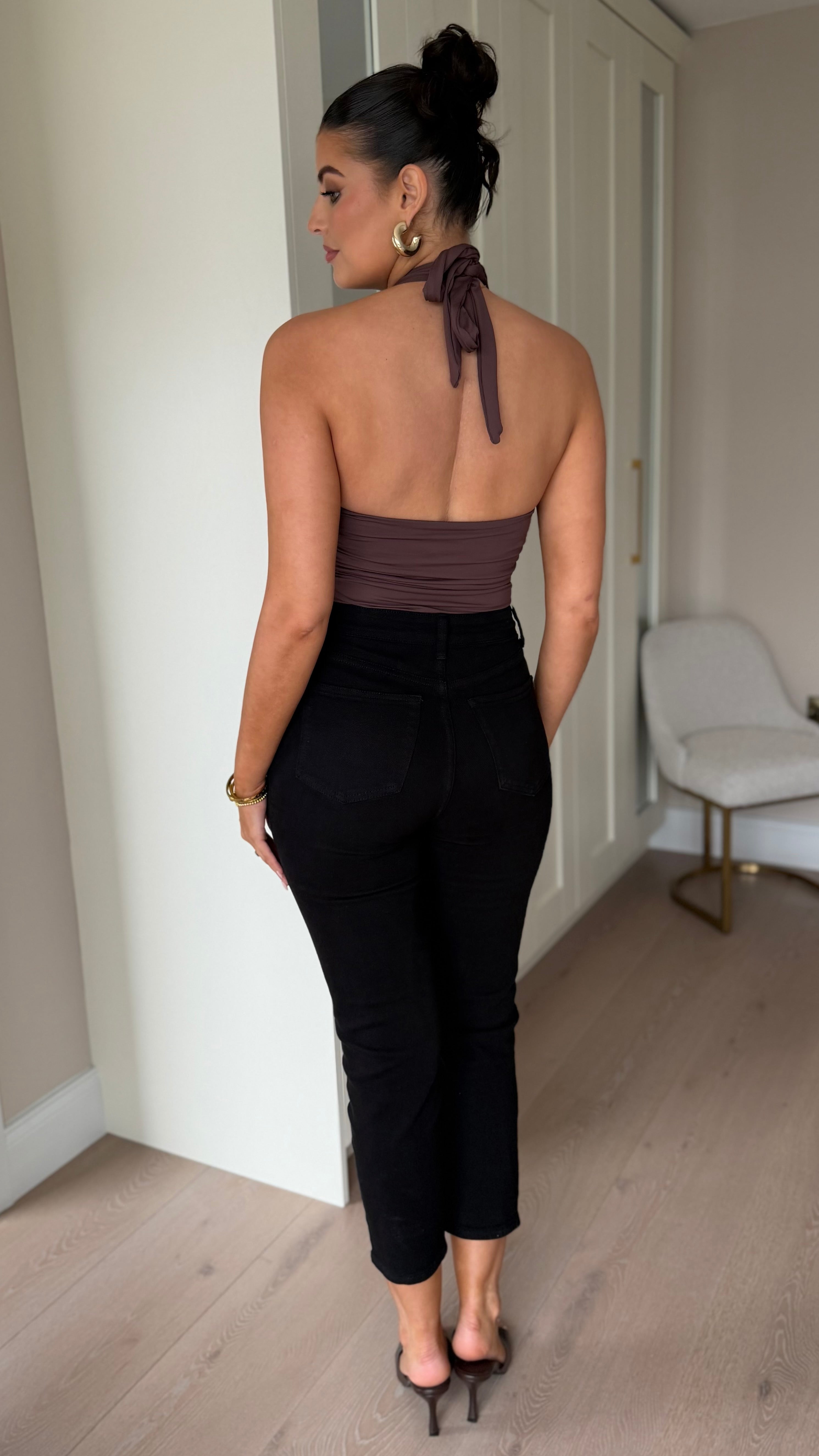 Striking halterneck top with a daring plunge neckline and a distinctive gold bar detail at the bust. Ties securely at the back of the neck for a flattering, adjustable fit. The leopard print adds edge and versatility to your wardrobe, pairing effortlessly with tailored trousers, skirts, or layered under sheer pieces. A contemporary essential for confident styling.