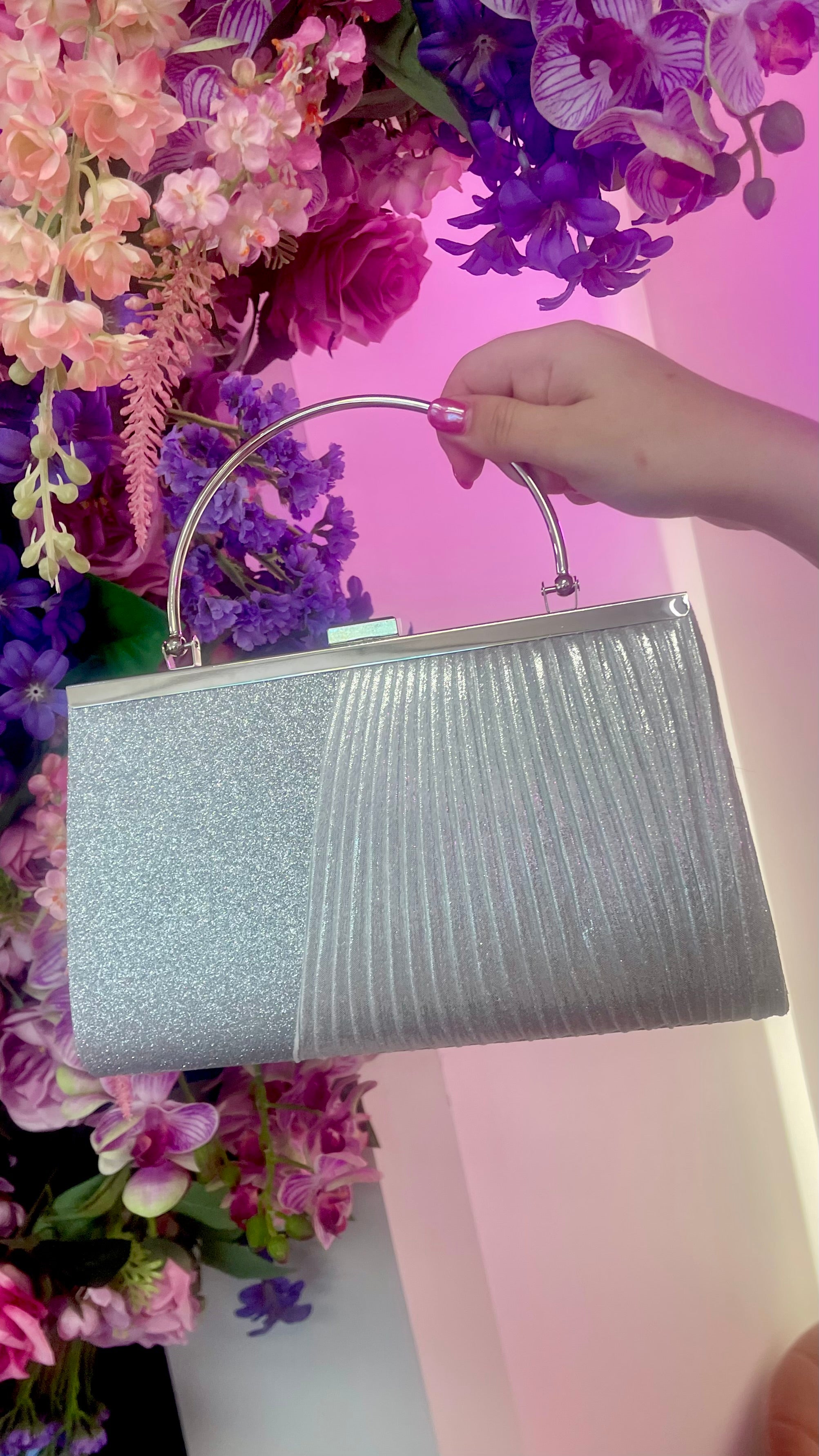 This Trisha Silver Glitter Detail Clutch Bag adds sparkle and sass to any outfit! With a handle and chain strap detail, you can easily carry your essentials while turning heads. Perfect for a night out or special occasion. Bag envy guaranteed!