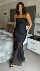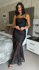 Melina Black Ruched Mesh Detail Slit Cami Strap Midi Dress
