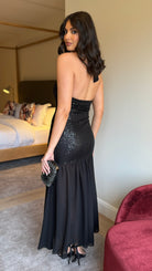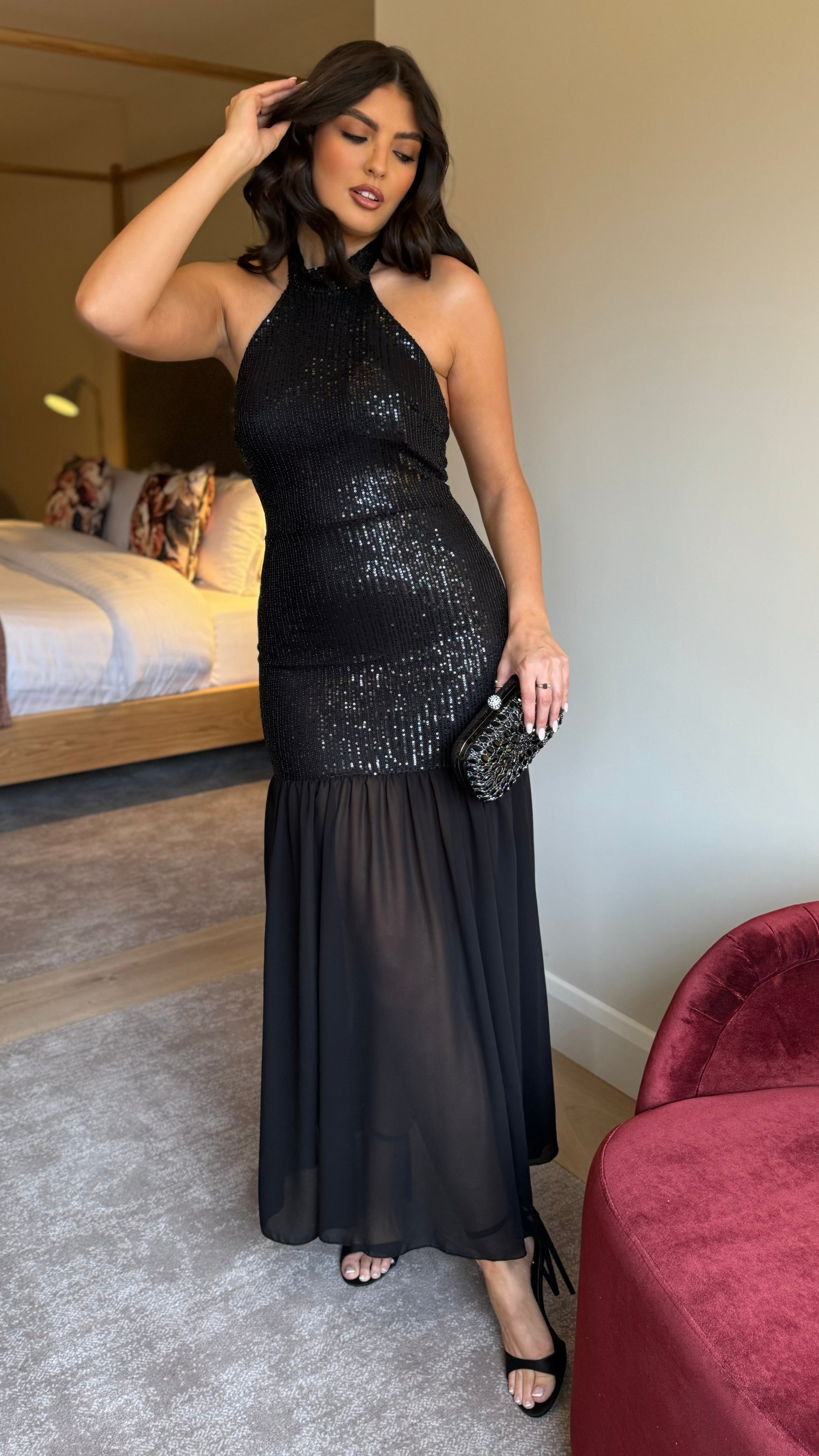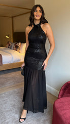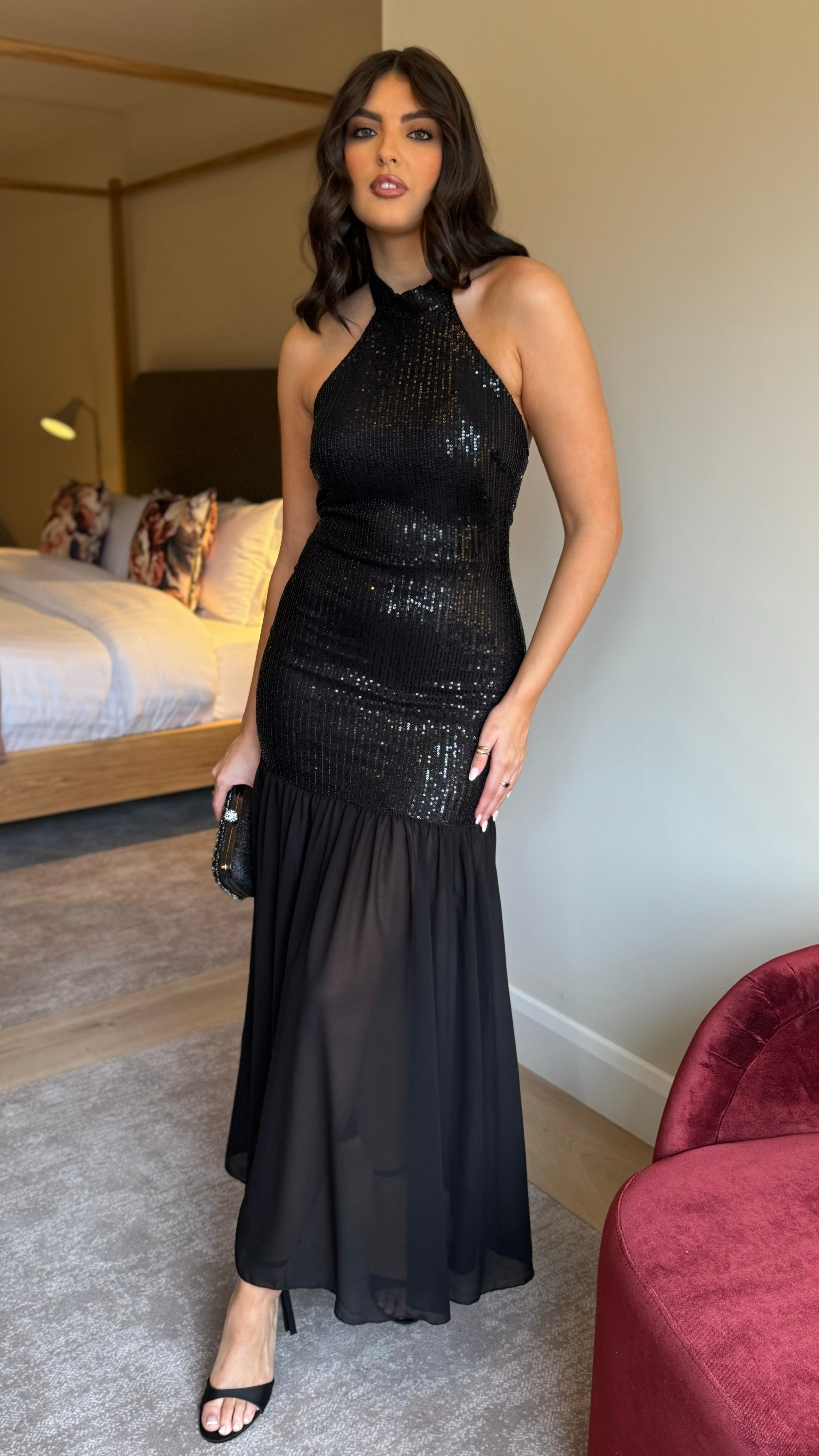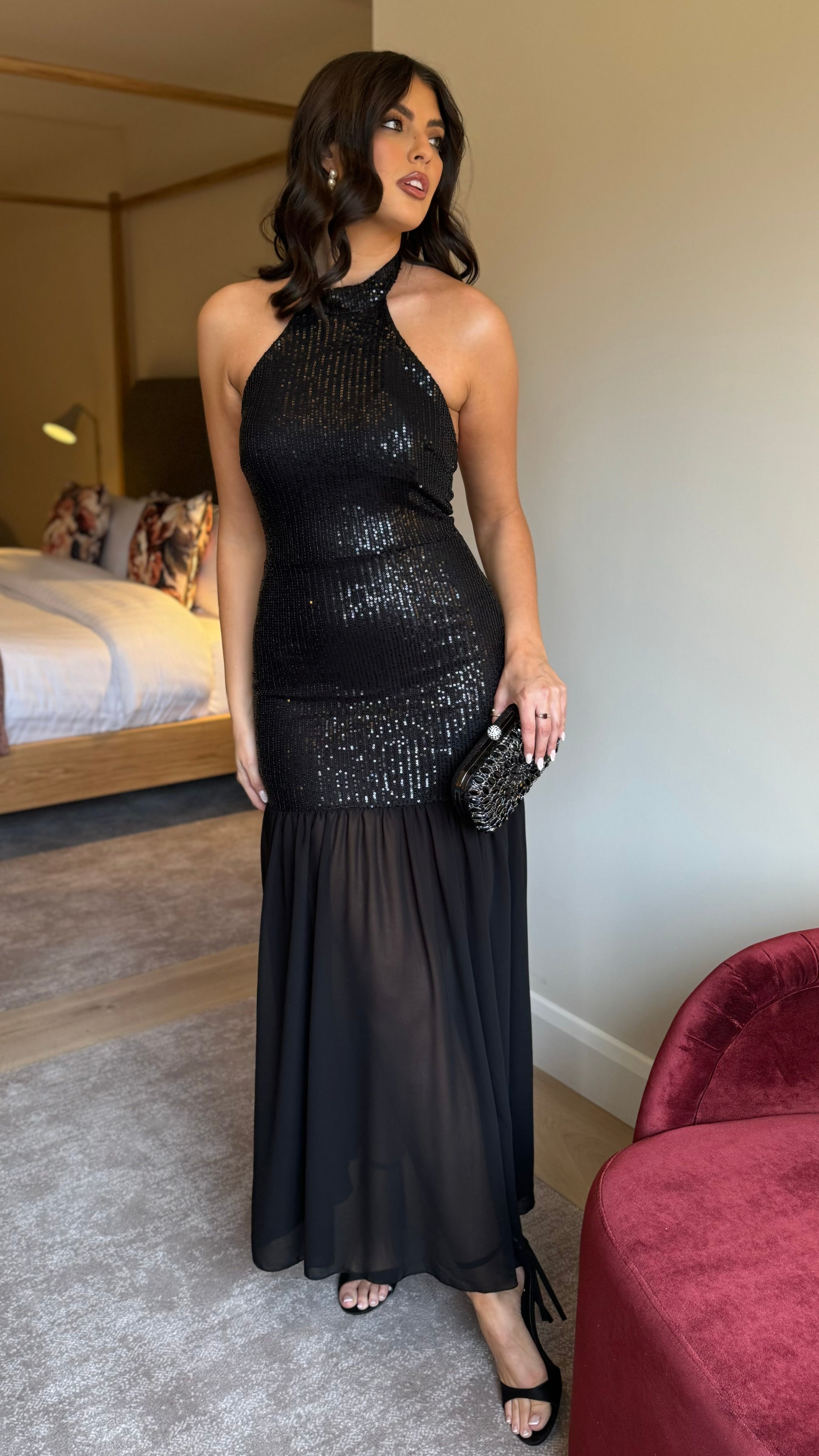 Teresa Black Sequin High Neck Mesh Hem Maxi Dress