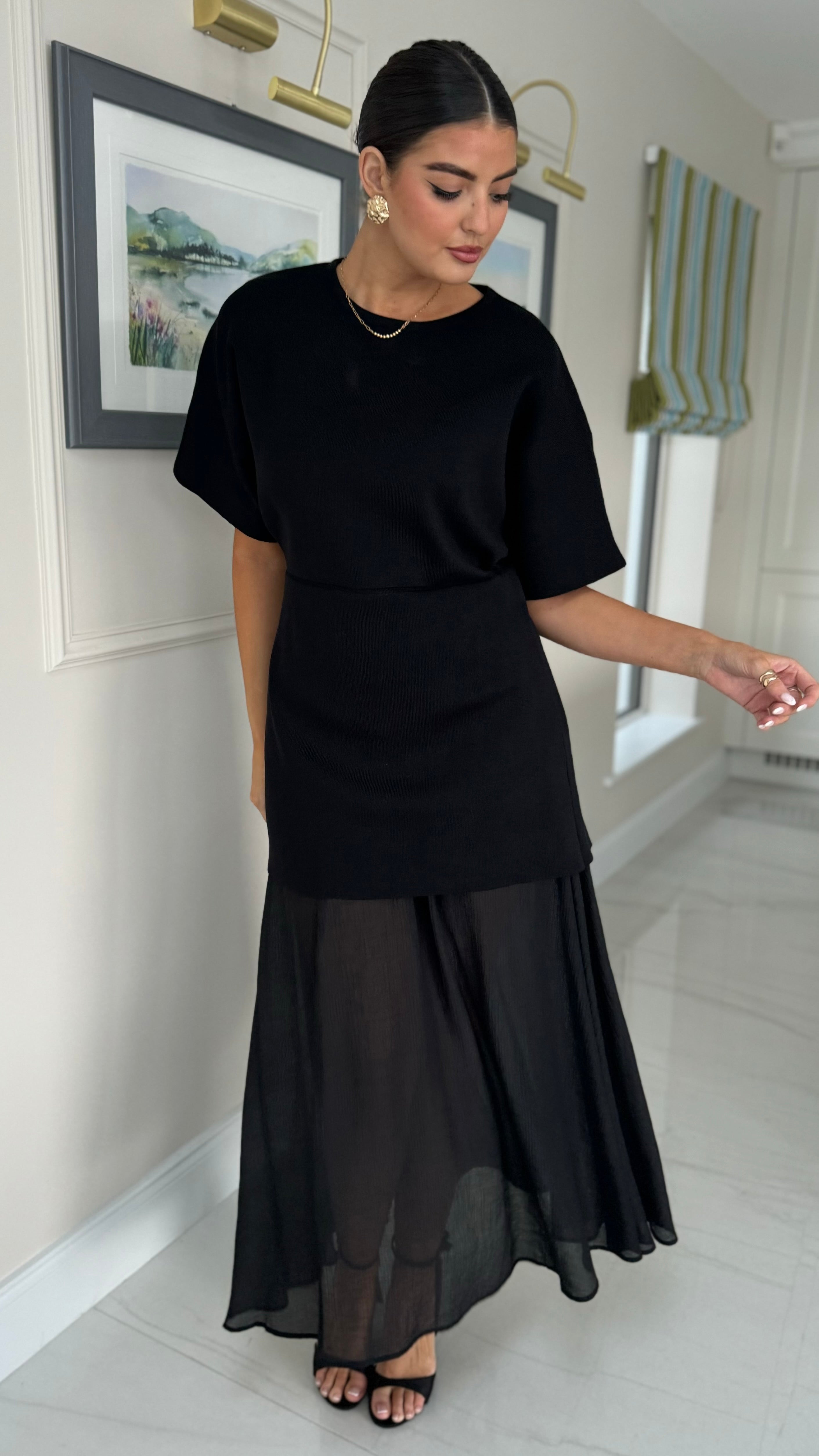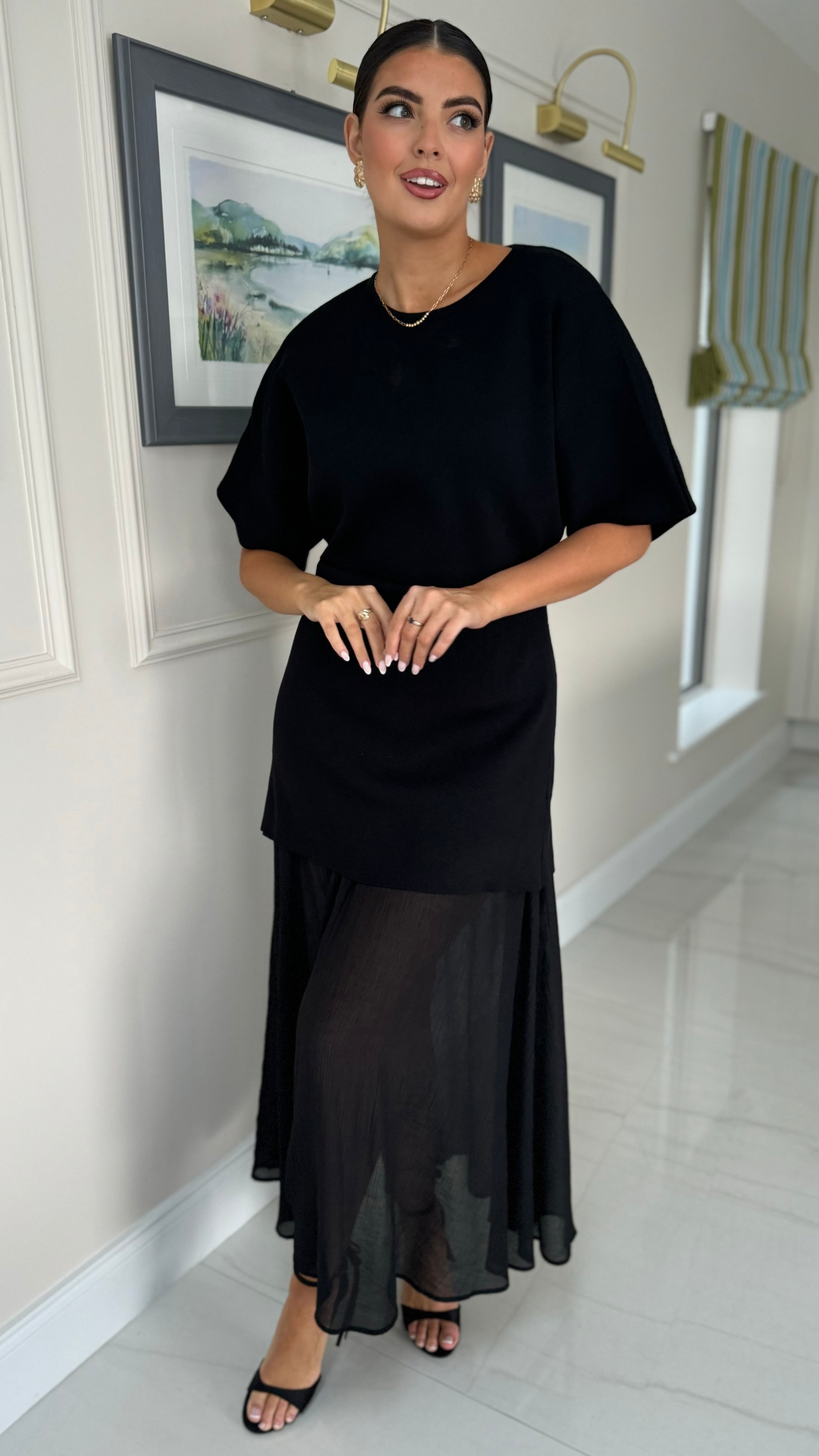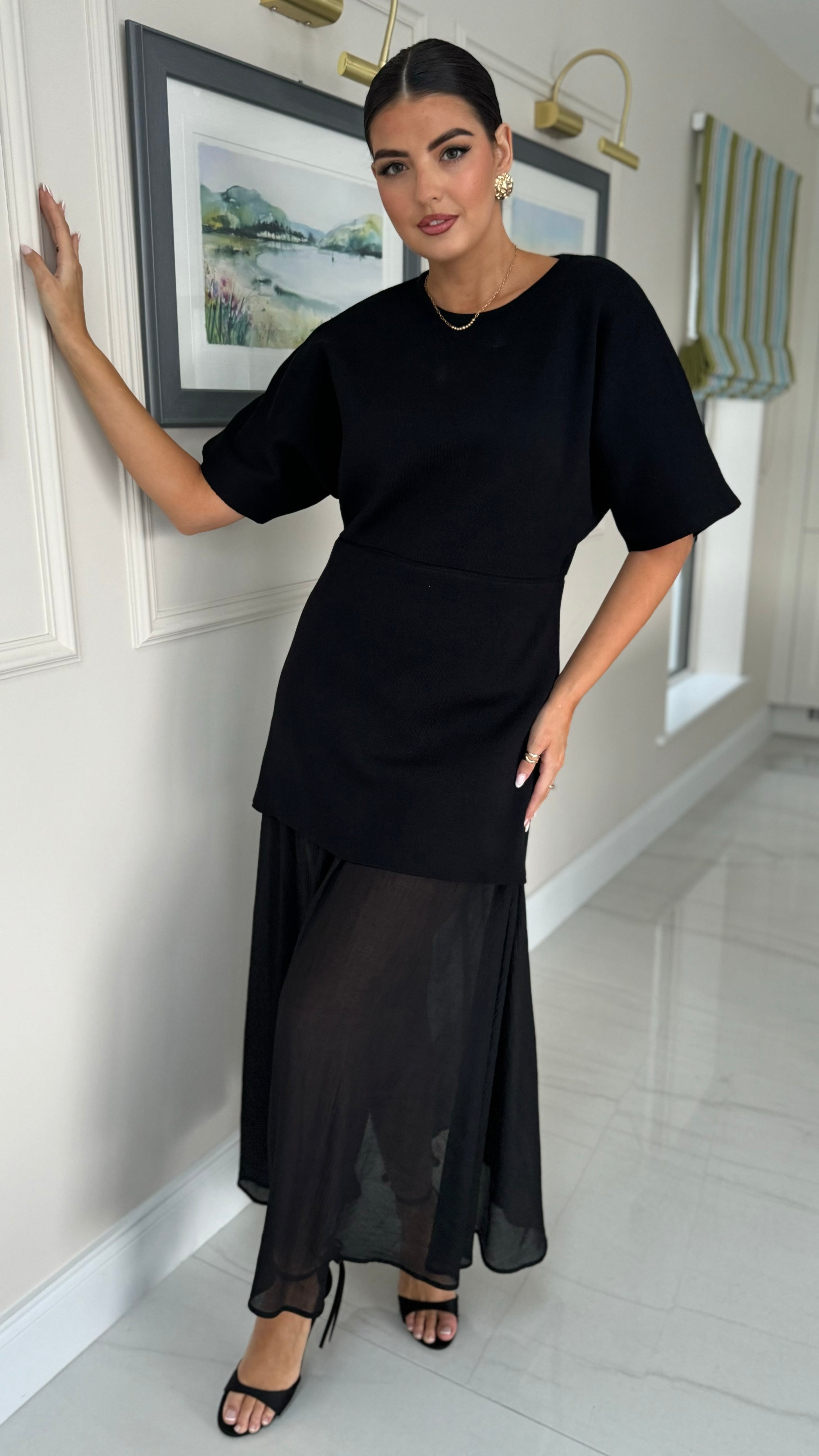 Elevate your style with the Zora Black Maxi Dress, featuring a cozy knitted t-shirt top with playful batwing sleeves and an oversized fit for ultimate comfort. The airy mesh skirt adds a flirty twist, perfect for dressing up with heels or keeping it casual with sneakers. This versatile dress makes it easy to switch from day to night in effortless style.