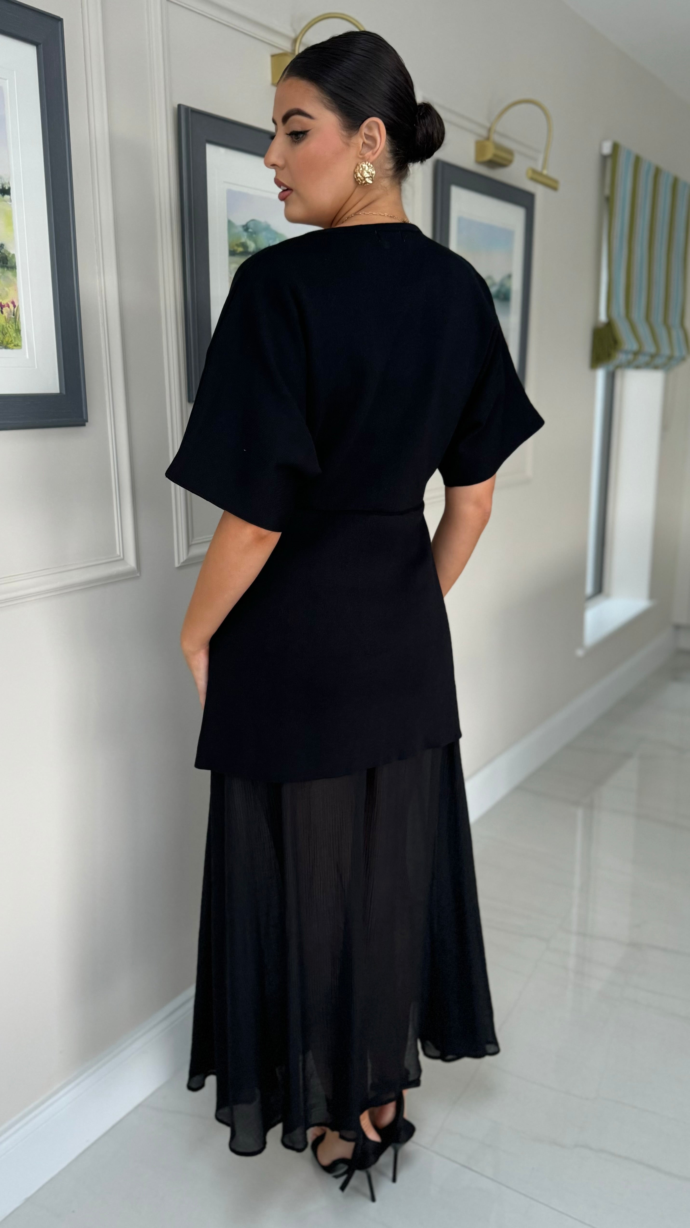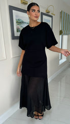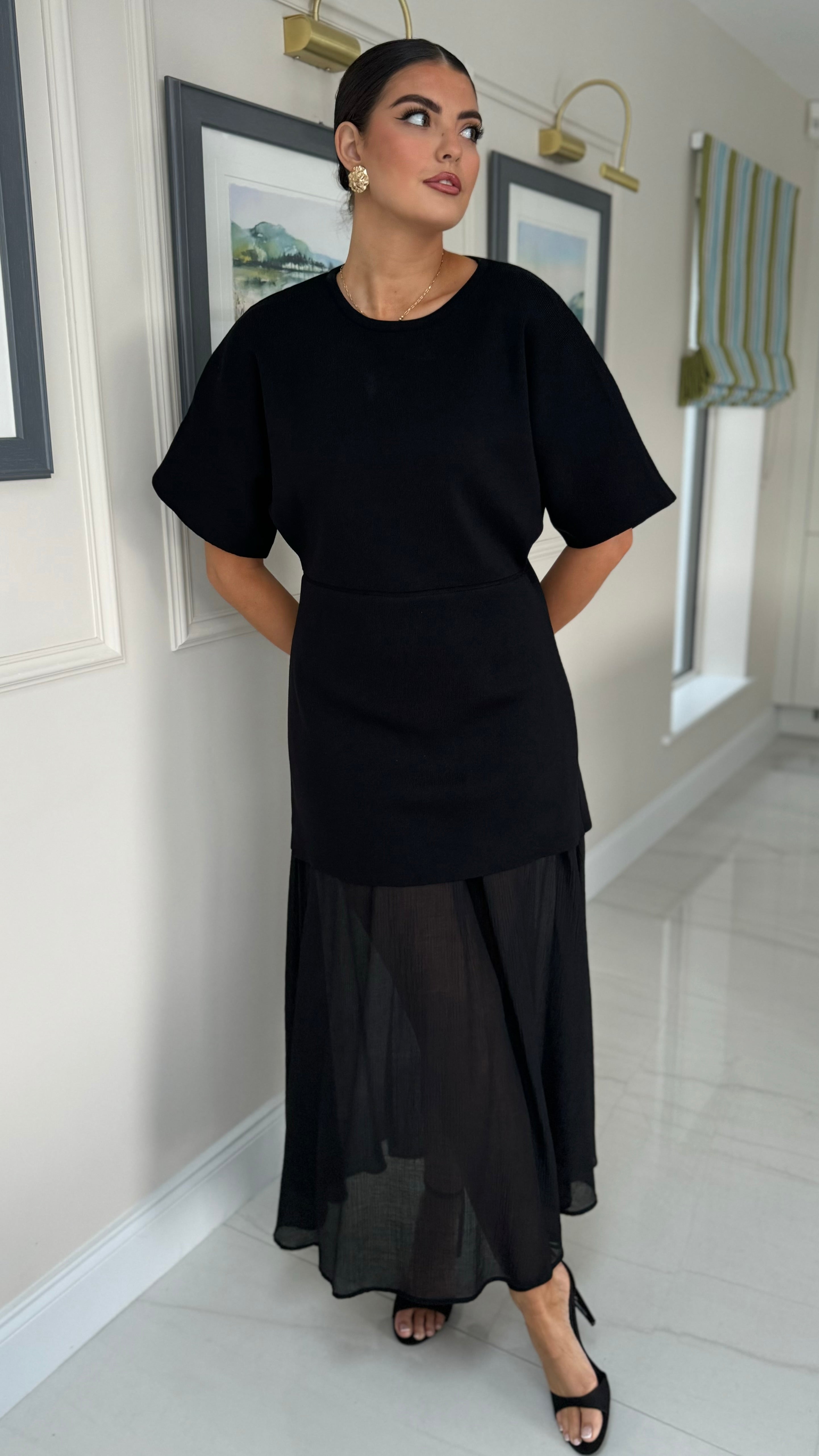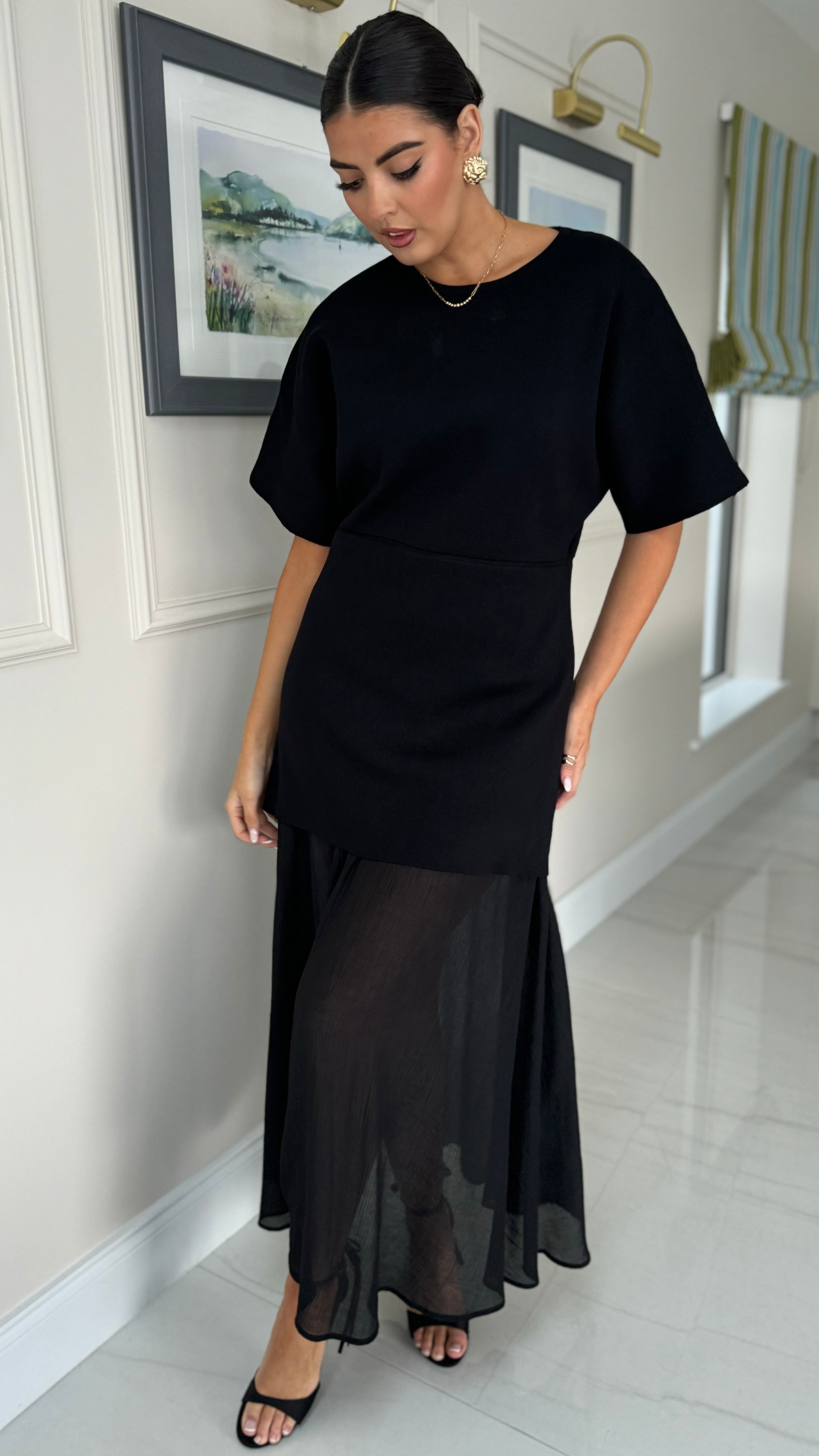 Elevate your style with the Zora Black Maxi Dress, featuring a cozy knitted t-shirt top with playful batwing sleeves and an oversized fit for ultimate comfort. The airy mesh skirt adds a flirty twist, perfect for dressing up with heels or keeping it casual with sneakers. This versatile dress makes it easy to switch from day to night in effortless style.
