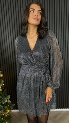 Slip into sparkle and sophistication with this stunning black mini dress. The flattering V neckline draws the eye while long sleeves keep things chic, and those glittery details catch the light beautifully. A cinched waist belt defines your silhouette, while playful side ties let you adjust the fit to perfection. Elasticated cuffs keep sleeves in place all night long, and the lined interior ensures comfort and confidence. Perfect for nights when you want to shine without trying too hard.