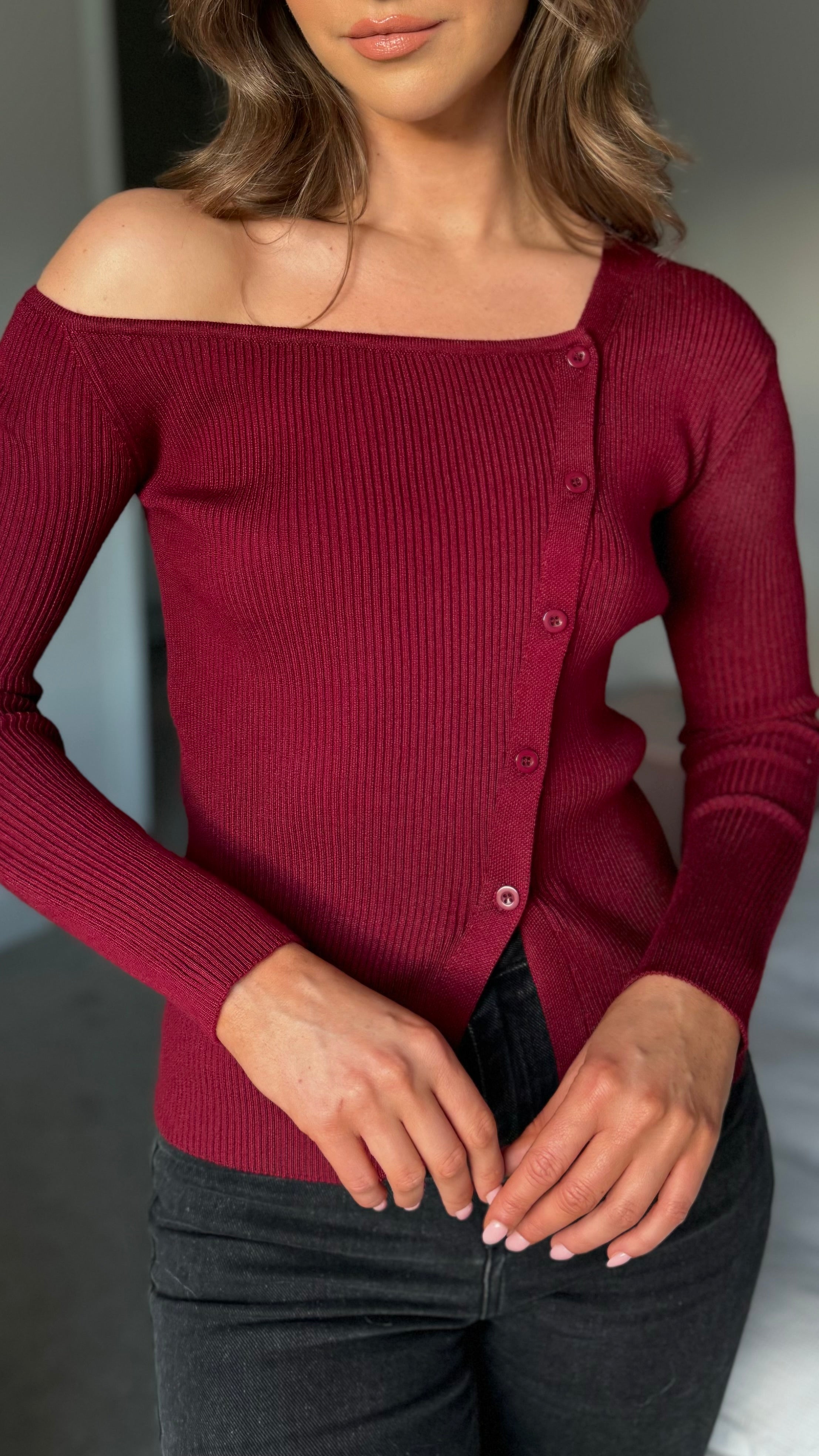 Introducing the Gillie Burgundy Asymmetrical Button Detail Top - the perfect mashup of classic and trendy. This unique top features an asymmetrical design with playful button detailing, adding a touch of quirkiness to your wardrobe. Mix and match with any bottoms for an effortlessly stylish look.