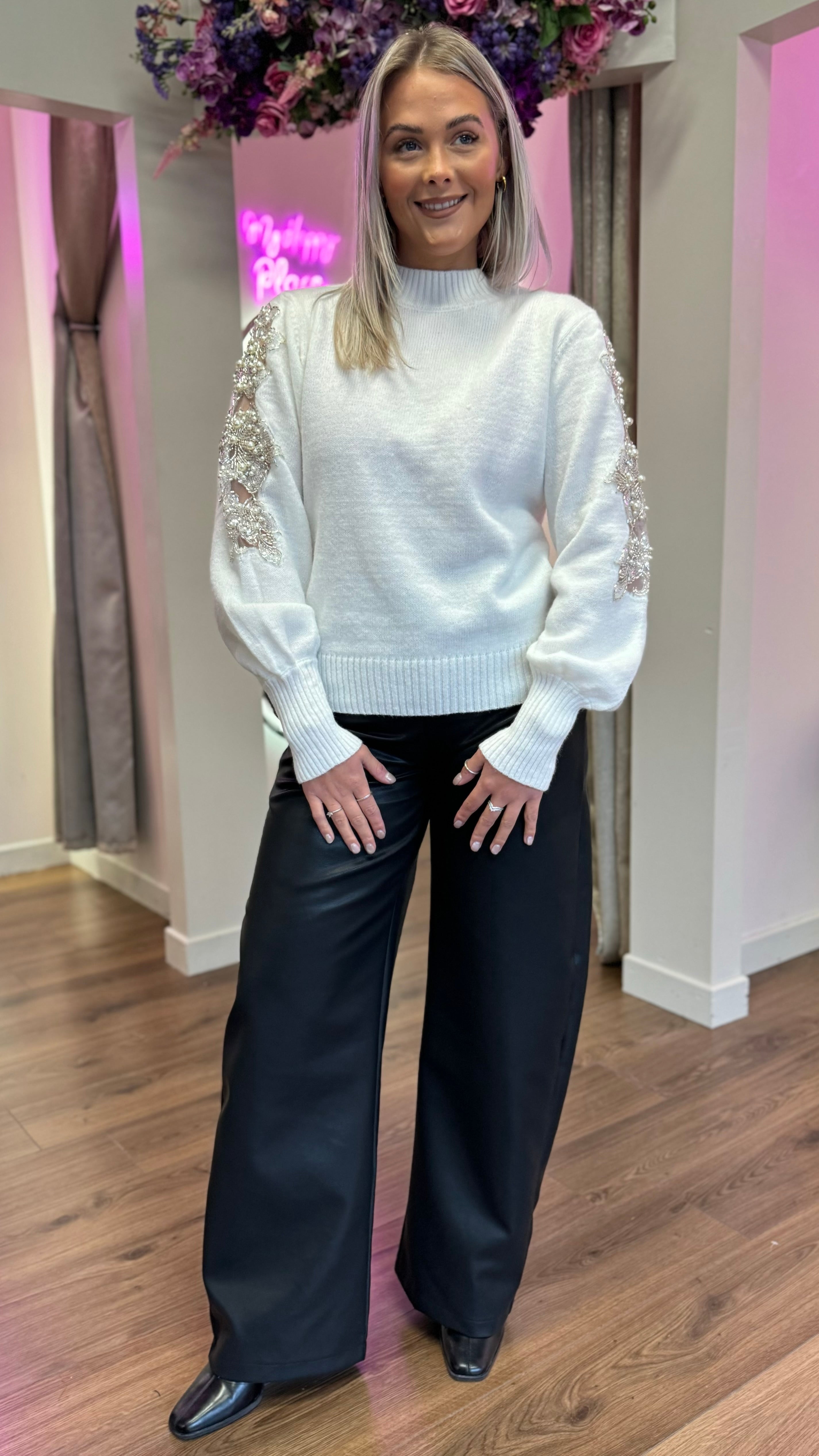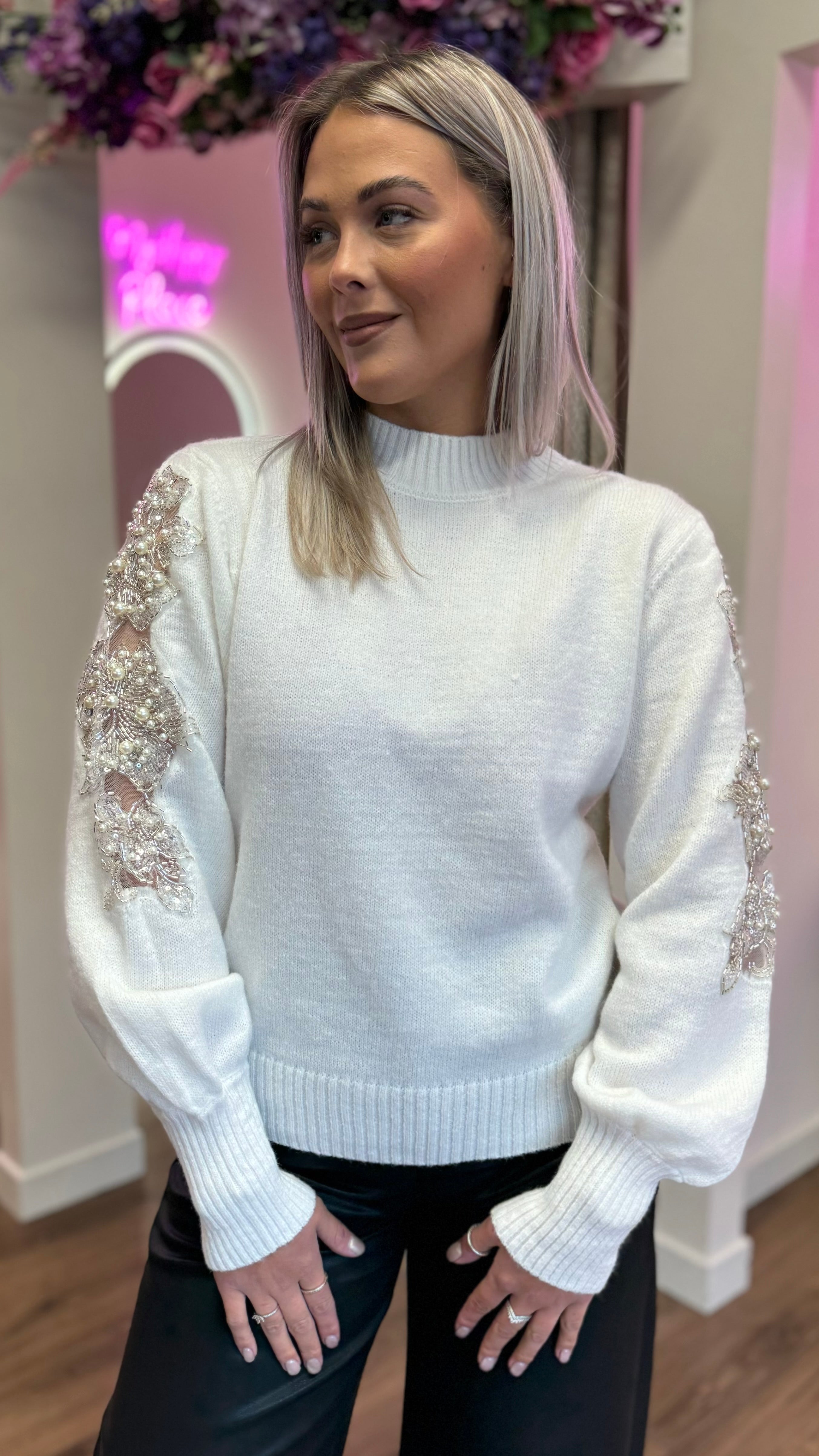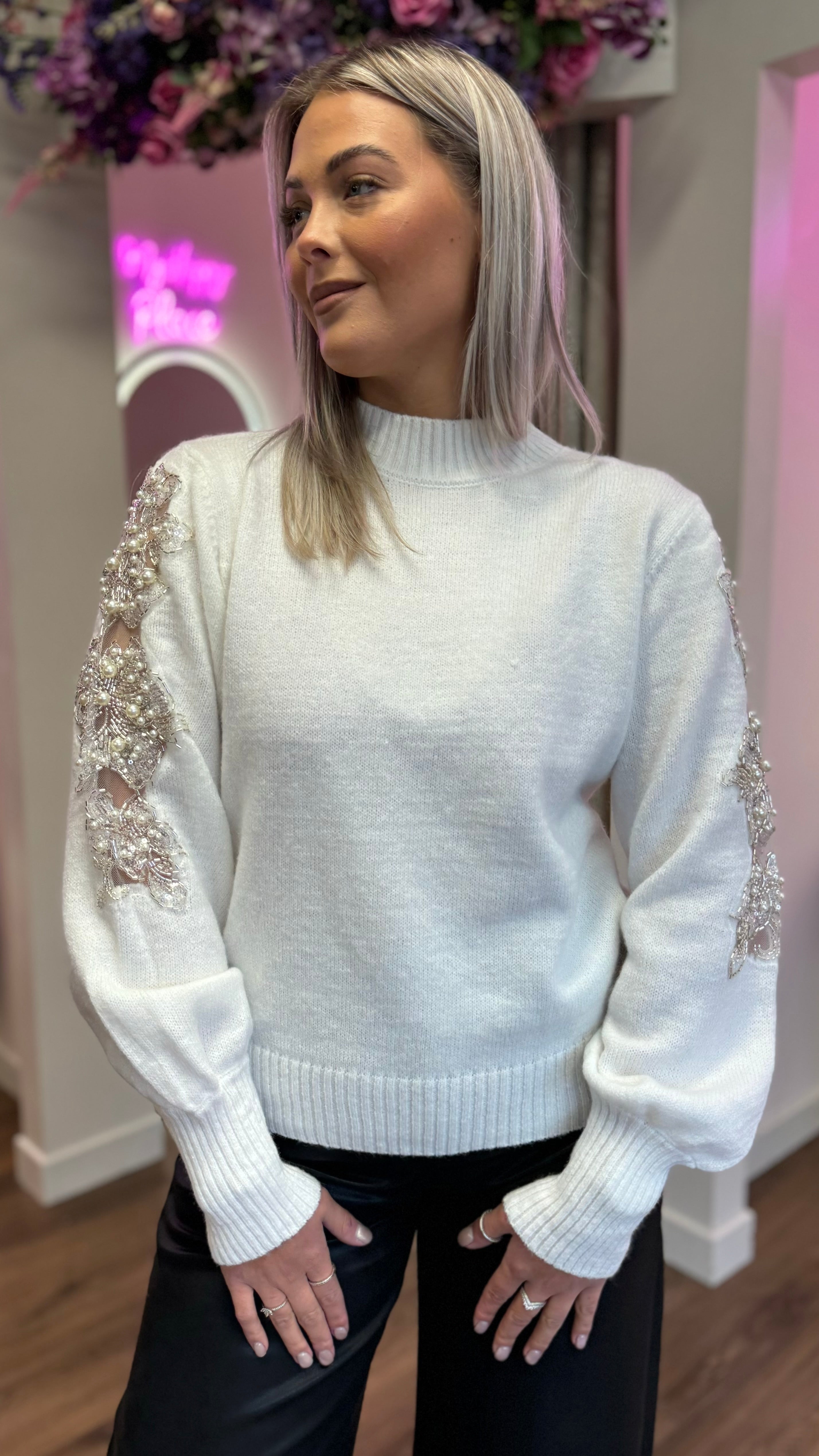 Elevate your knitwear game with this stunning white jumper that's equal parts cosy and glamorous. The high neckline keeps things chic while voluminous balloon sleeves add a playful twist to your everyday look. But here's where it gets magical—intricate pearl and diamante embellishments dance across the sleeves, catching the light with every move. Finished with snug ribbed cuffs for that polished touch, this piece transforms a simple jumper into a statement-making essential that works just as well for brunch as it does for nights out.