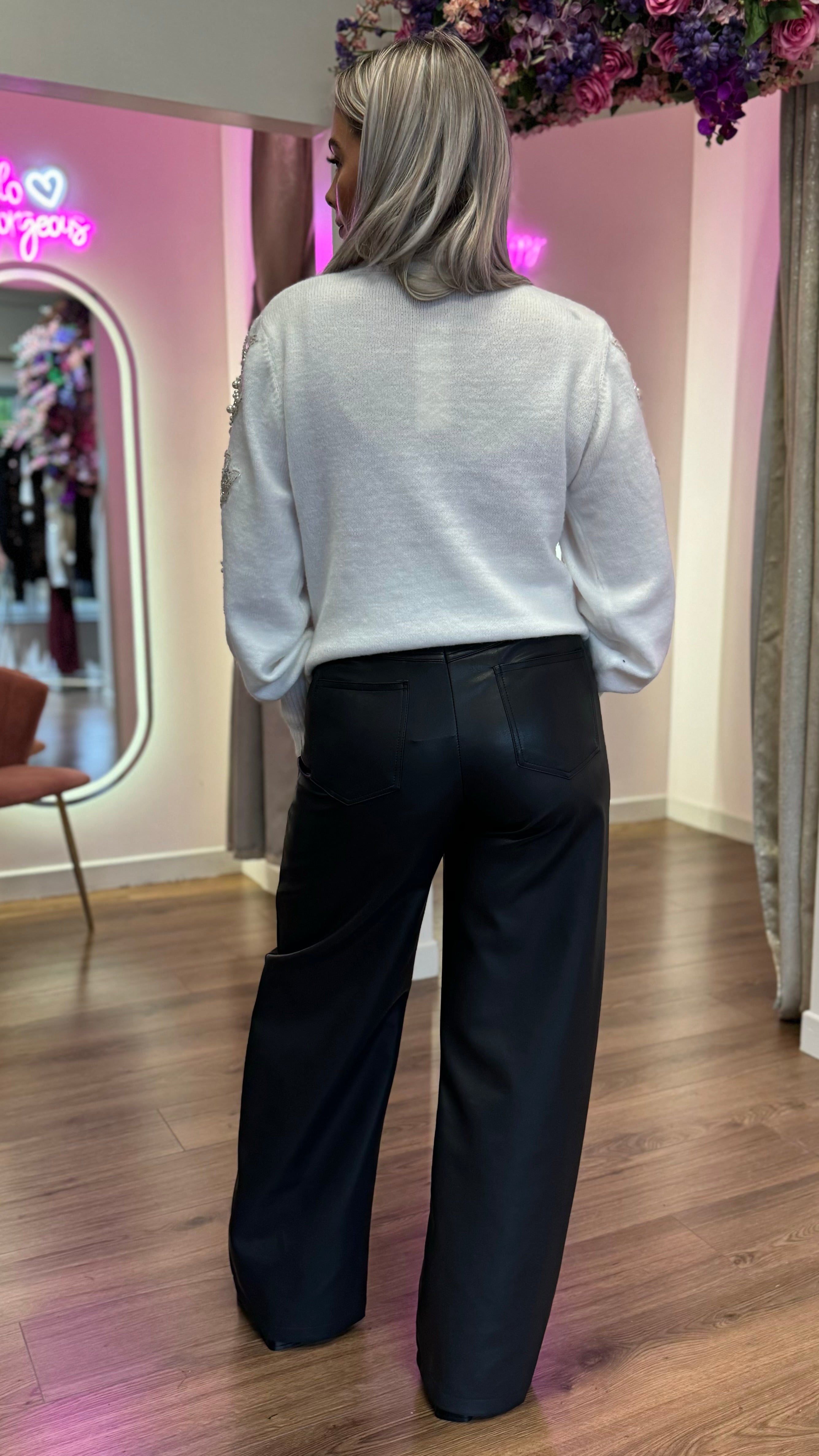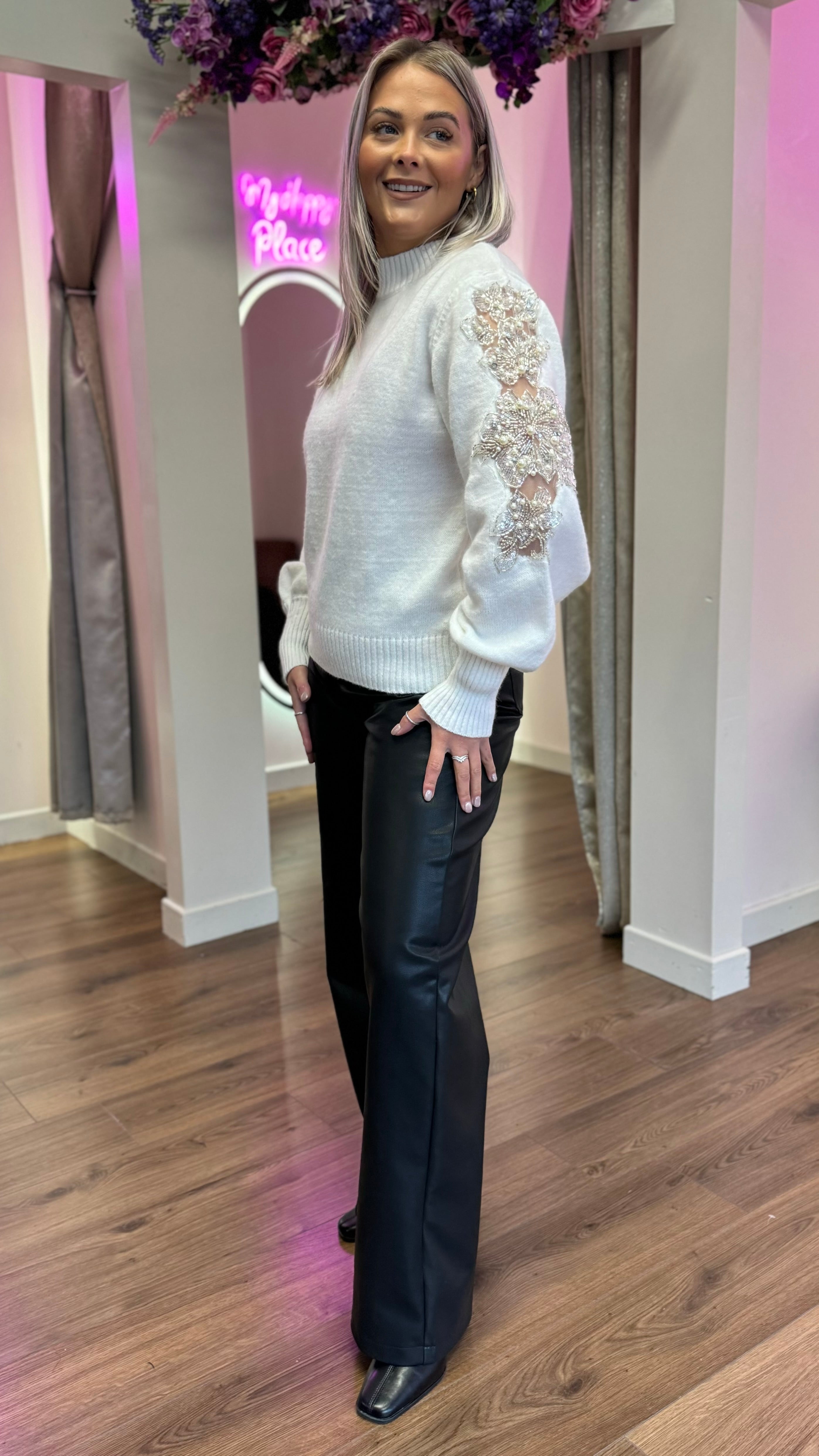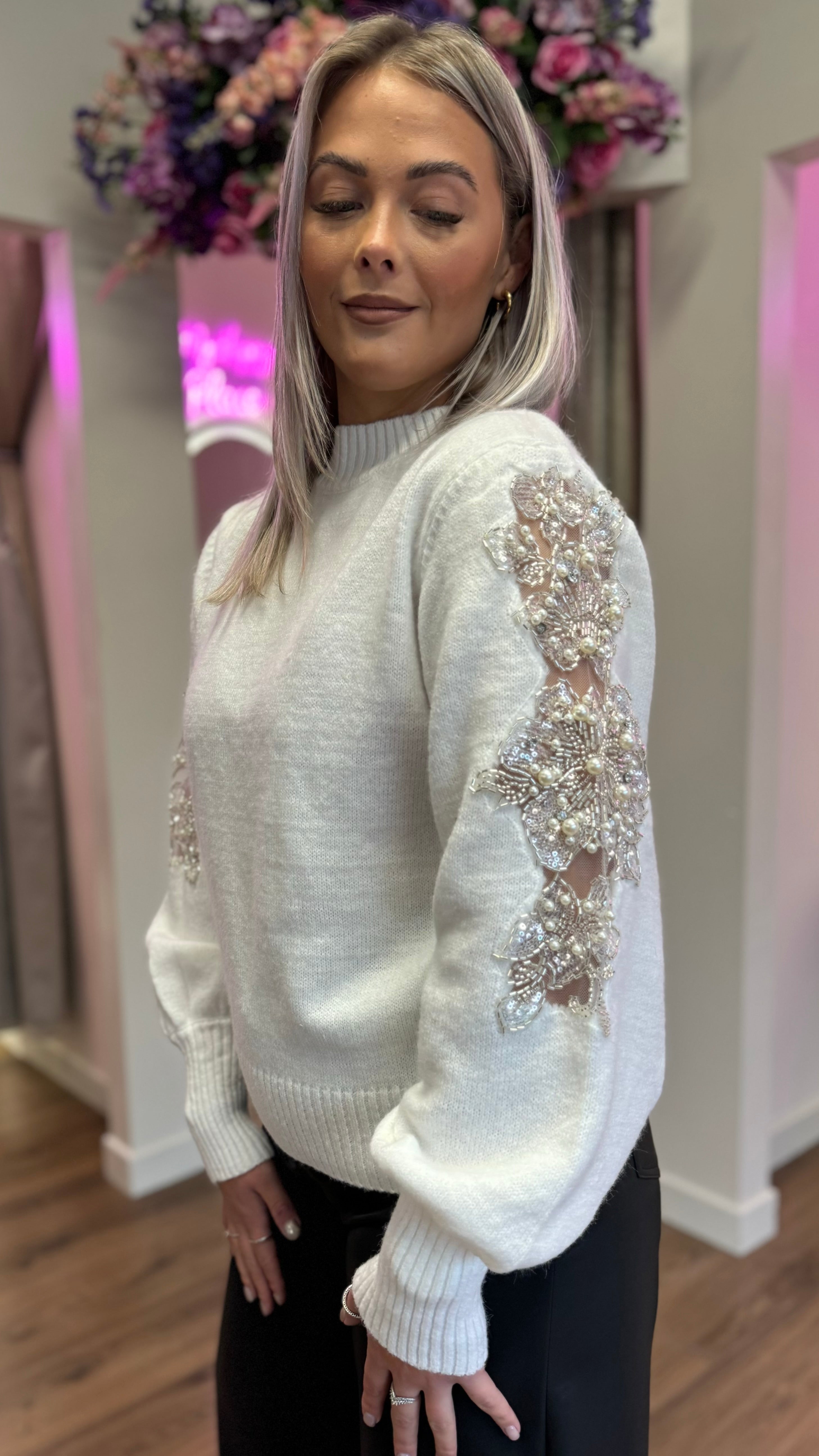 Elevate your knitwear game with this stunning white jumper that's equal parts cosy and glamorous. The high neckline keeps things chic while voluminous balloon sleeves add a playful twist to your everyday look. But here's where it gets magical—intricate pearl and diamante embellishments dance across the sleeves, catching the light with every move. Finished with snug ribbed cuffs for that polished touch, this piece transforms a simple jumper into a statement-making essential that works just as well for brunch as it does for nights out.