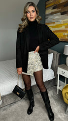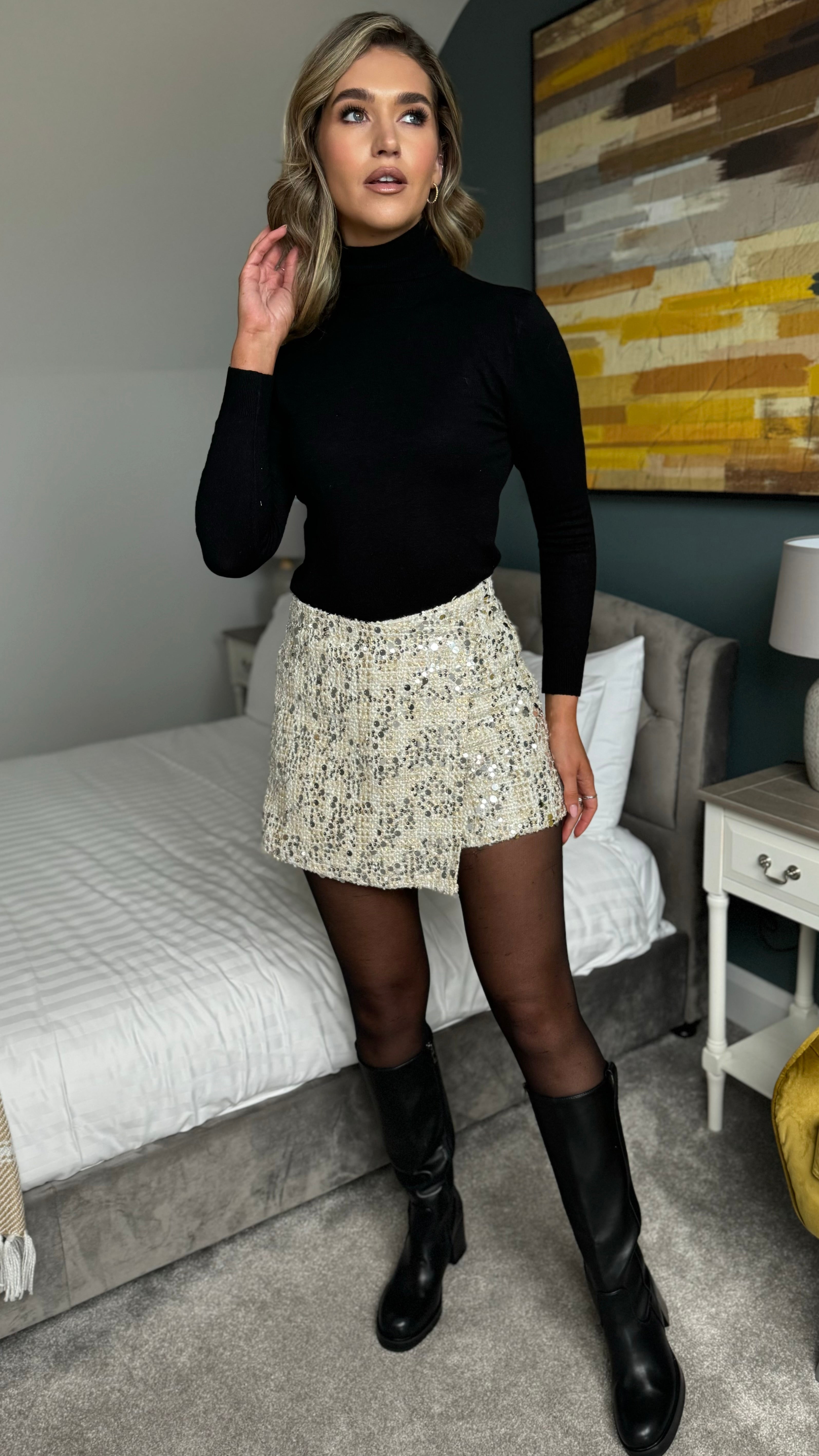 Get ready to sparkle in the Carolyn Beige Sequin Tweed Effect Skort! The tweed effect detail adds a touch of sophistication while the shiny sequin embellishments add a playful twist. Perfect for any occasion, this skort is a unique and stylish addition to your wardrobe.
