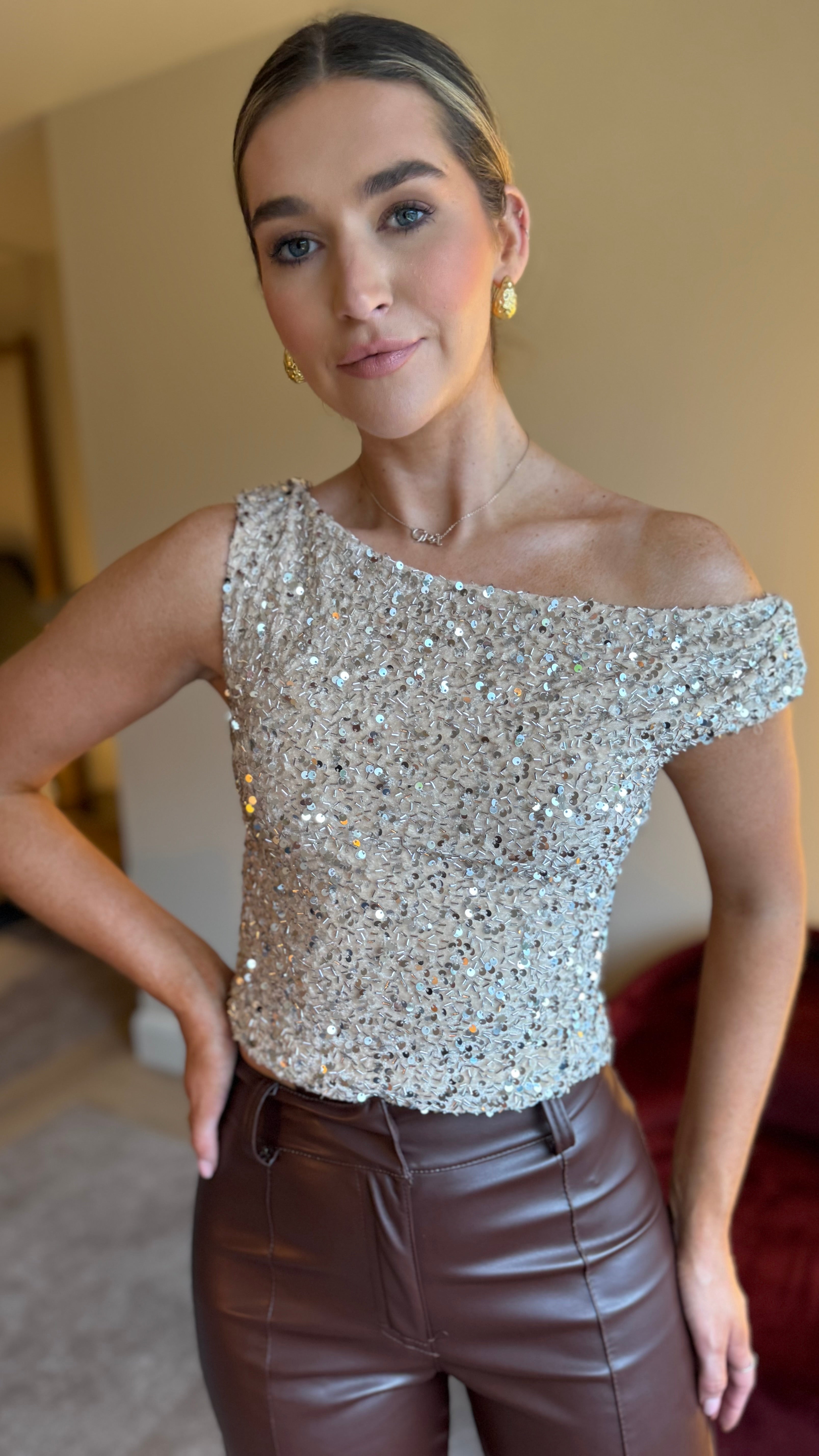 Faya Beige Sequin Off Shoulder Top Sparkle and shine in this show-stopping sequin top! Featuring an off-the-shoulder neckline that's equal parts flirty and fabulous, paired with a sleeveless cut for maximum impact. Covered head-to-toe in shimmering sequins, this crop length beauty is your ticket to turning heads at any occasion. Whether you're hitting the dance floor or stealing the spotlight at a night out, this top delivers pure glam with a playful twist.