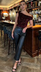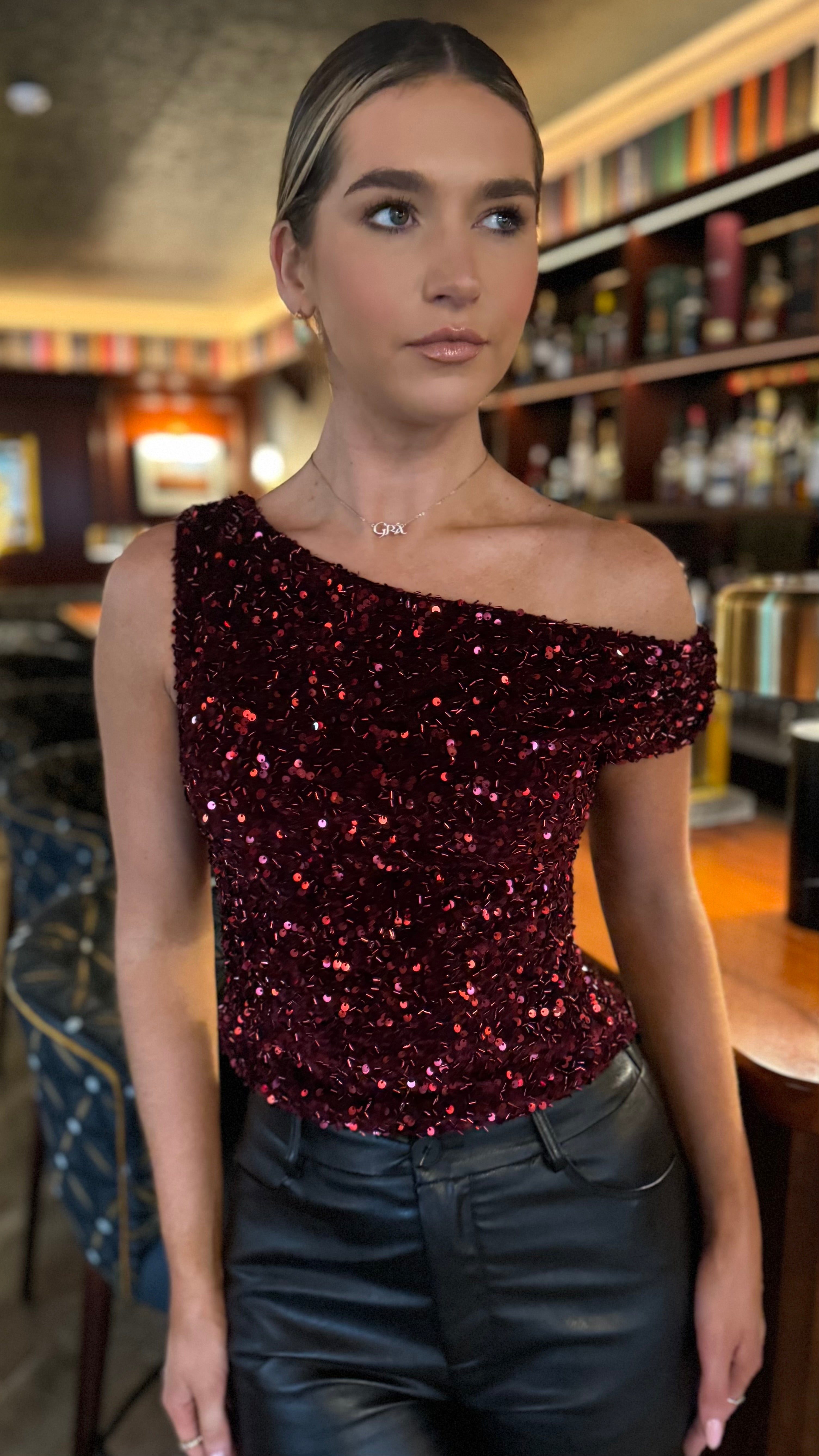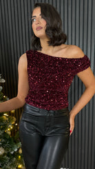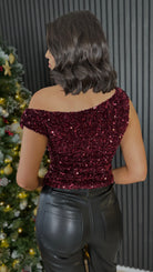 Faya Burgundy Sequin Off Shoulder Top Sparkle and shine in this show-stopping sequin top! Featuring an off-the-shoulder neckline that's equal parts flirty and fabulous, paired with a sleeveless cut for maximum impact. Covered head-to-toe in shimmering sequins, this crop length beauty is your ticket to turning heads at any occasion. Whether you're hitting the dance floor or stealing the spotlight at a night out, this top delivers pure glam with a playful twist.