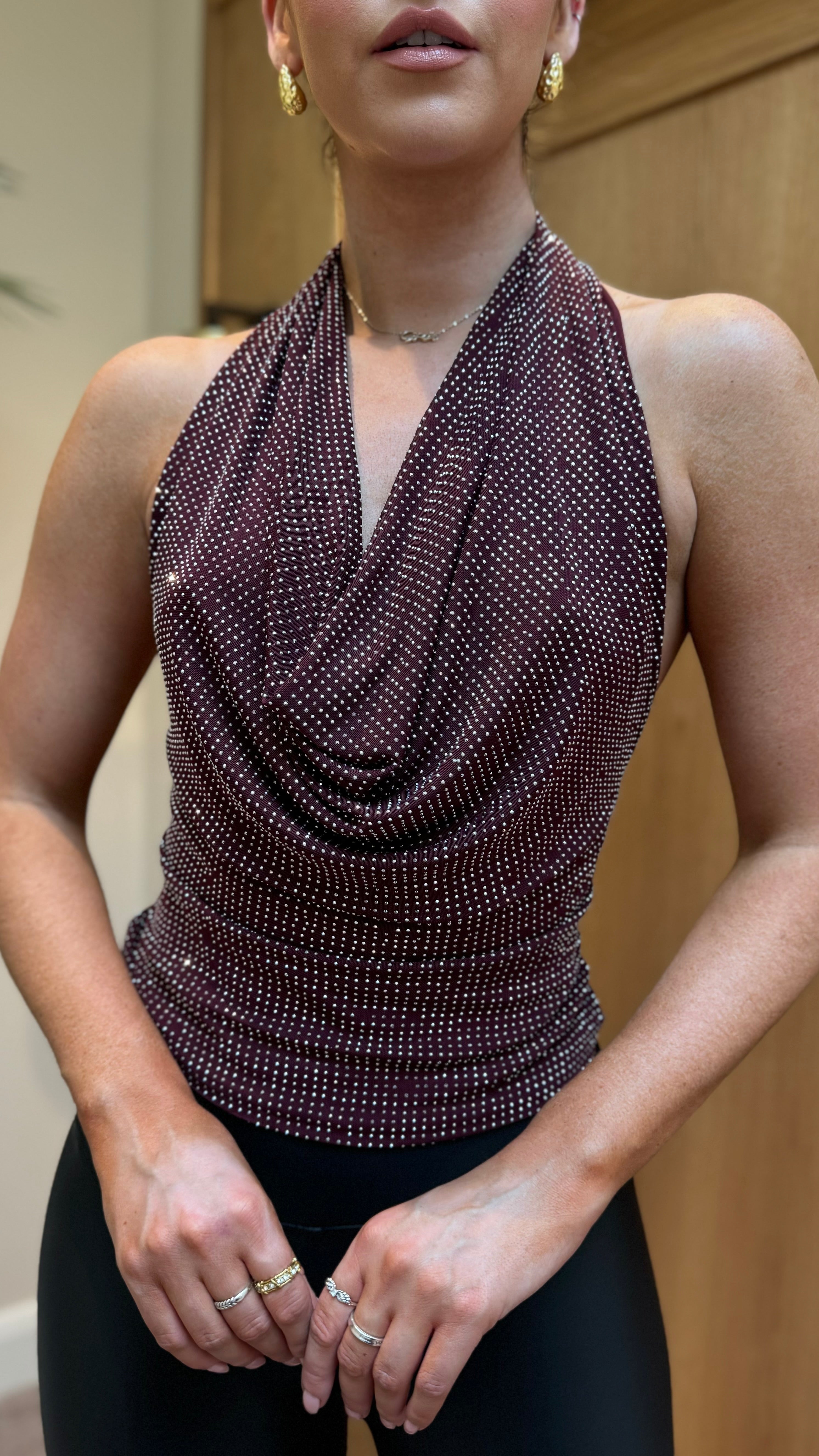 Get ready for some serious sparkle with our Naveen Plum Diamanté Studded Halterneck Top! This halterneck style features a flattering ruched design and is adorned with diamanté studs for a touch of glam. And with its cropped length, it's the perfect top for a fun night out. Shine on, babe!