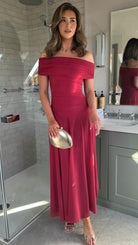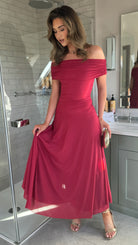 Effortlessly elegant, the Emma Red Off Shoulder Flared Maxi Dress combines romantic styling with contemporary ease. The gathered off-shoulder neckline creates a flattering, feminine silhouette, while the pleated skirt adds graceful movement and dimension. A drop-waist design elongates your frame, and the maxi length delivers sophisticated coverage perfect for evening occasions or special events. Crafted for those who appreciate timeless pieces with modern appeal.