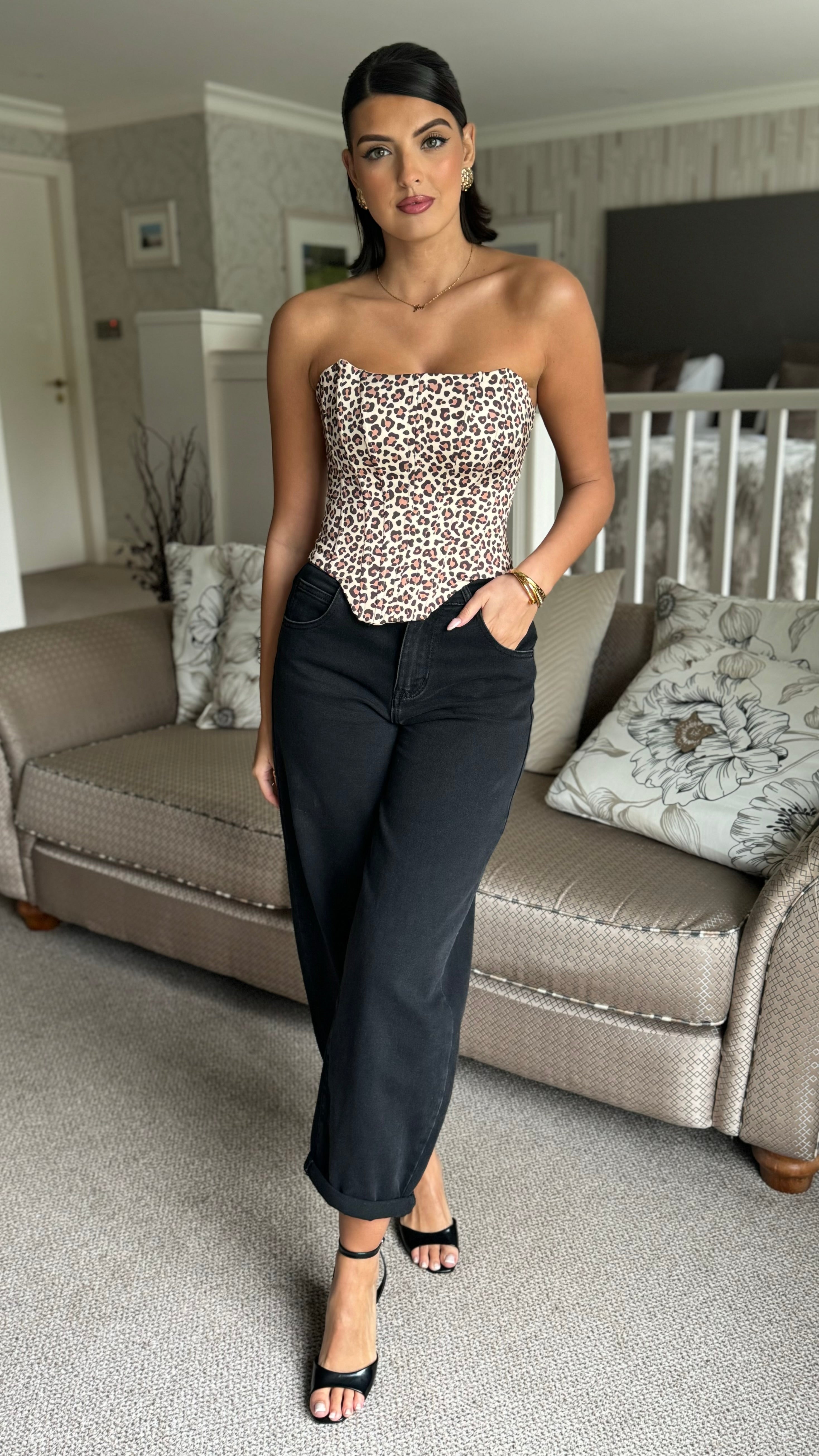 Structured corset top with a bandeau silhouette and striking leopard print. Features a lace-up fastening at the back for adjustable fit and a flattering, sculpted neckline. Perfect for layering under sheer pieces or wearing as a statement top. The fitted design offers support and definition, making it an versatile addition to any wardrobe.