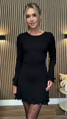 This Biddy Black Knitted Mini Dress combines cozy ribbed fabric with charming frill details for a playful, flirty look. Its round neckline and bell sleeves add a whimsical touch, while the frill hem completes the fun, feminine vibe. Perfect for turning heads with effortless style!