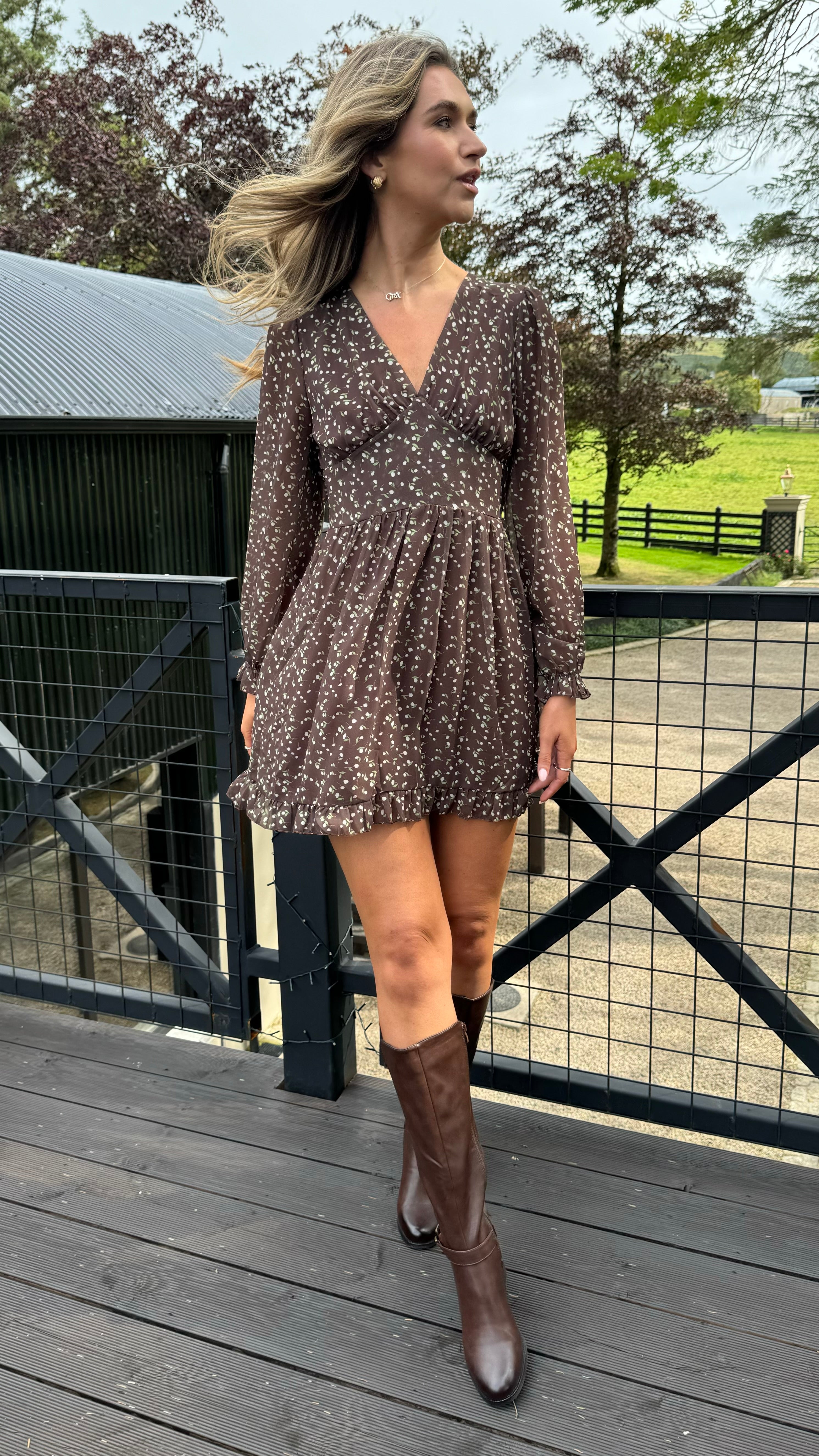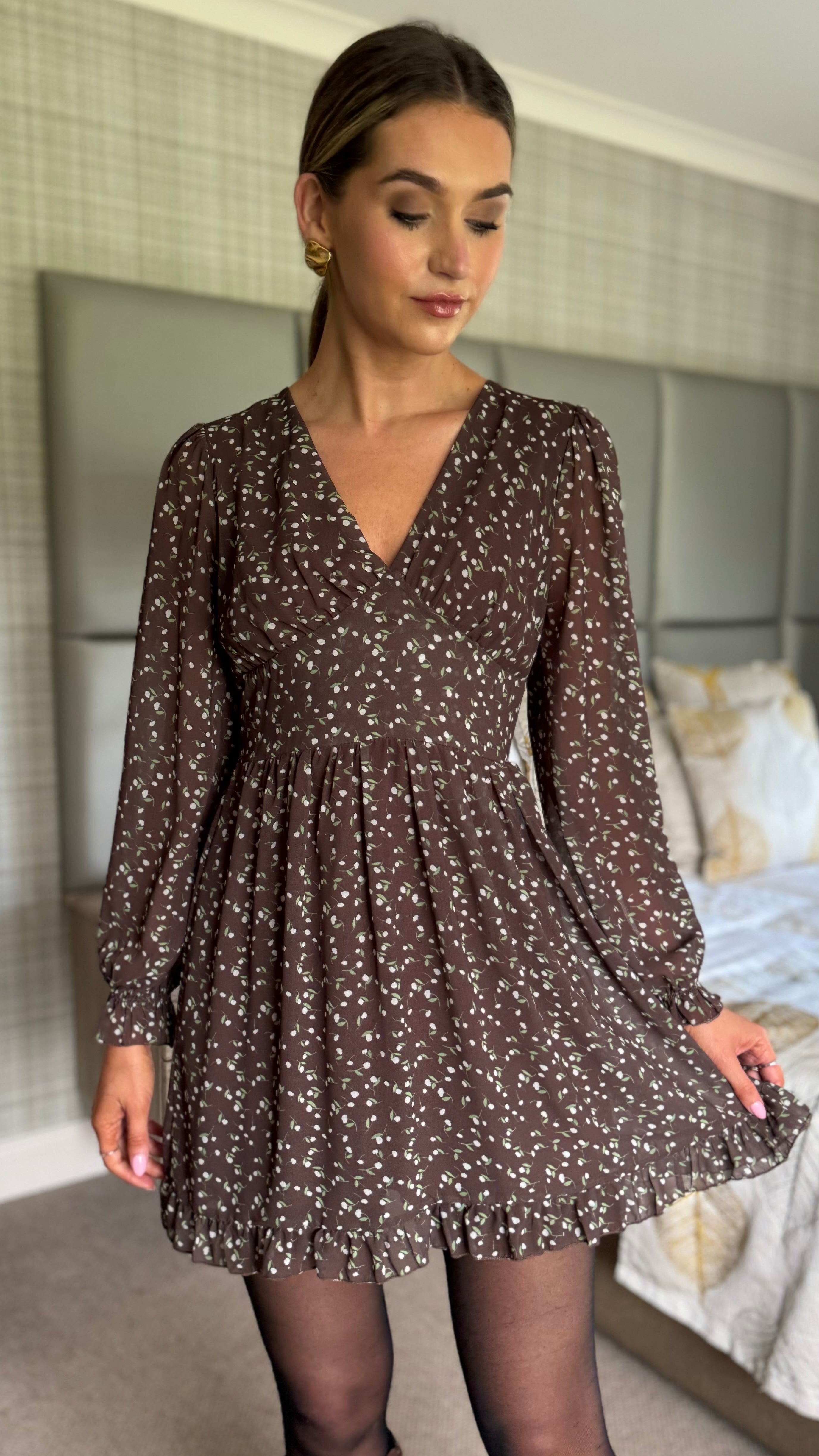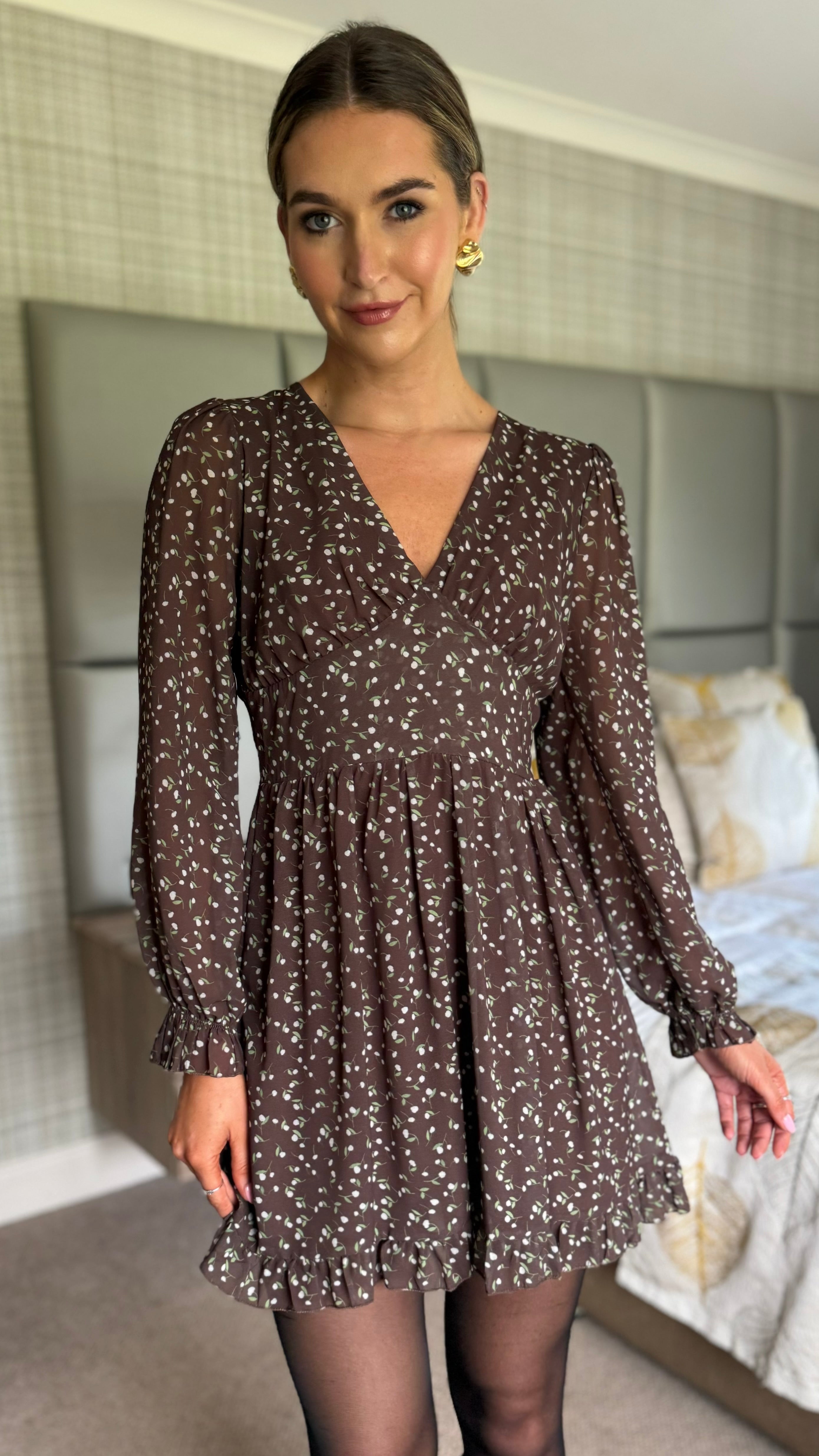 Jenny Brown Ditsy Floral V Neck Mini Dress