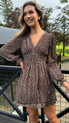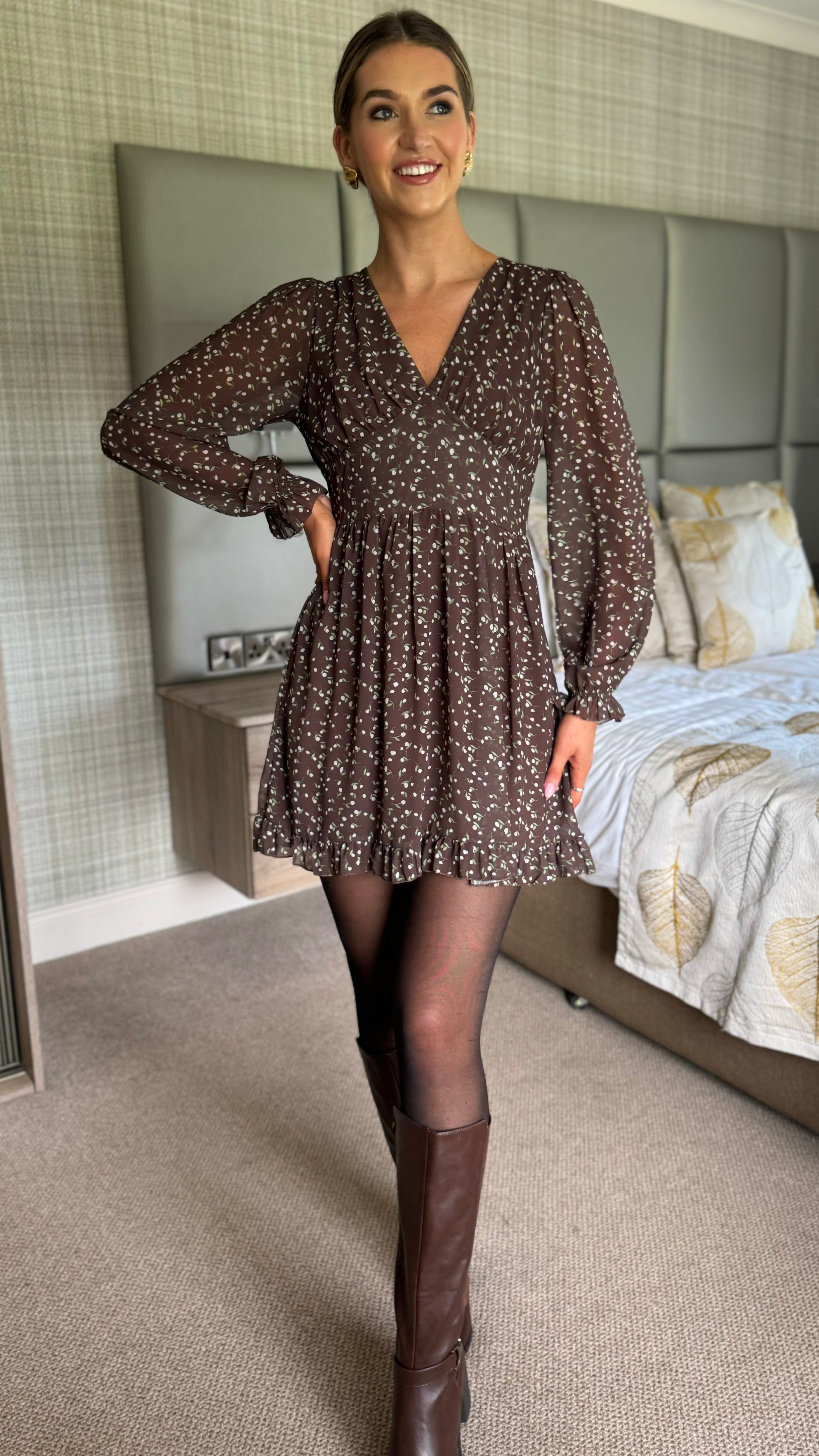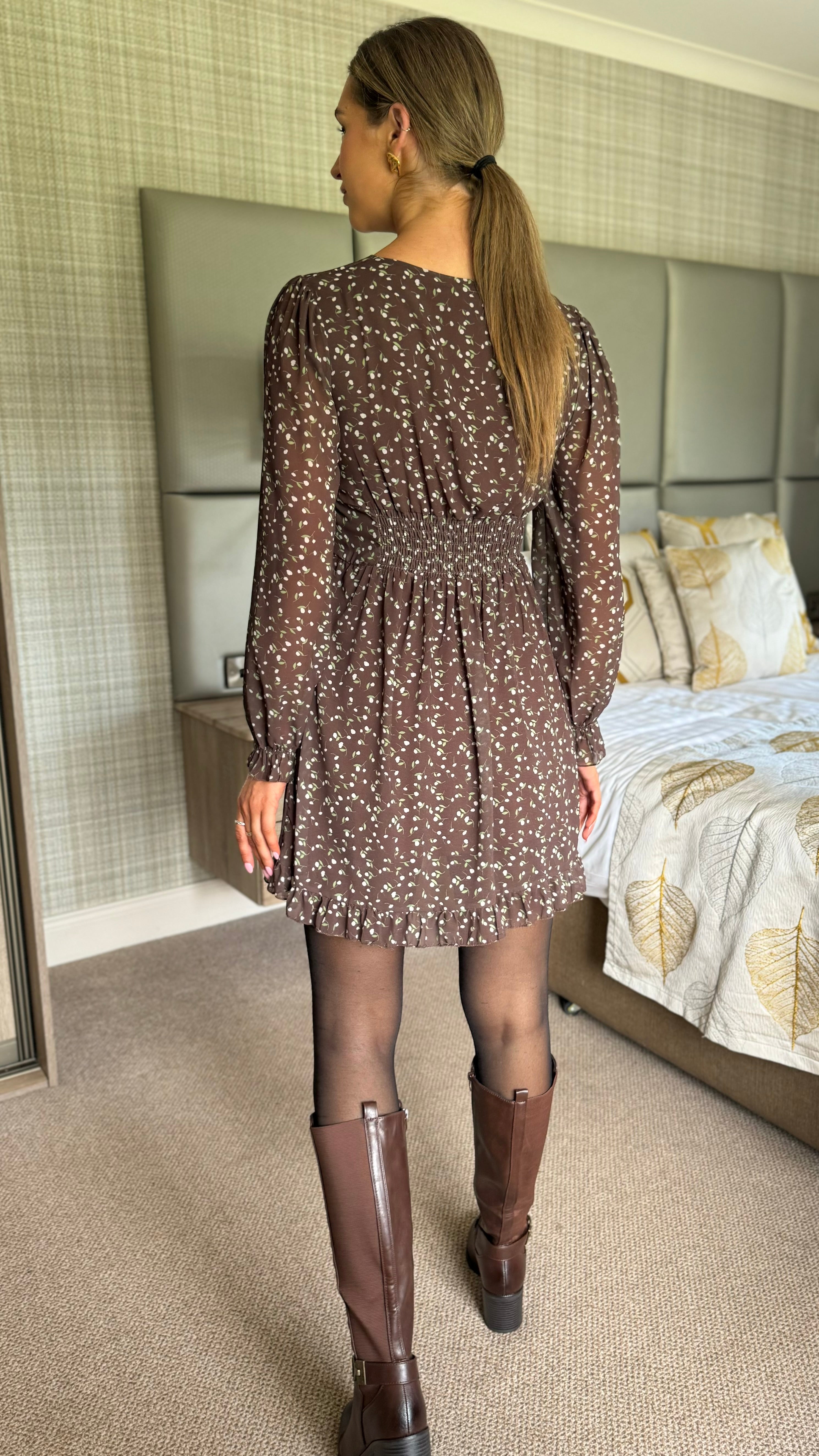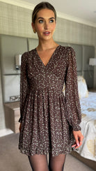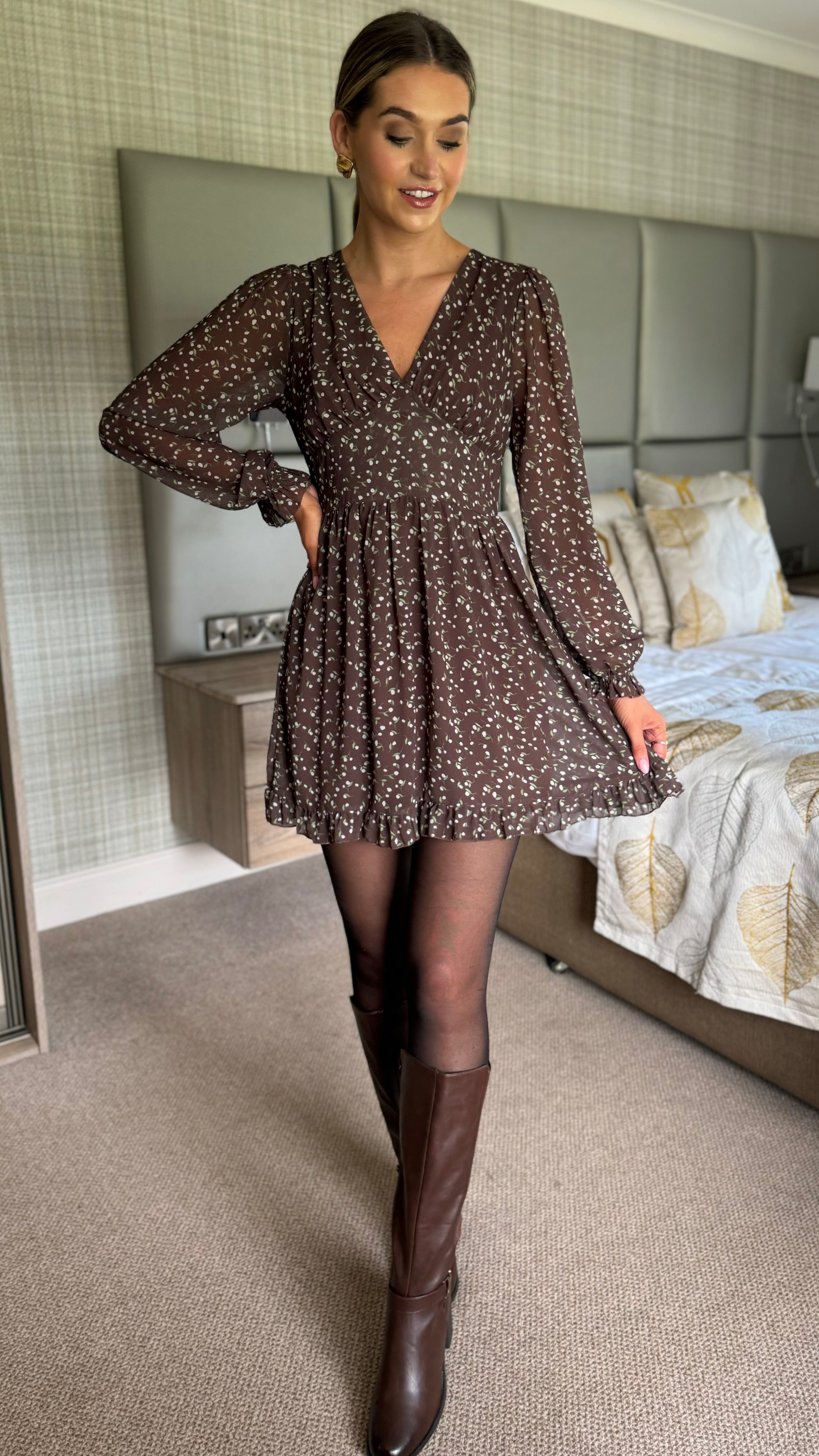 Jenny Brown Ditsy Floral V Neck Mini Dress
