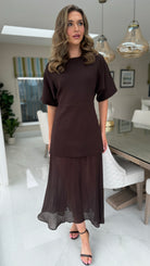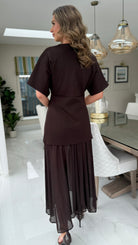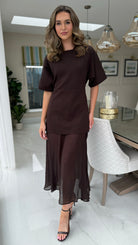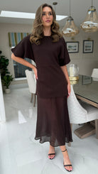 Elevate your style with the Zora Chocolate Brown Maxi Dress, featuring a cozy knitted t-shirt top with playful batwing sleeves and an oversized fit for ultimate comfort. The airy mesh skirt adds a flirty twist, perfect for dressing up with heels or keeping it casual with sneakers. This versatile dress makes it easy to switch from day to night in effortless style.