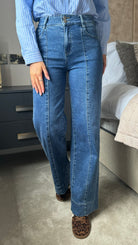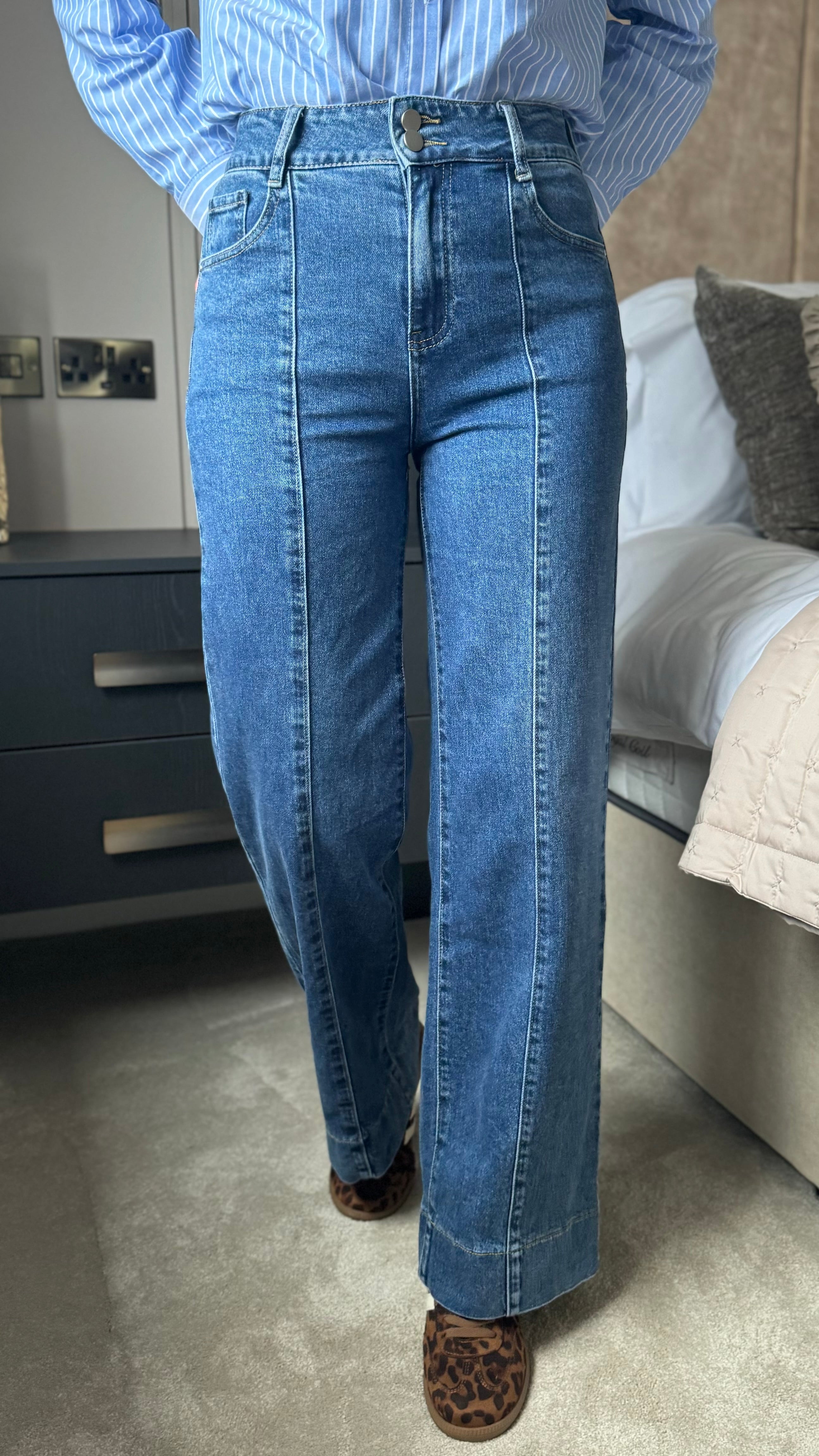 Step out in style with the Briella Blue Denim Front Seam Detail Jeans! Featuring a double-button closure and a flattering high waist, these jeans hug your curves while offering comfort thanks to their soft, stretchy fabric. The standout front seam adds a trendy touch, complemented by handy front and back pockets. Perfect for playful days or casual nights, these jeans bring fun and function together effortlessly.