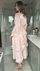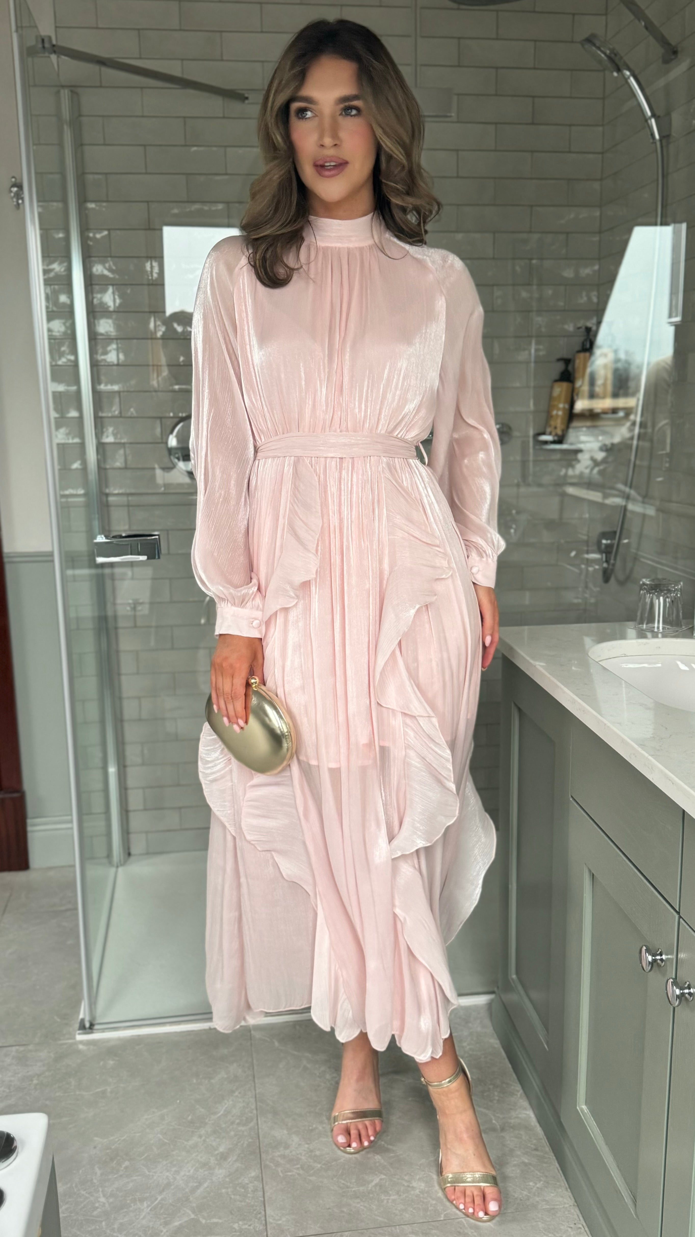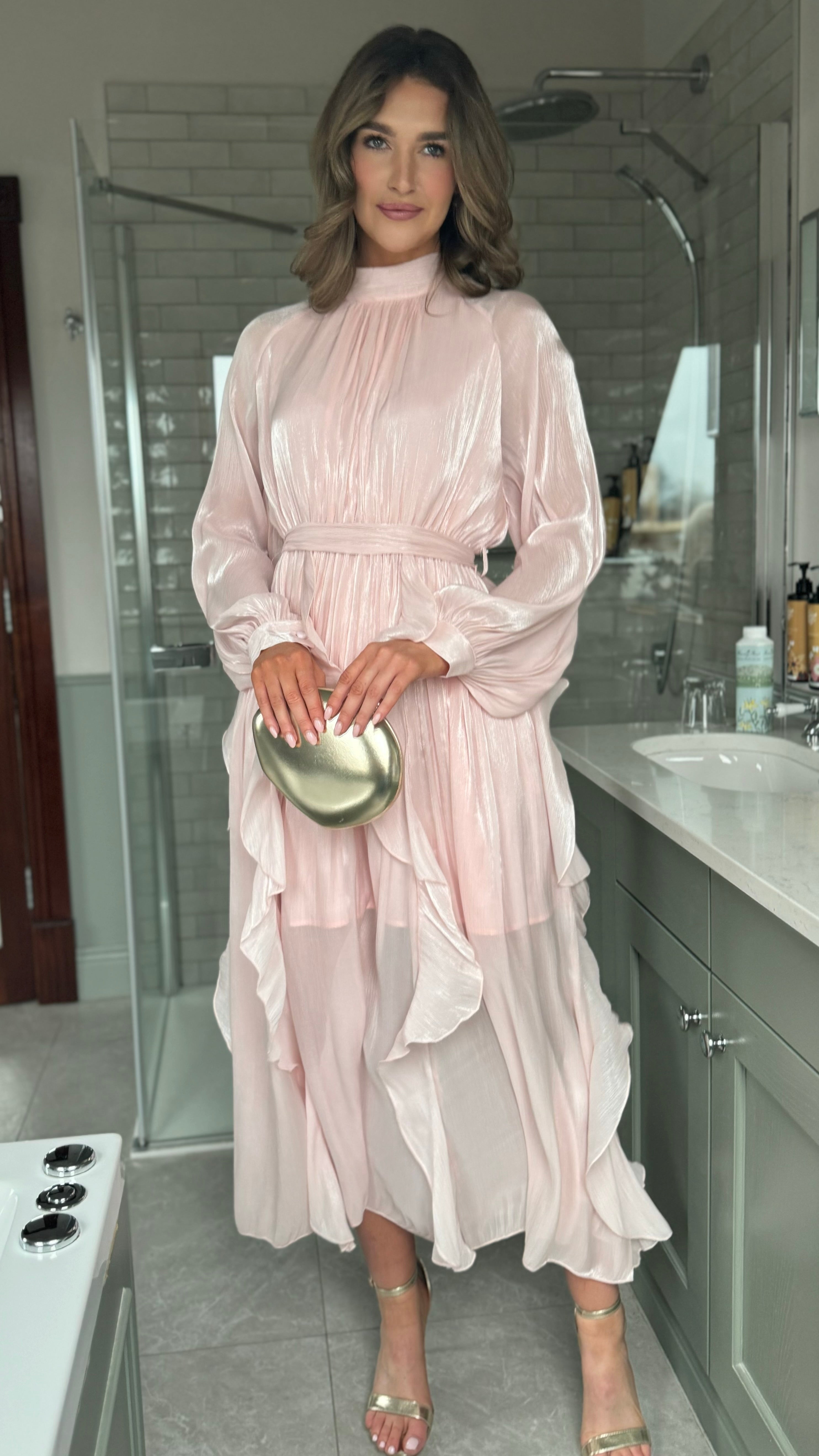 Elevate your wardrobe with the Fernanda Pink Ruffle Maxi Dress—a playful take on timeless elegance. This statement piece features a charming high neckline and dramatic balloon sleeves with button cuffs for a touch of vintage-inspired flair. The voluminous ruffle skirt cascades to maxi length, while the adjustable tie at the back of the neck ensures a custom fit. An elasticated waistband provides comfort throughout the day, and the silky sheer fabric is fully lined for confidence and ease. Perfect for garden parties, special occasions, or whenever you want to turn heads with effortless style.