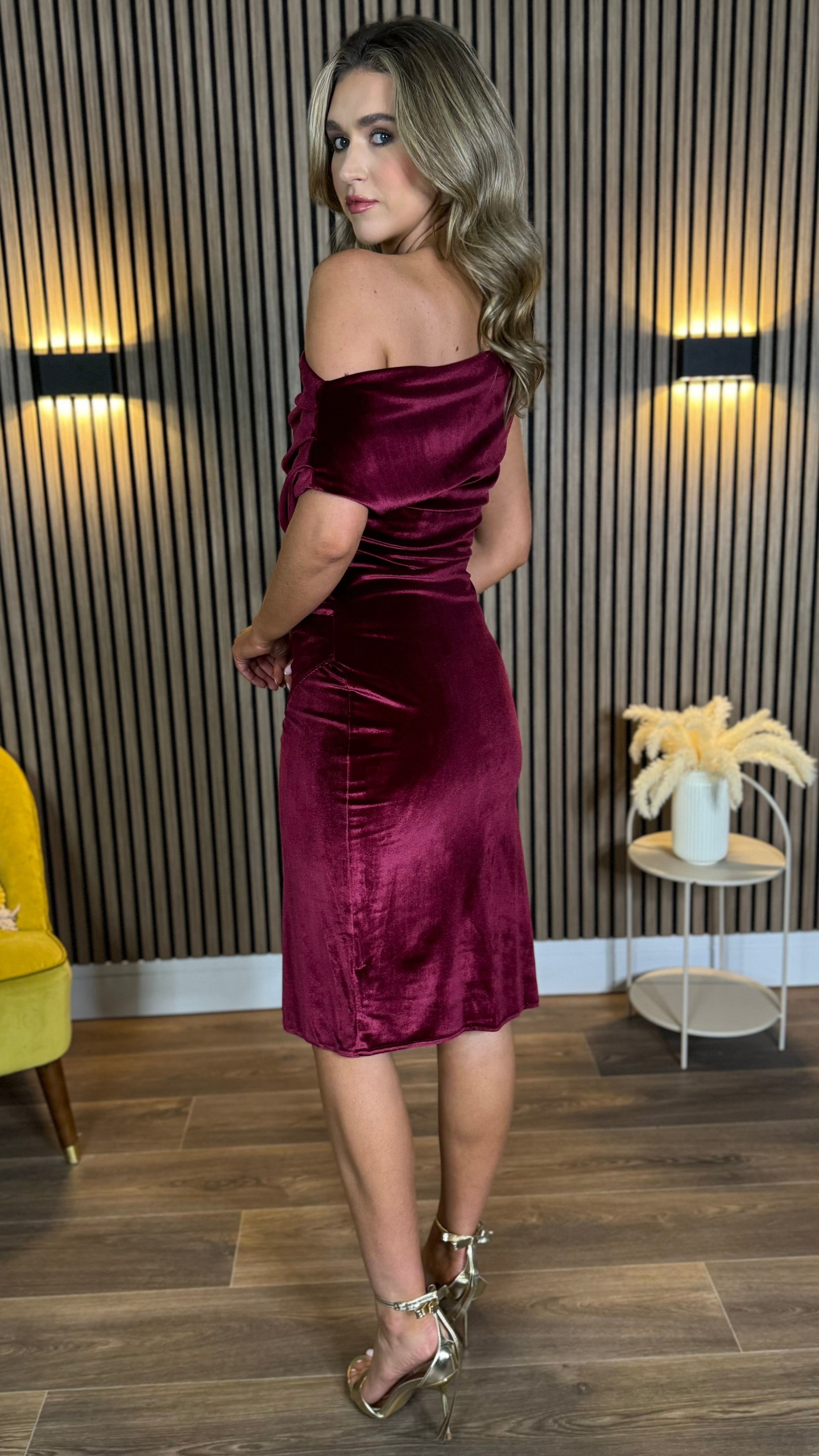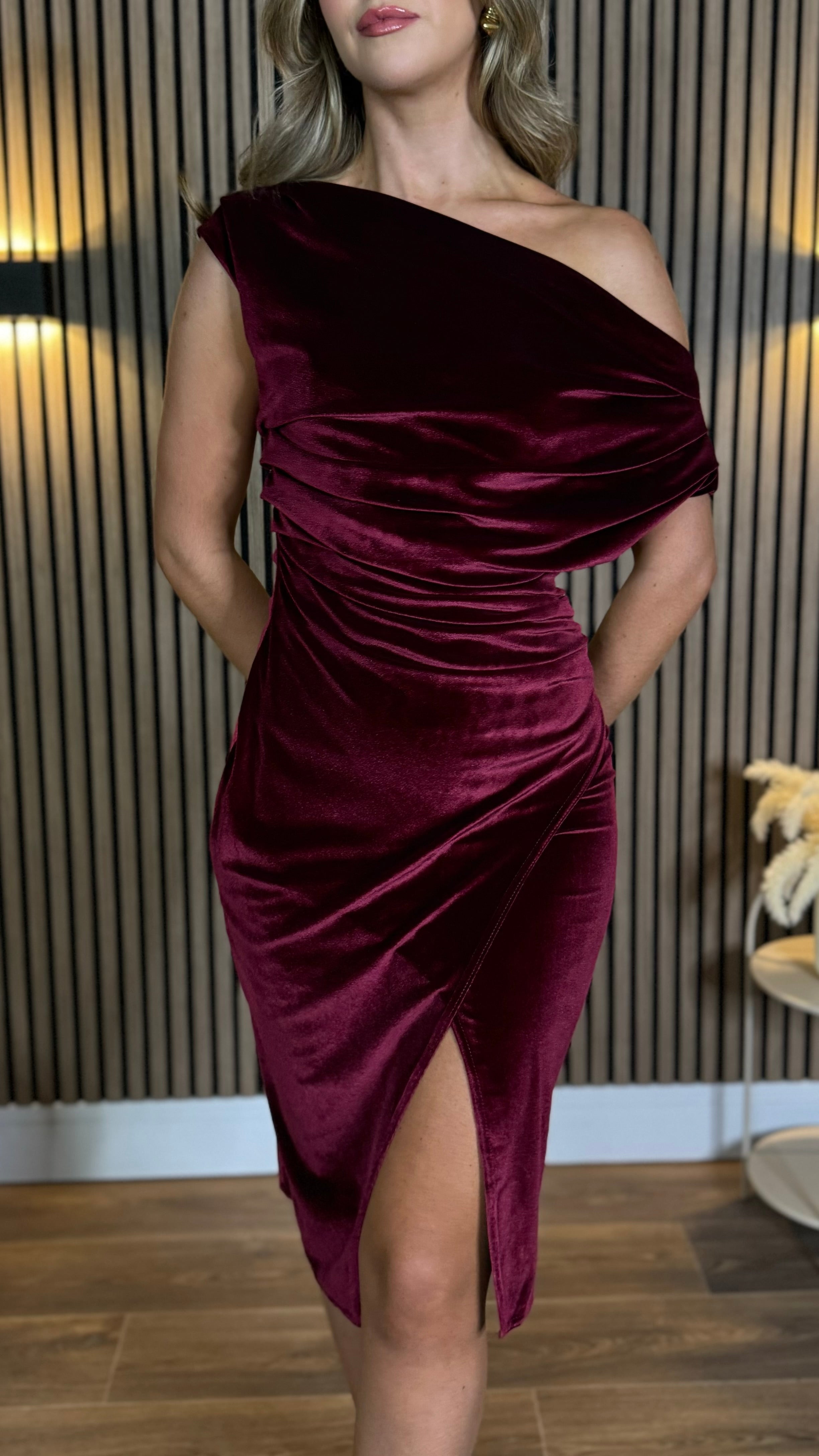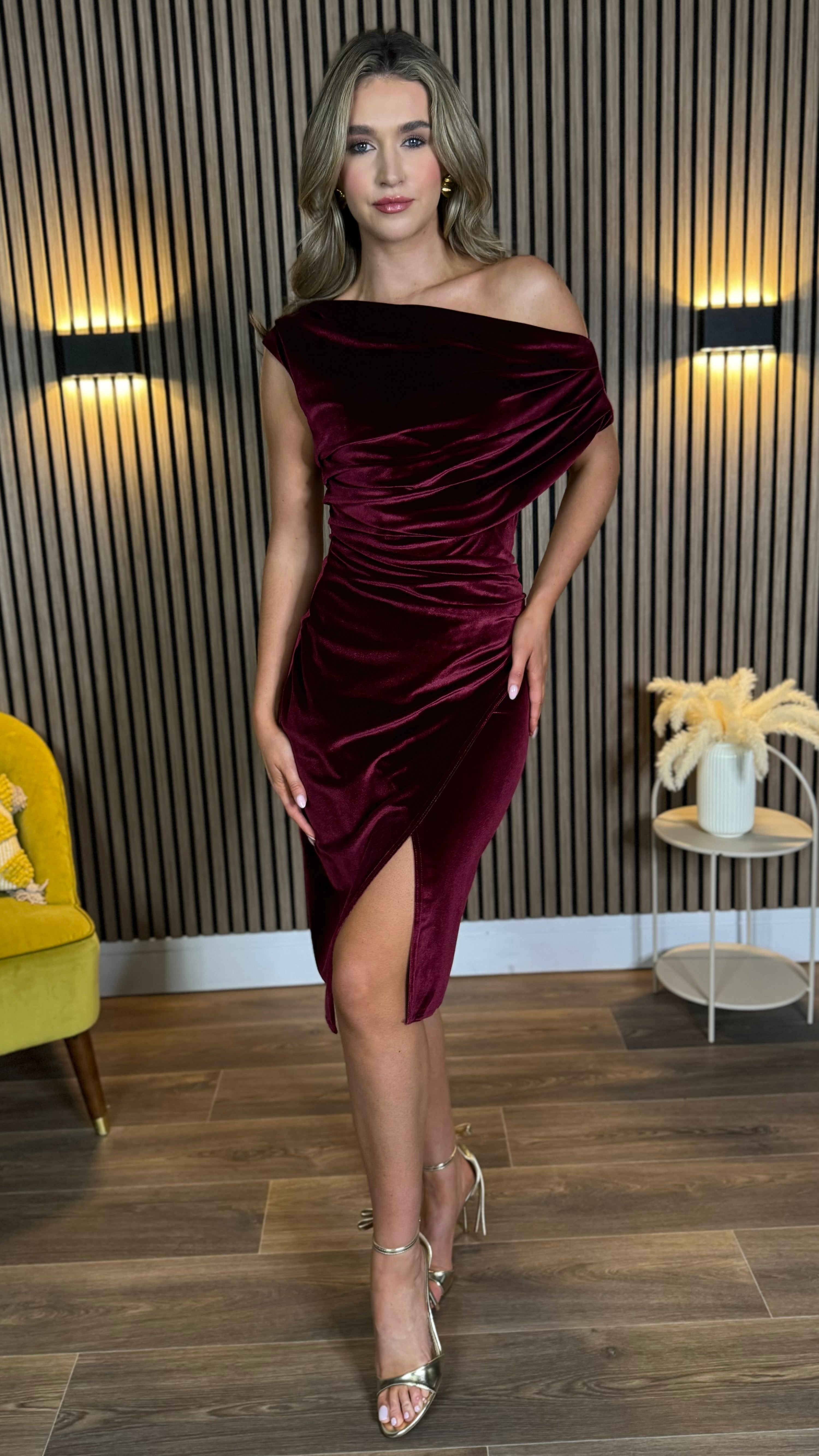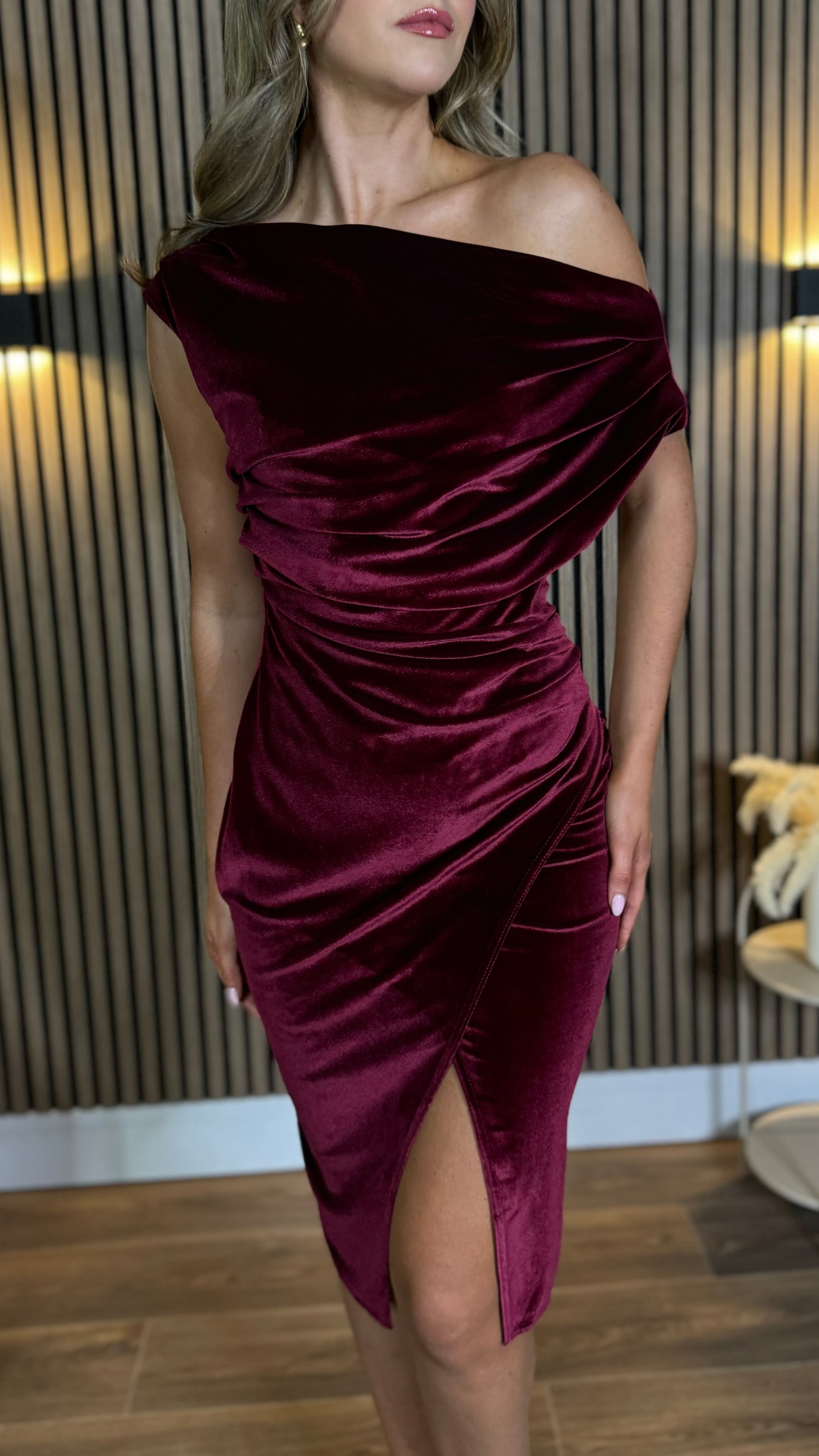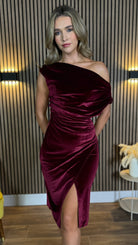 Slip into sophistication with this stunning wine velvet midi dress that's equal parts glamorous and fun. The asymmetric neckline creates an effortlessly chic silhouette, while strategic ruching flatters your figure beautifully. A daring slit detail adds movement and personality to every step, and the concealed zip fastening keeps the look polished and seamless. Perfect for nights out that demand a touch of drama and elegance.