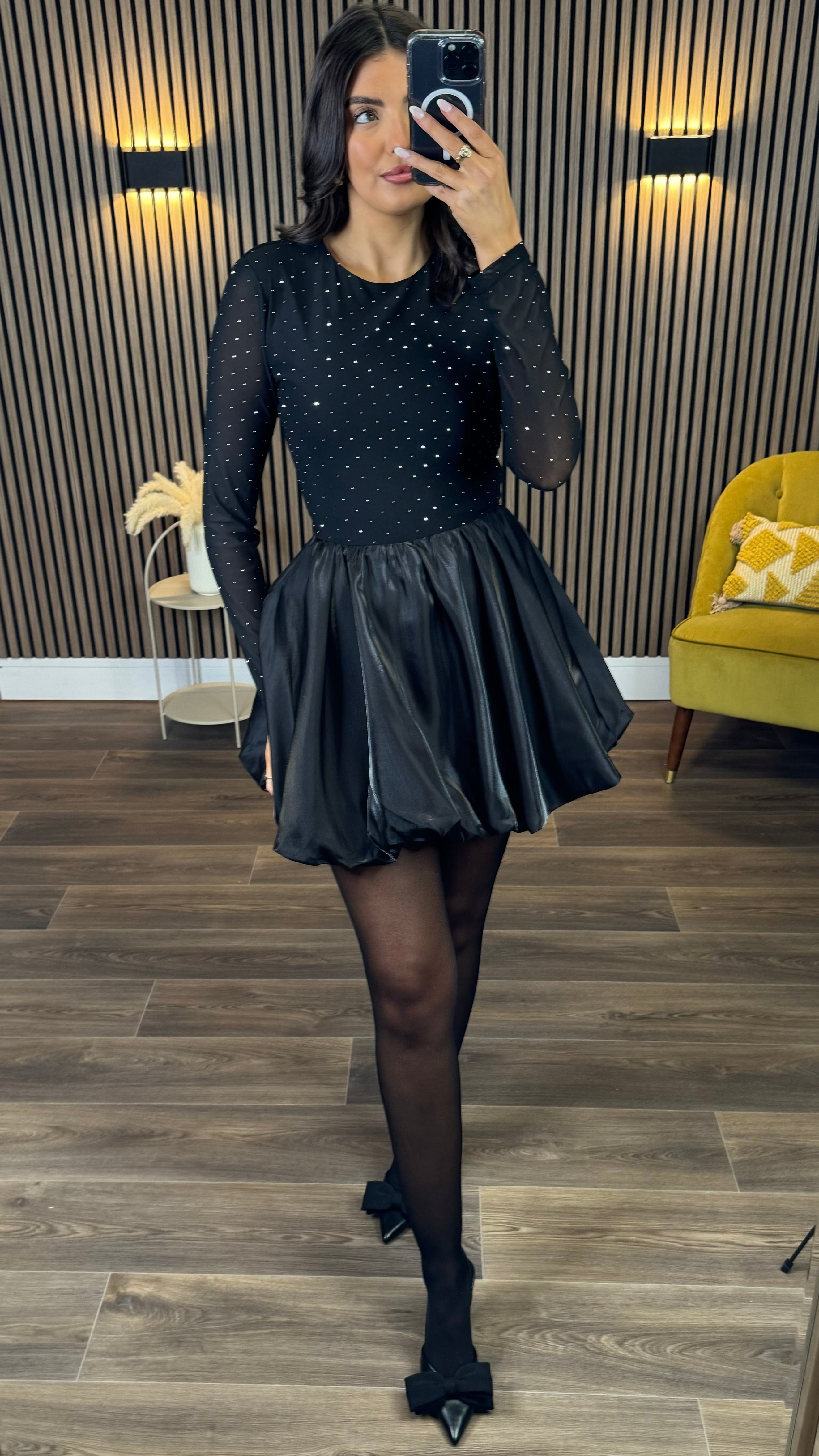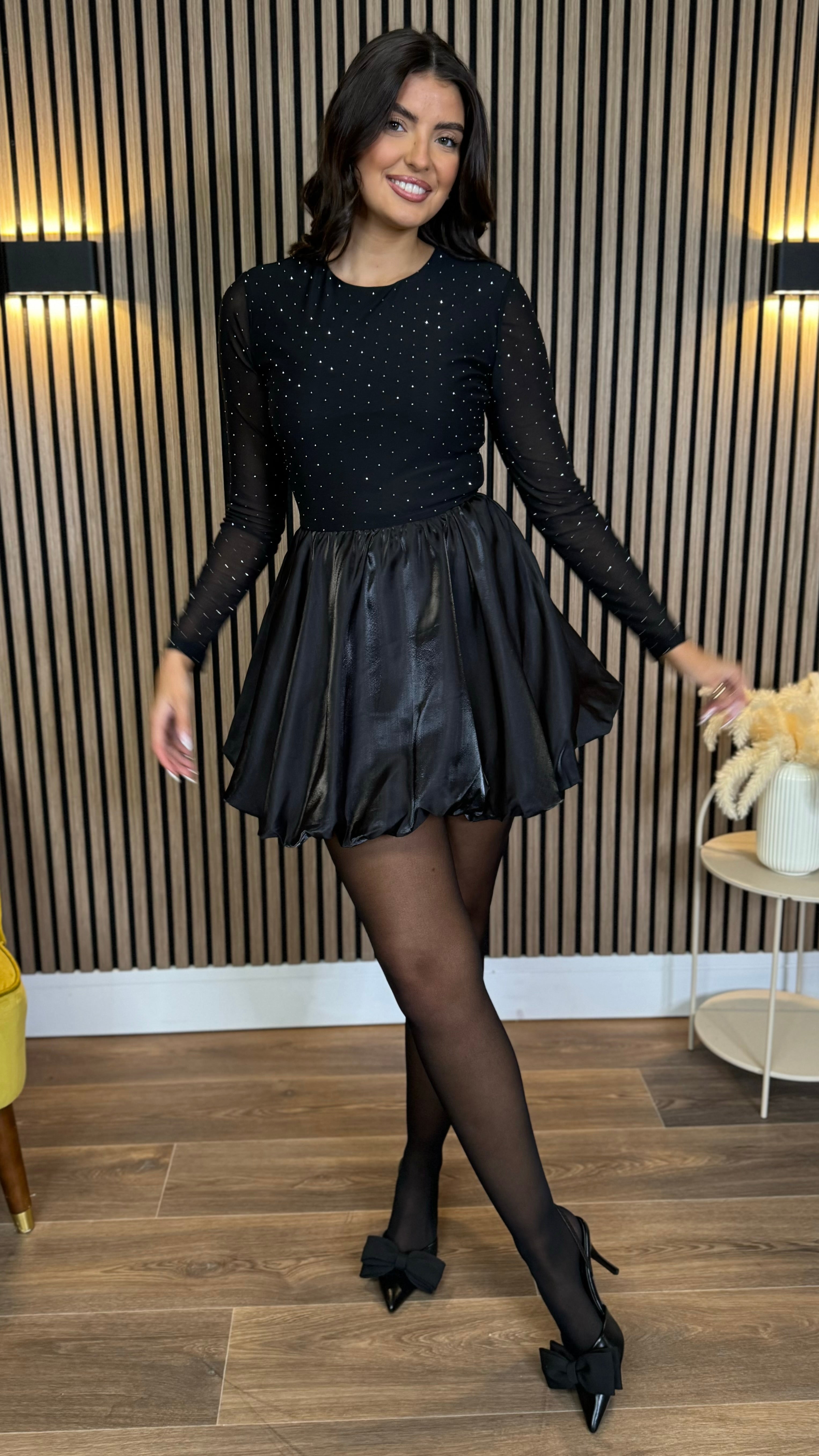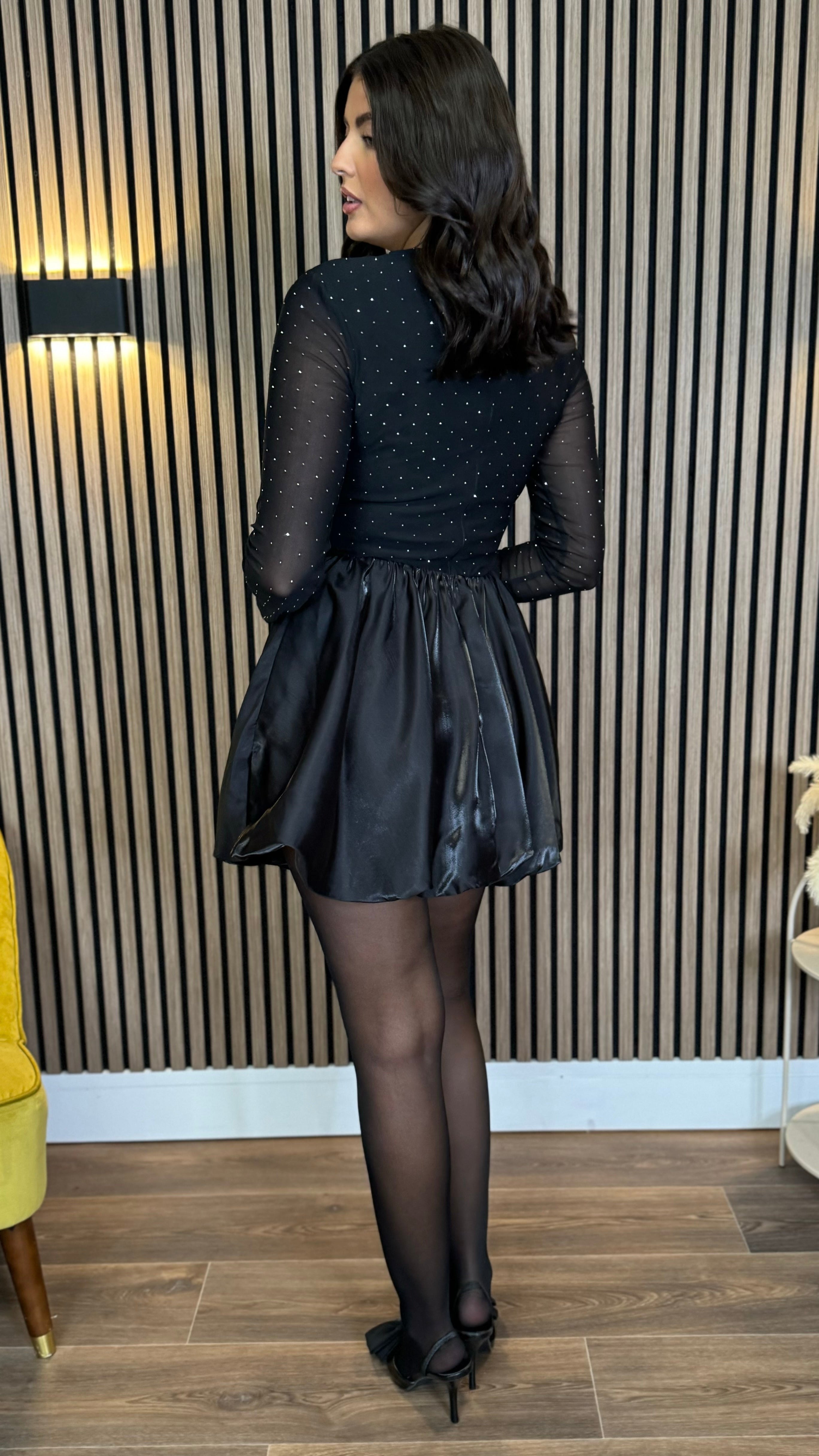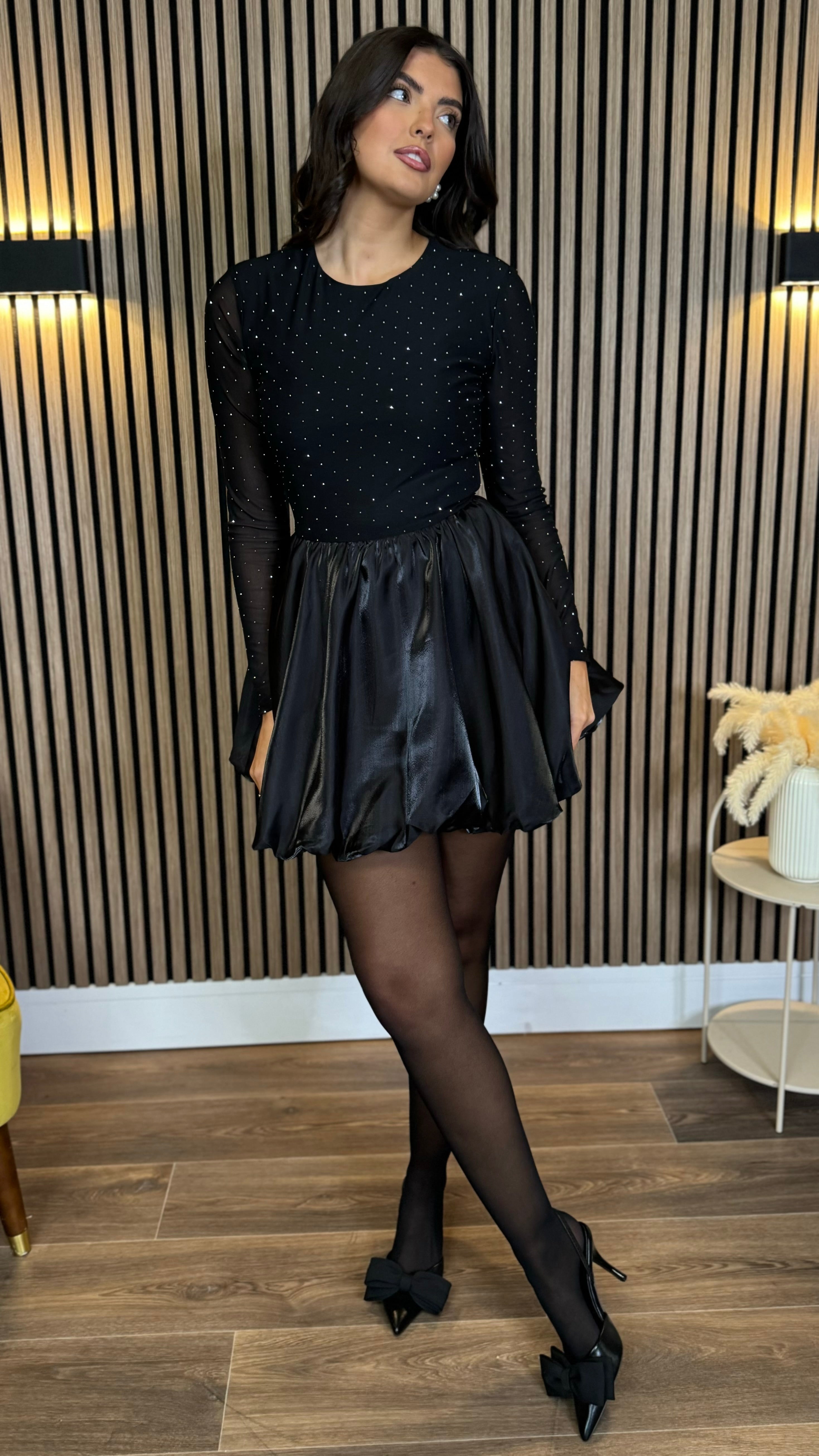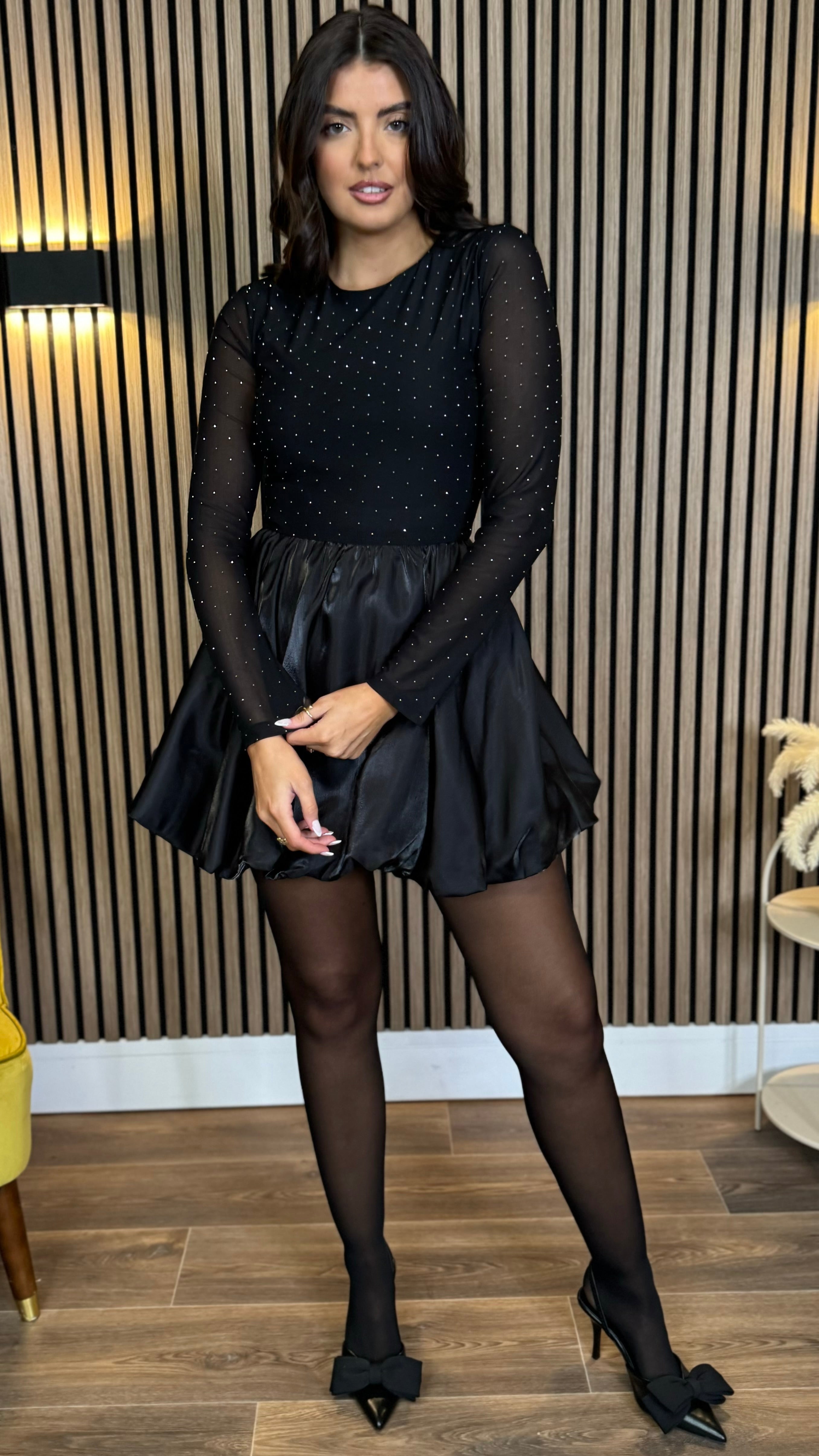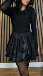 Kiersten Black Diamante Mesh Top Bubble Hem Mini Dress