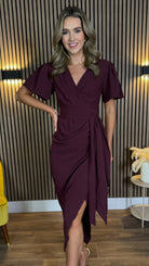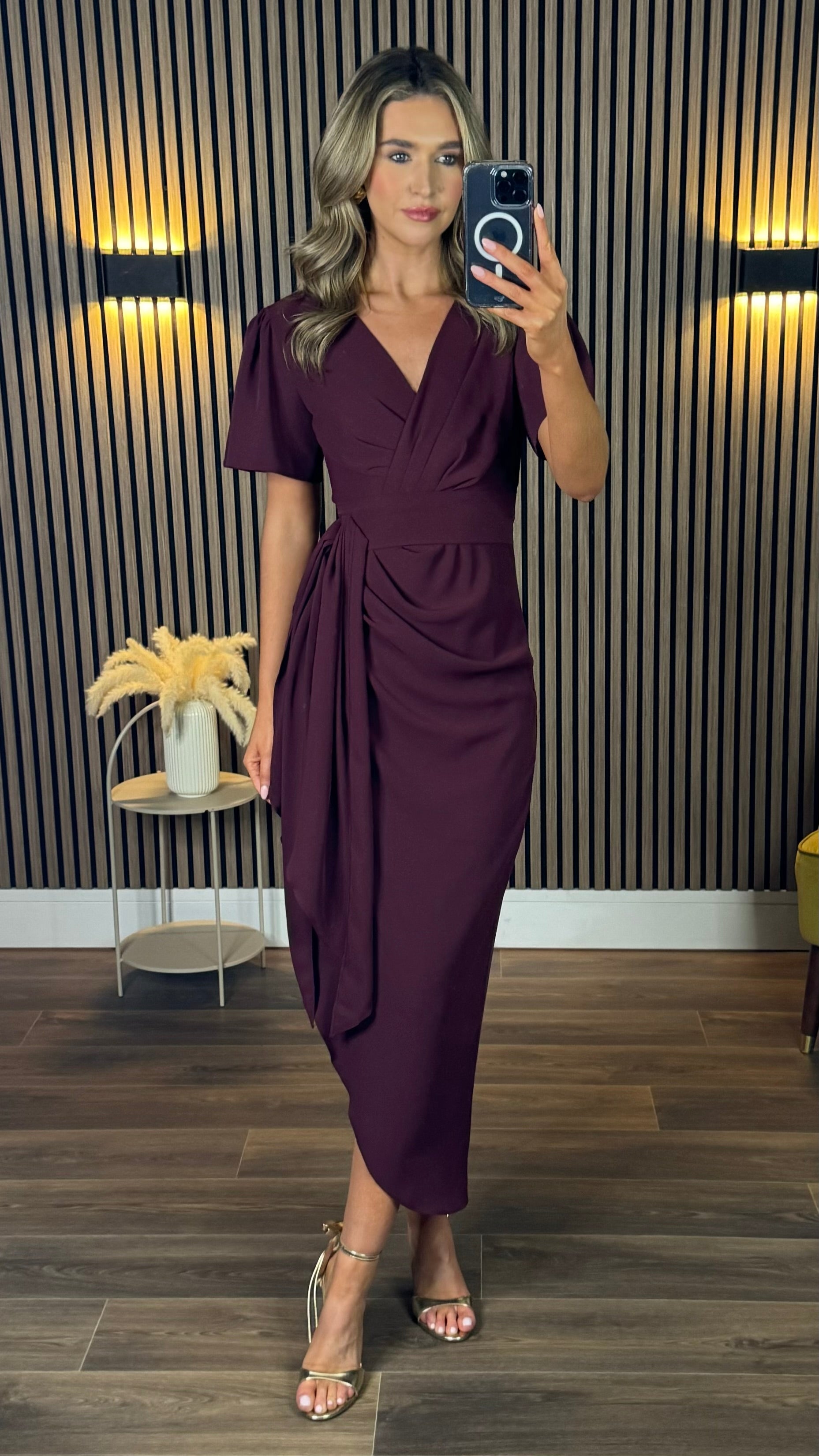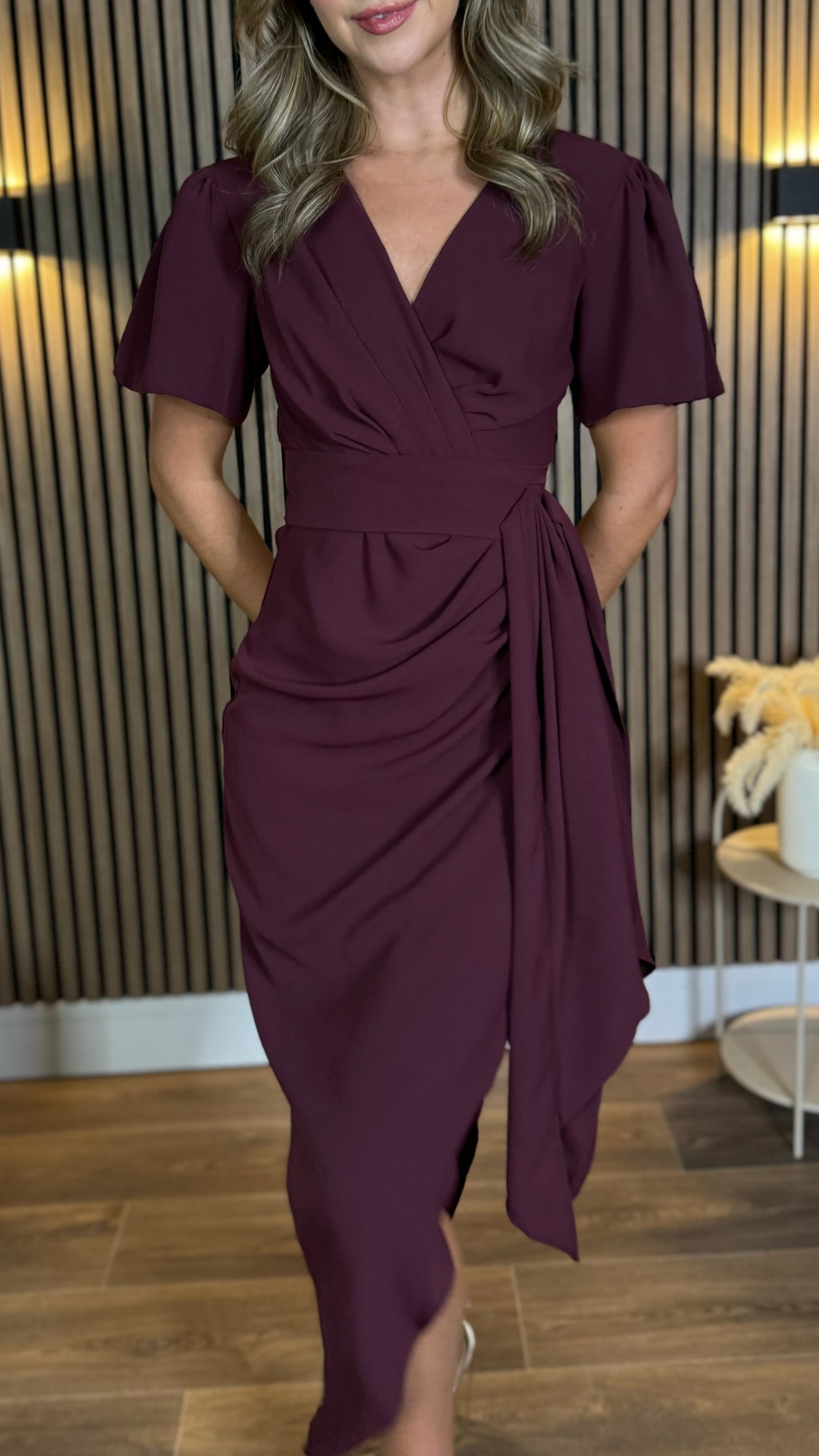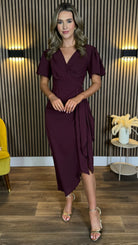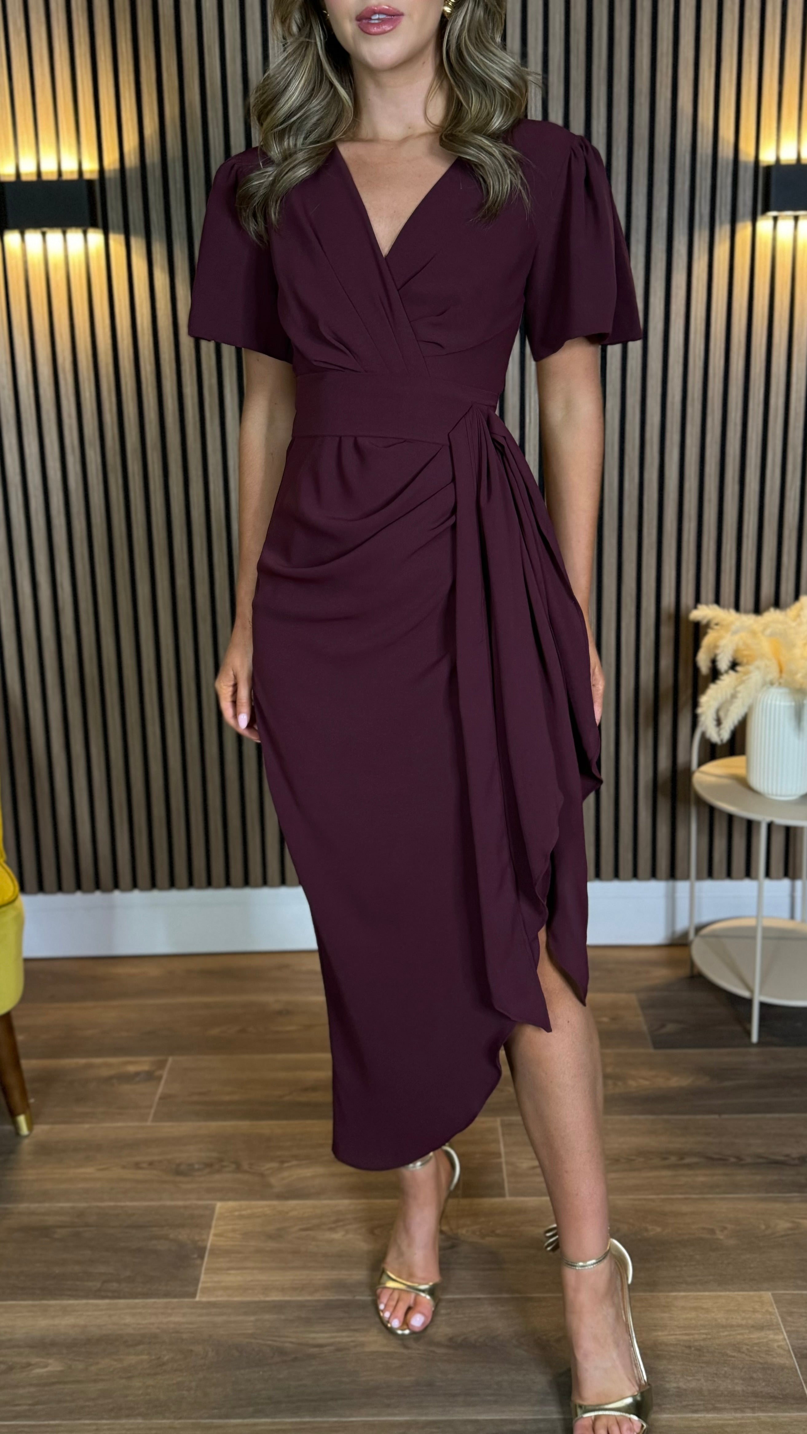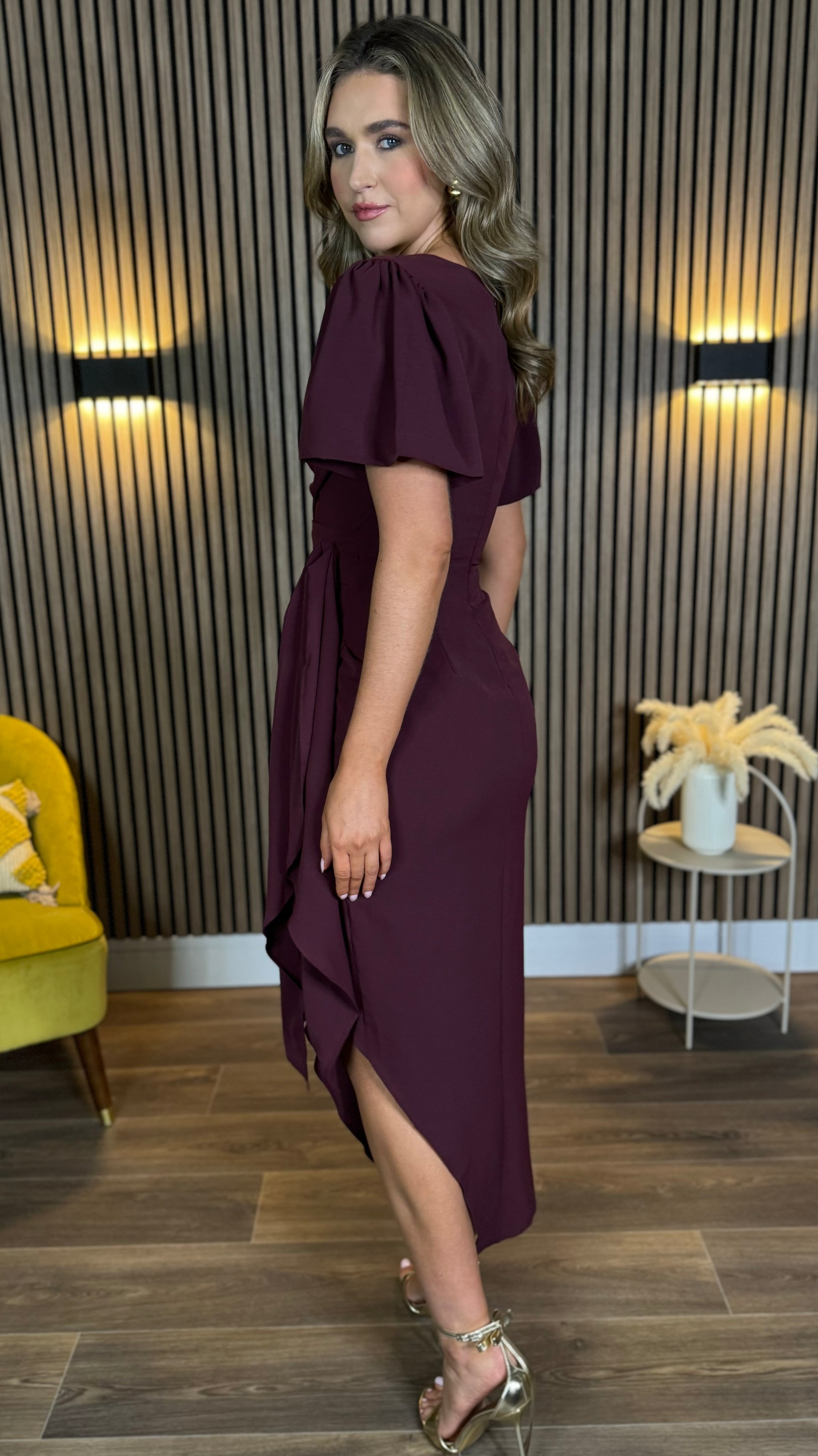 Odabelle Plum Puff Sleeve Wrap Front Midi Dress