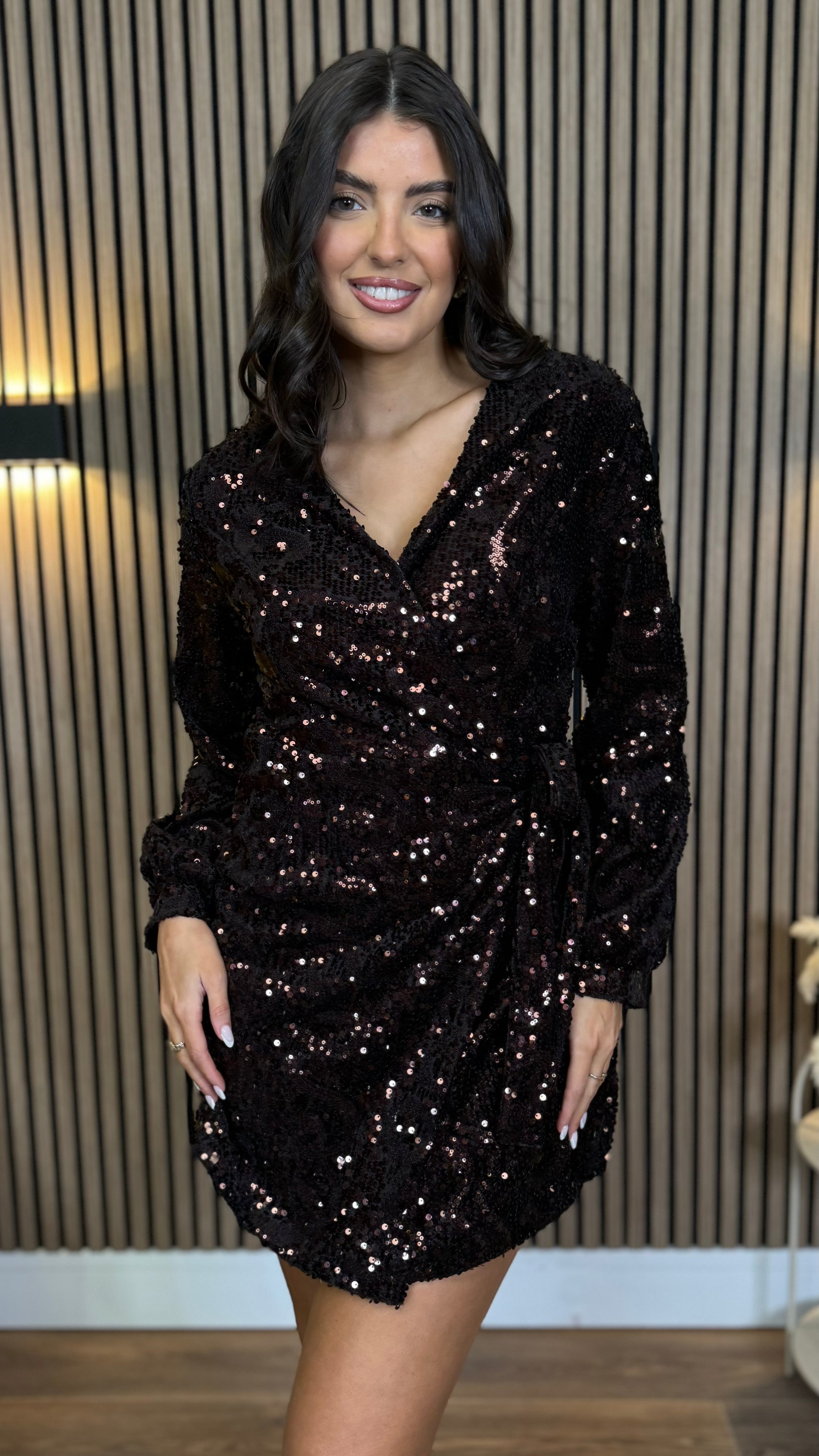 Steffi Chocolate Brown Sequin Wrap Mini Dress