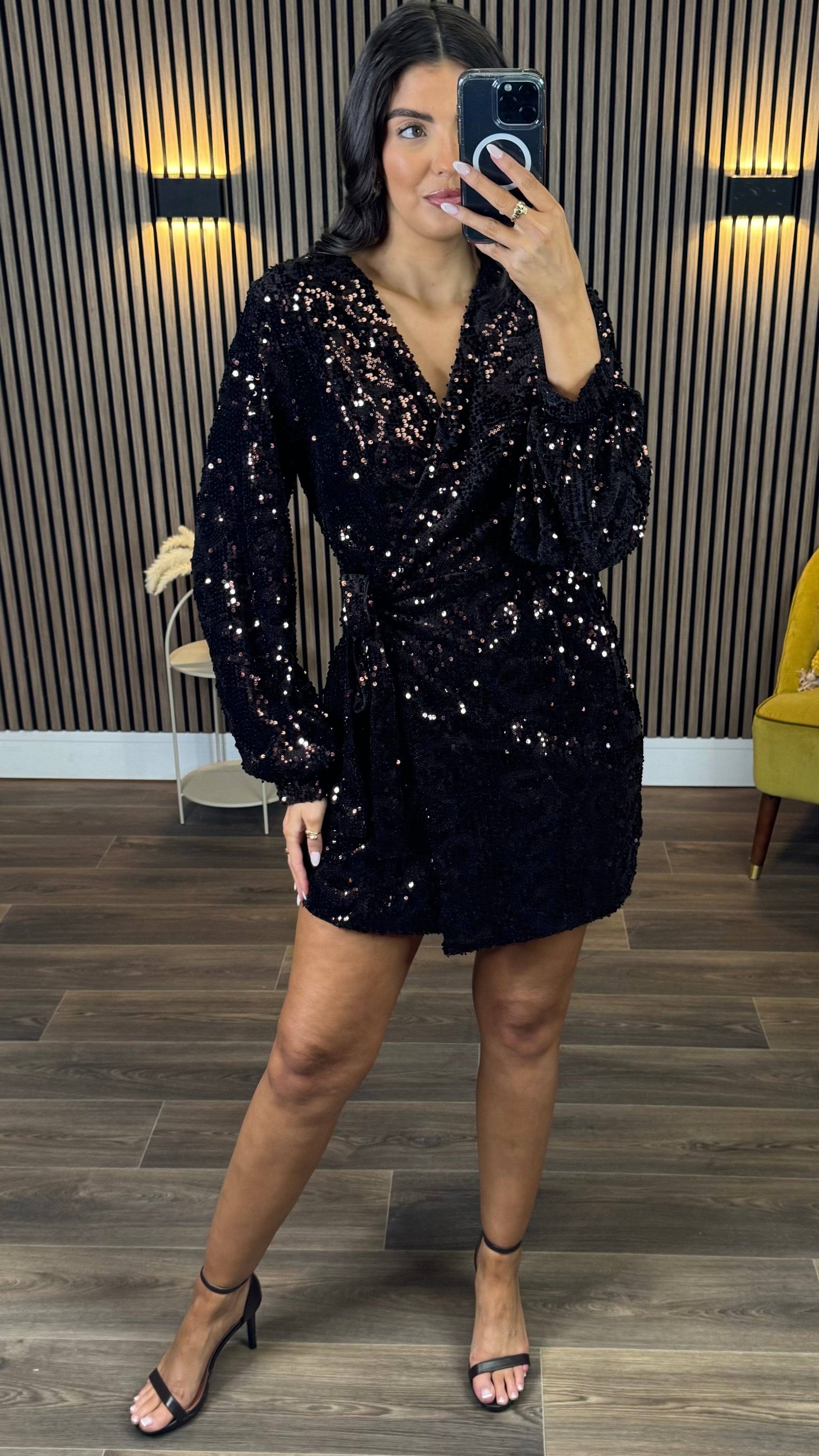 Steffi Chocolate Brown Sequin Wrap Mini Dress ✨ Turn heads in this show-stopping sequin wrap mini dress! 🤎 The rich chocolate brown hue pairs perfectly with eye-catching sequins that catch the light with every move. Featuring a flattering v-neckline, adjustable belt to cinch your waist, and long sleeves for a chic, polished look. Whether you're hitting the dance floor or stepping out for a night on the town, this dress delivers glamour and confidence in one stunning package. 💃