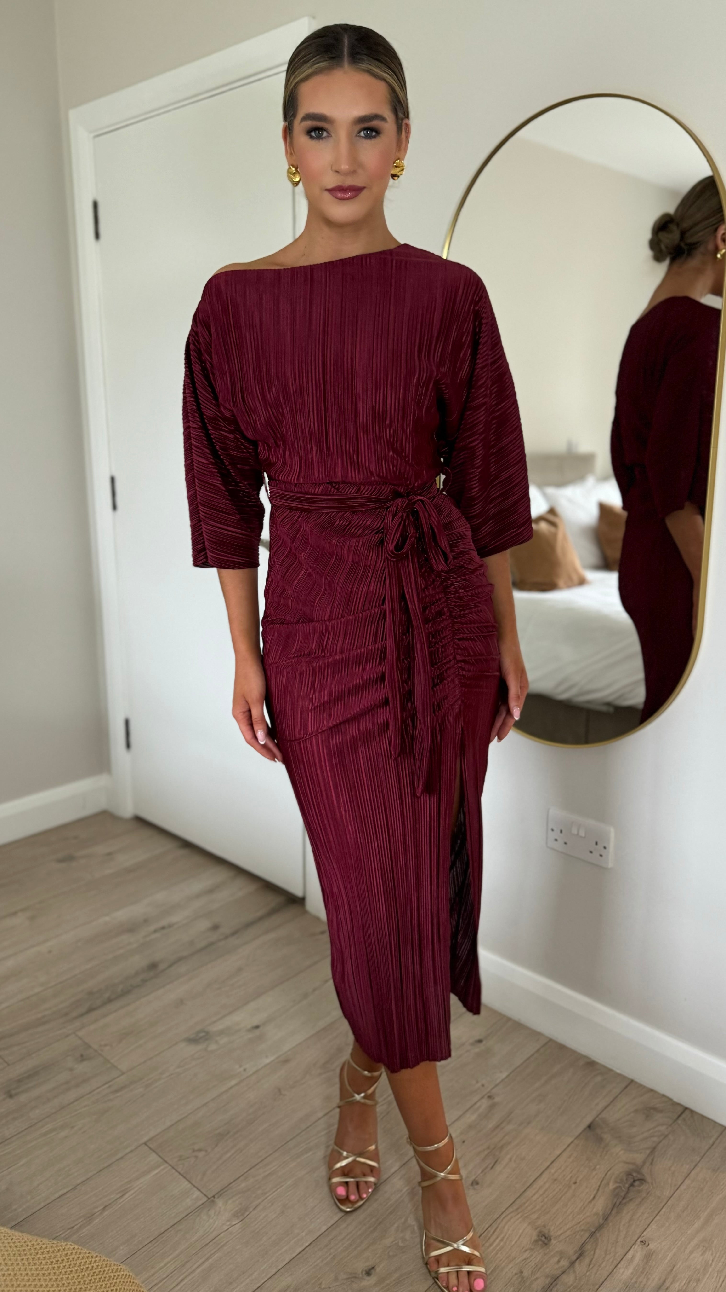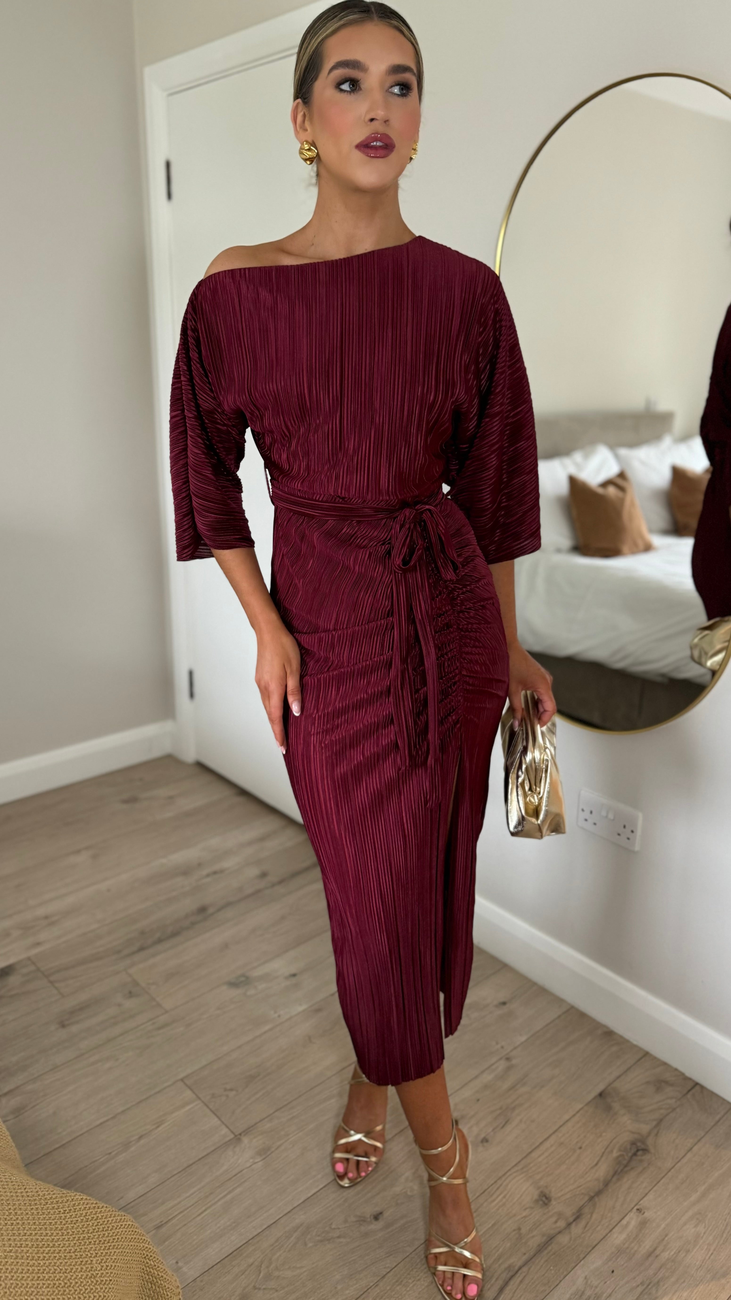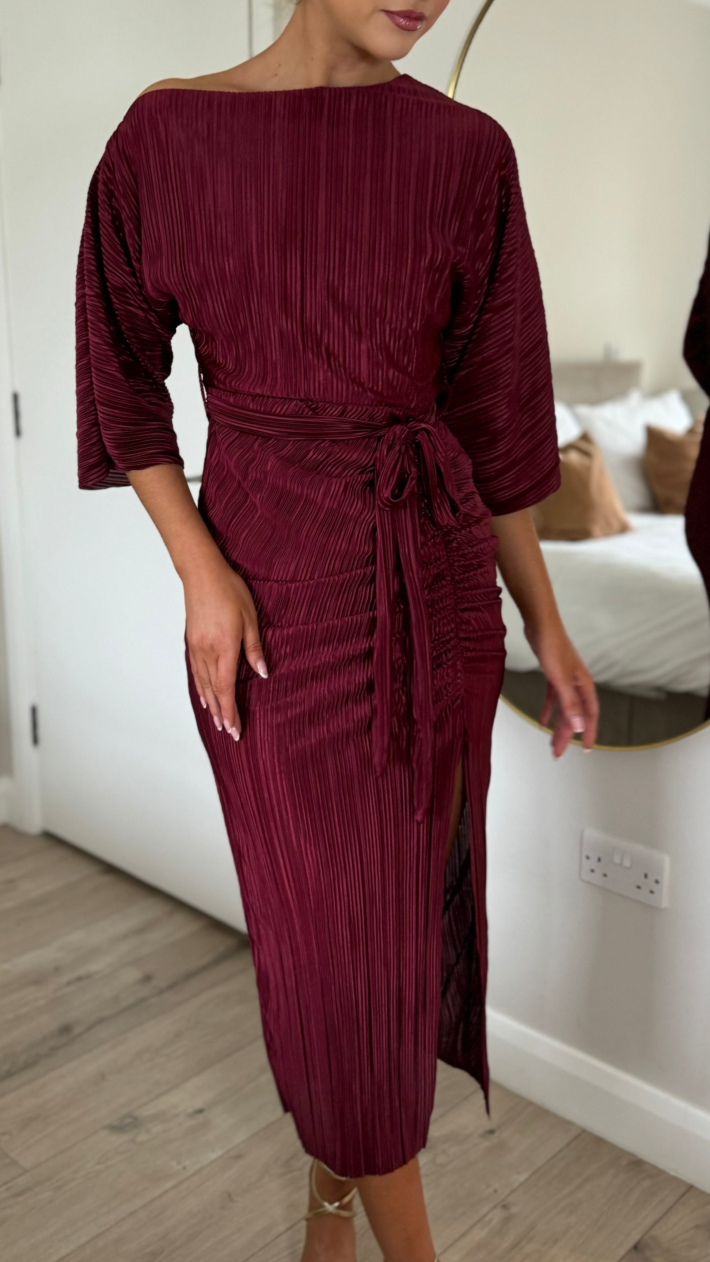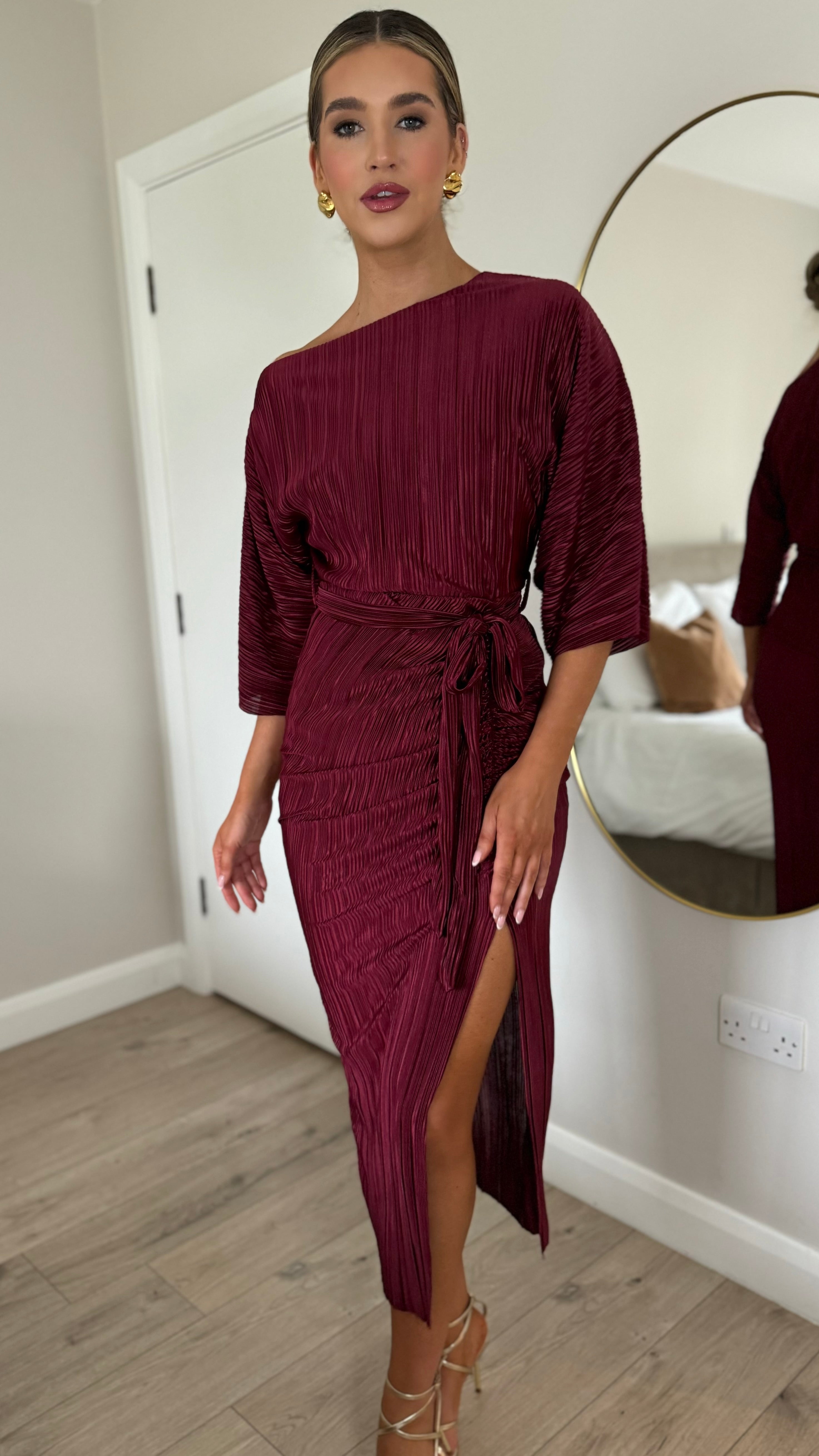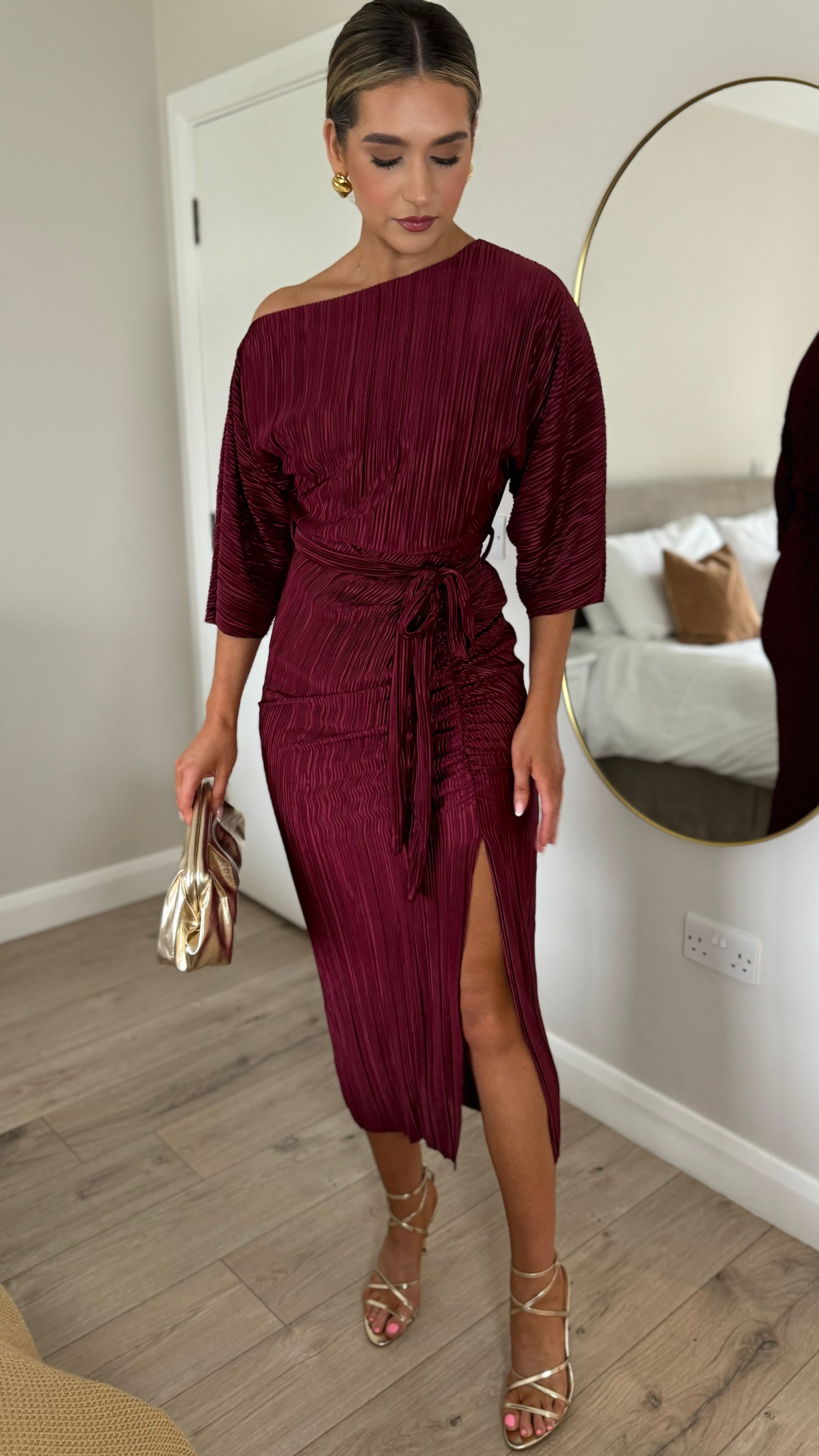 Slip into effortless elegance with this stunning burgundy off-shoulder dress. Crafted from luxuriously soft plissé fabric that drapes beautifully, it features a chic belted waist to define your silhouette and a flirty slit detail for movement and style. Whether you're dressing up for a night out or making a statement at an event, this dress delivers that perfect blend of glamour and comfort.
