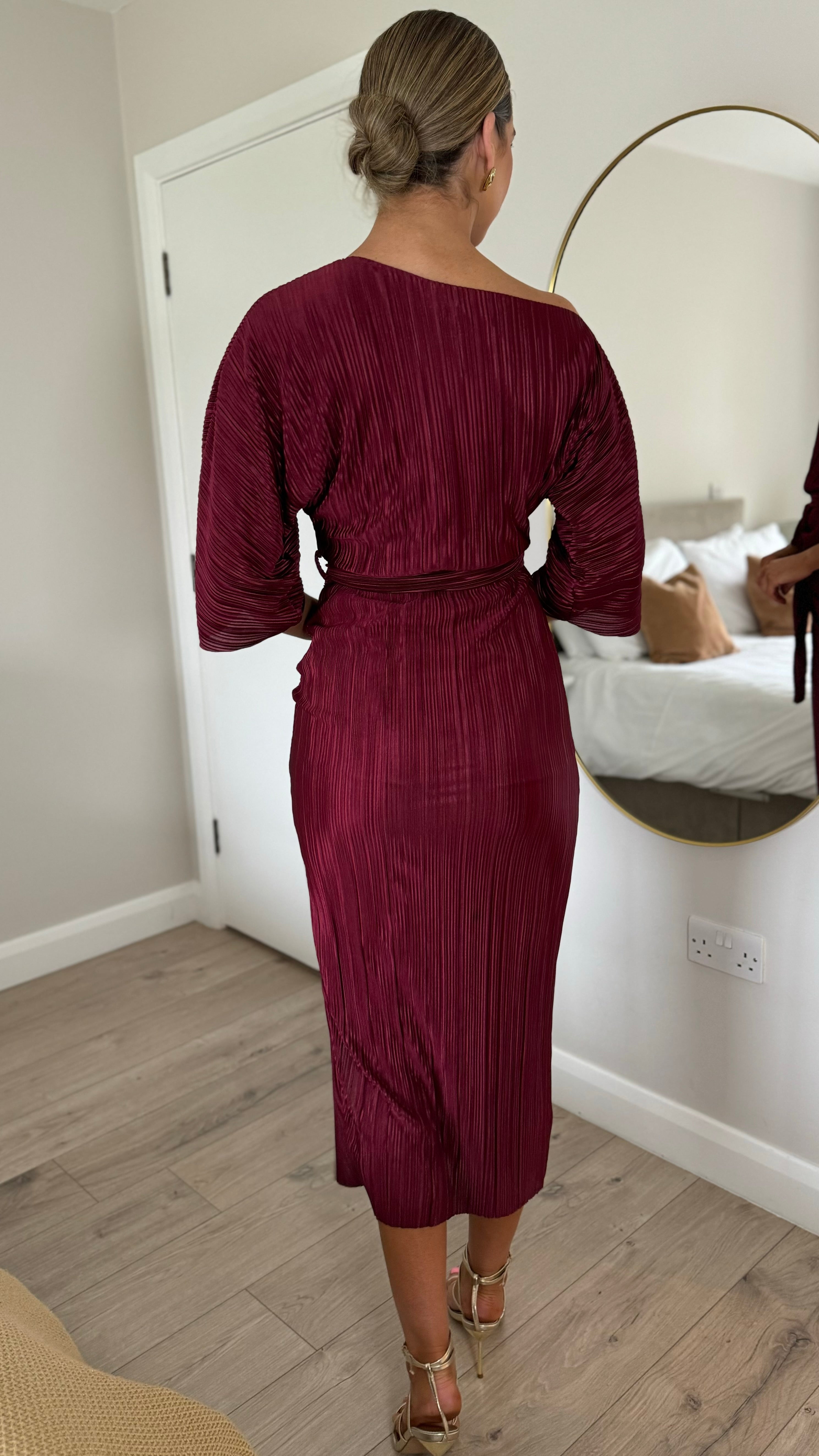 Unabelle Burgundy Plisse Off-Shoulder Dress (PRE ORDER)