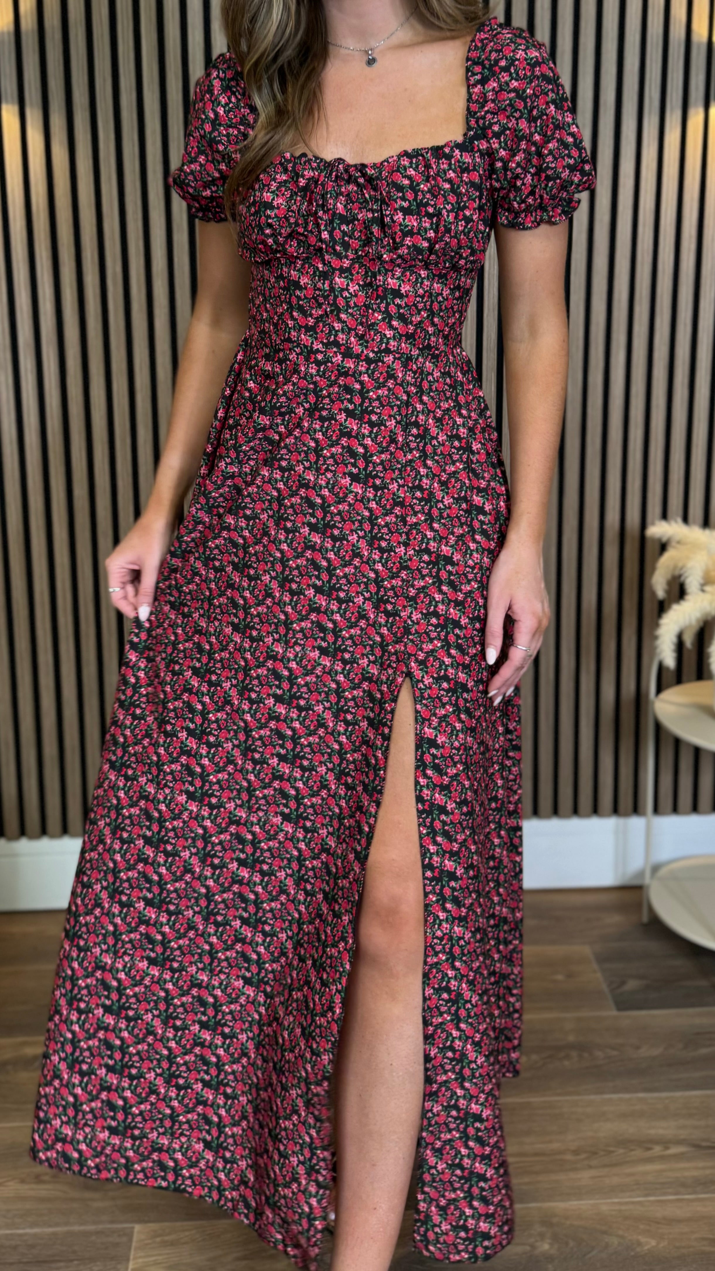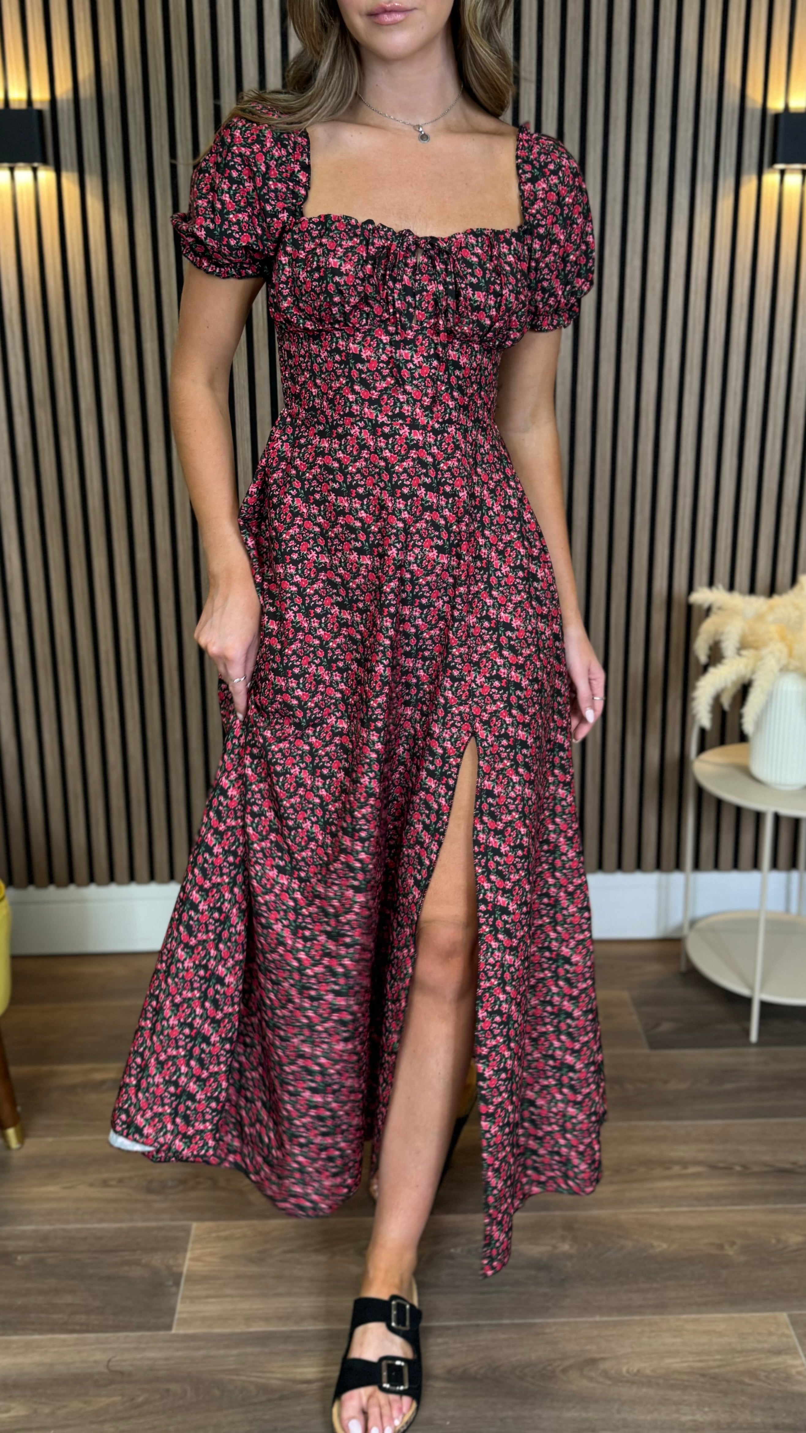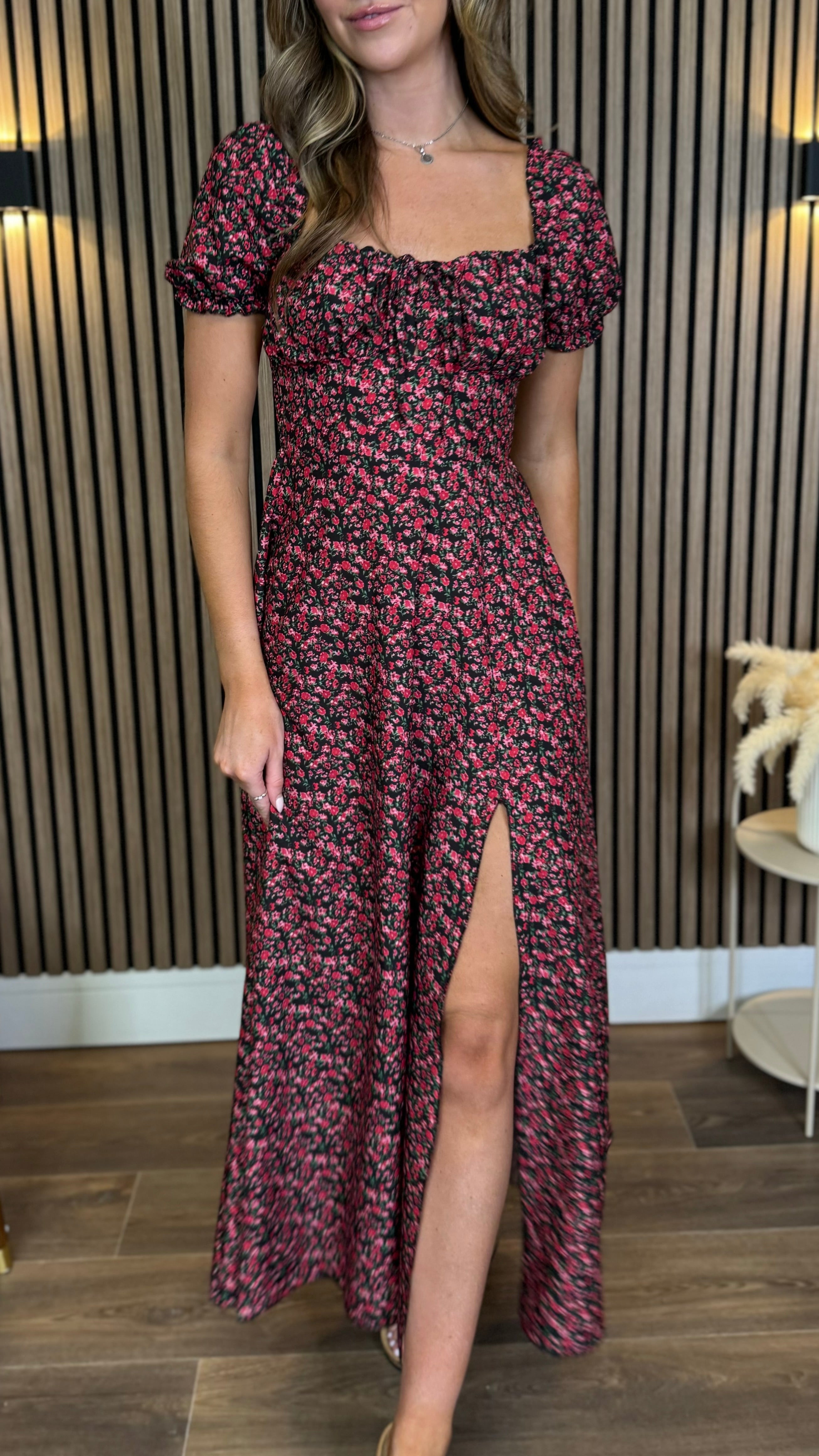 Alessia Black & Red Floral Milkmaid Midaxi Dress