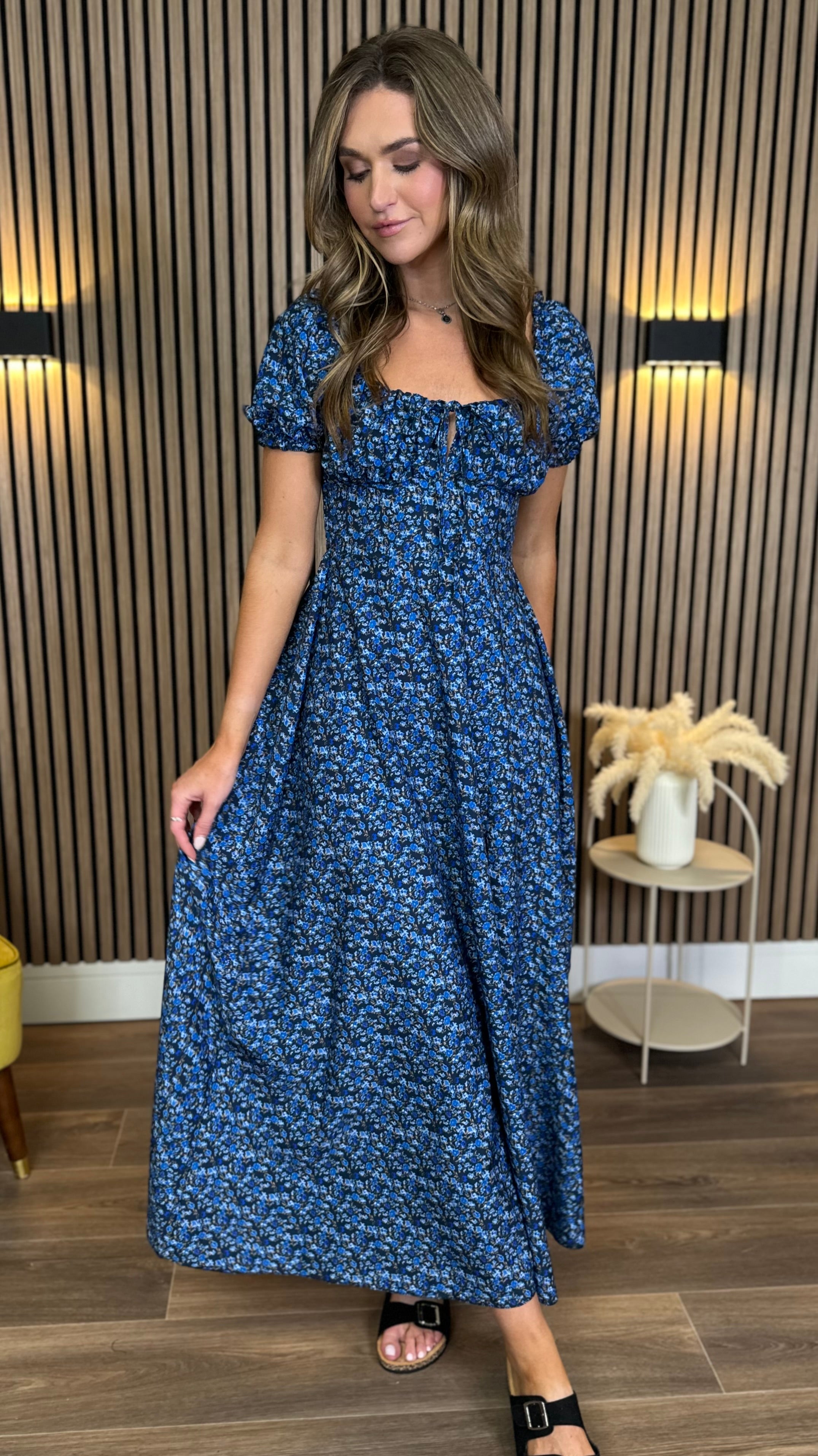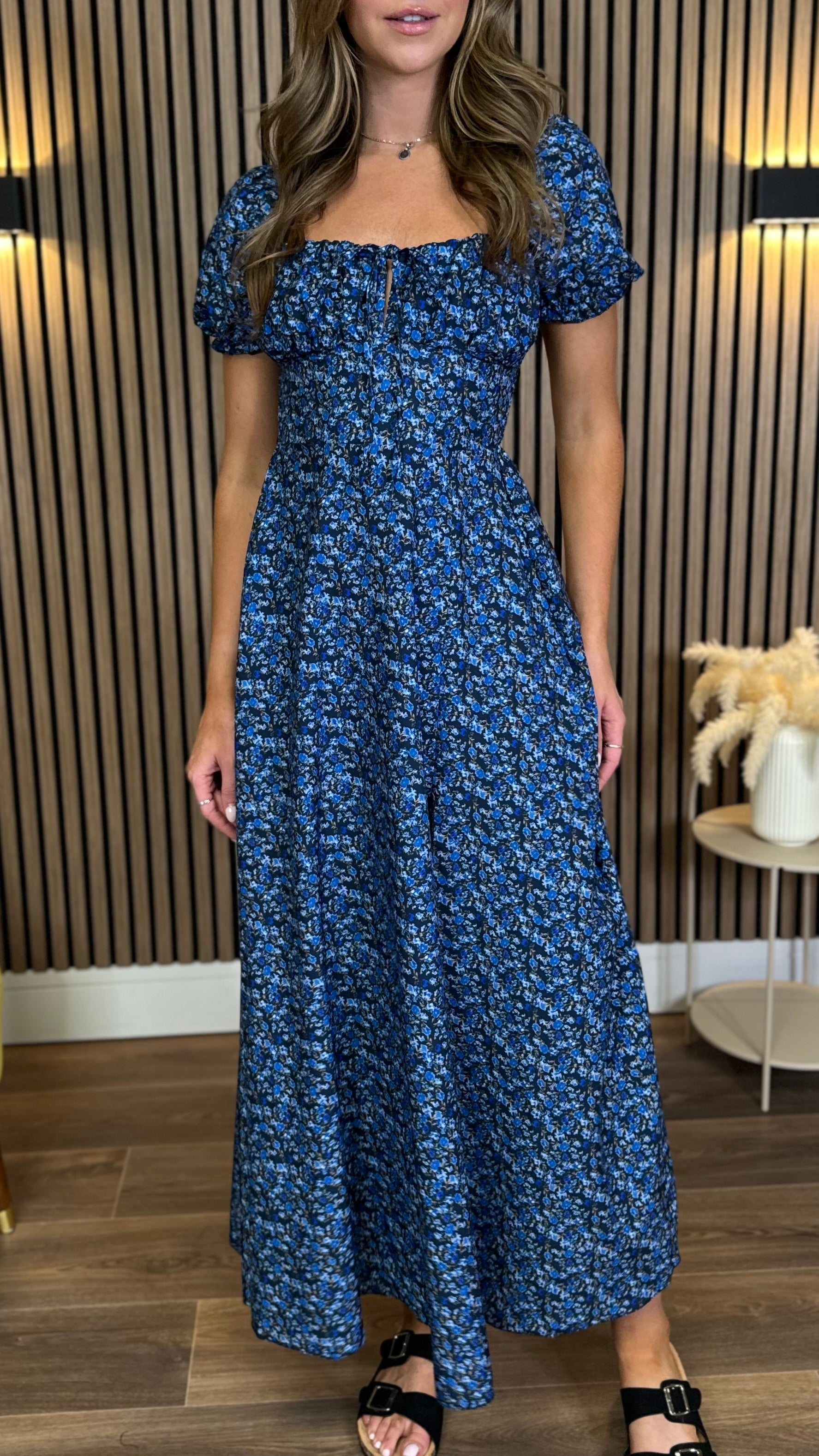 Alessia Dark Blue Floral Milkmaid Midaxi Dress