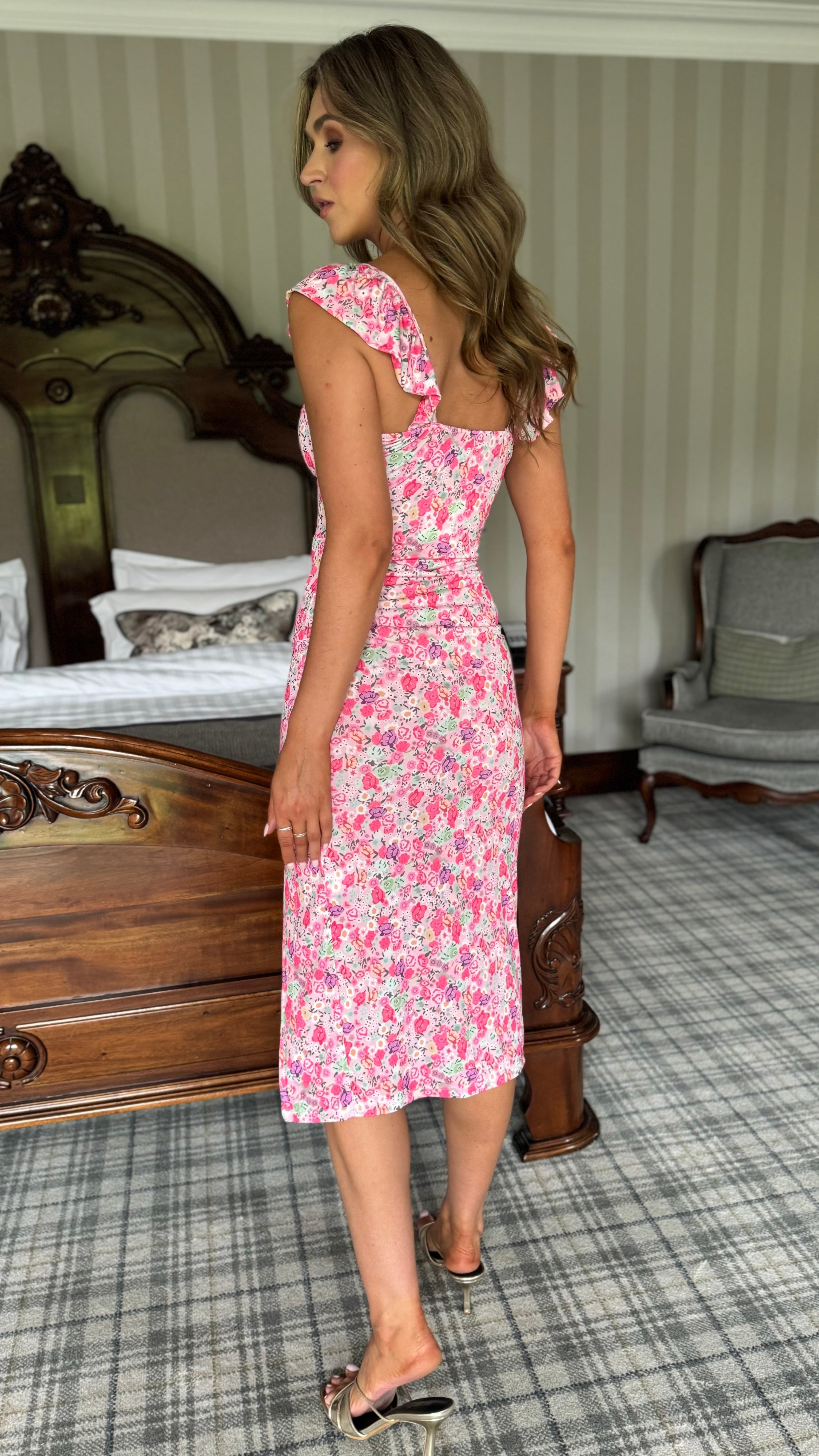 Alina Baby Pink Rose Detail Frill Sleeve Cupped Slit Midi Dress