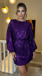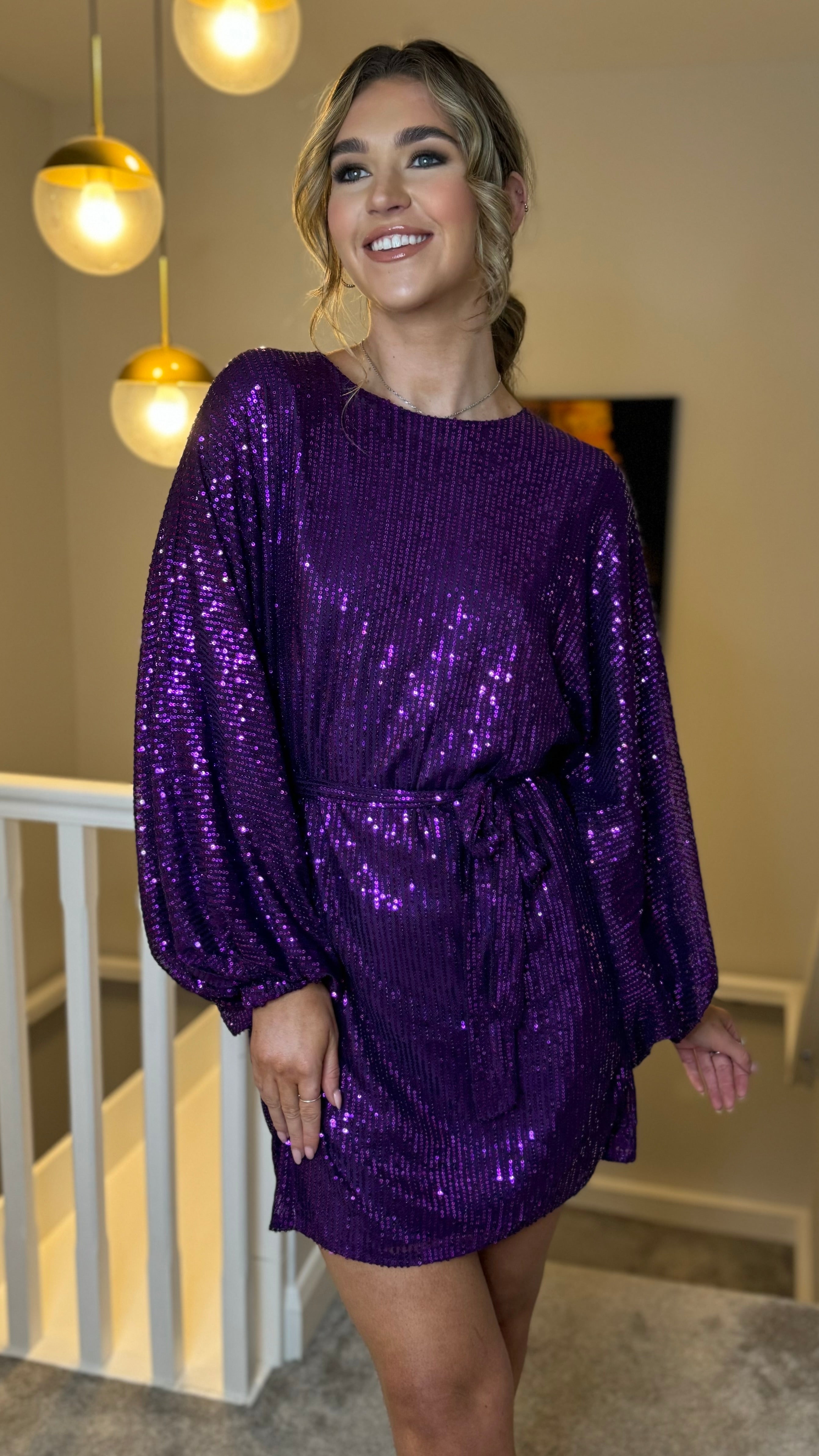 Get ready to shine in the Alyona Purple Sequin Wide Sleeve Mini Dress 😍 This mini dress features a round neckline, belted waist, and wide sleeves for a fun and flirty look. Show off your playful side with its eye-catching sequin design ✨ Perfect for a night out or special occasion, this dress will have you turning heads and feeling fabulous.