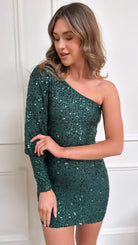 Amal Green Sequin One Shoulder Long Sleeve Mini Dress
